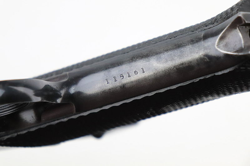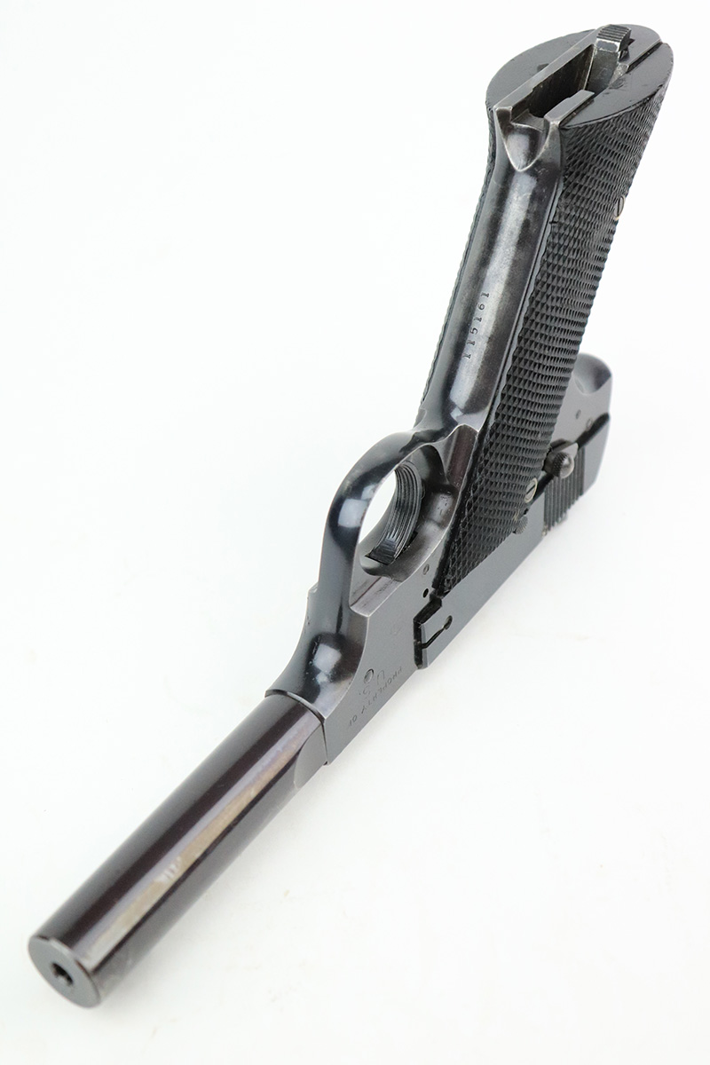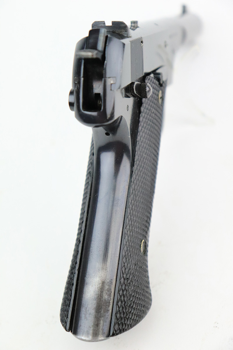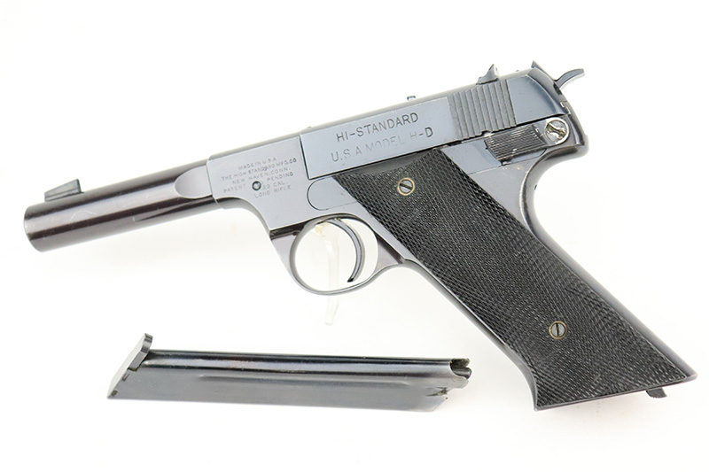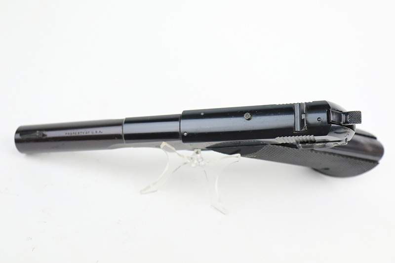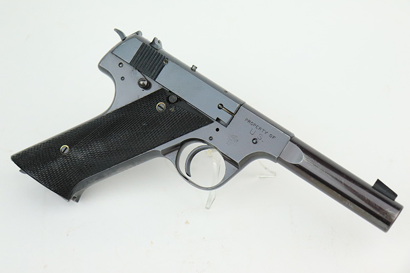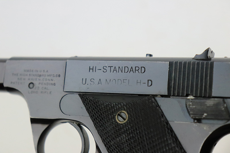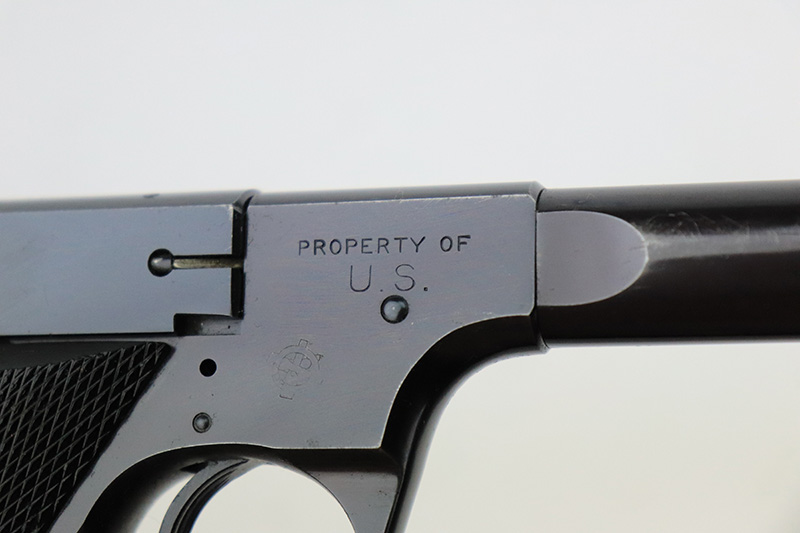 8/16/22 – This is an original High Standard Model H-D pistol that was issued to the U.S. Military in 1943. A total of ~32,000 Model H-D pistols were procured by the military from 1943-45. This one is marked PROPERTY OF U.S. on the right side of the frame, and has ordnance cannons marking as well. The original, high-polish blue rates at about 92% with scratchy wear along the barrel and some spotty wear on both grip straps. Minor pin-pricking on the front strap. The screw on the left side of the frame is a little buggered-up. Comes with nice period-correct bakelite grips (a couple of small blemishes on the bottom) and one proper magazine. Minty bore.