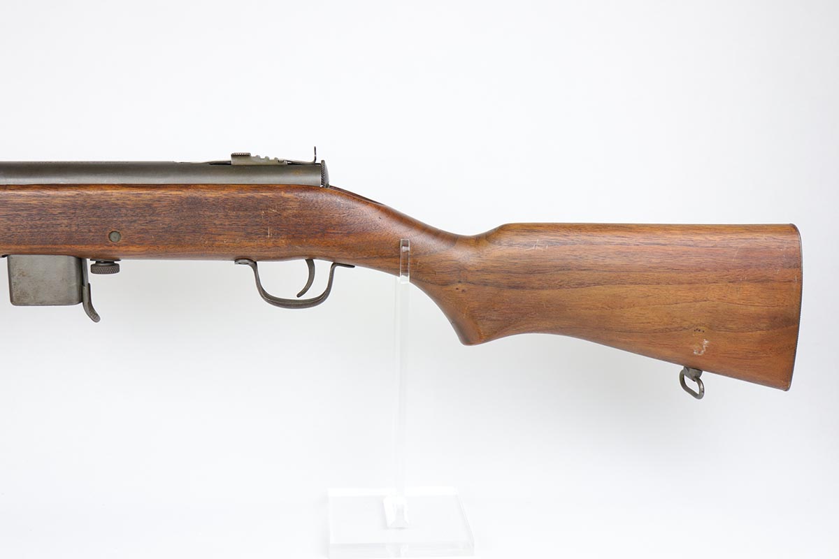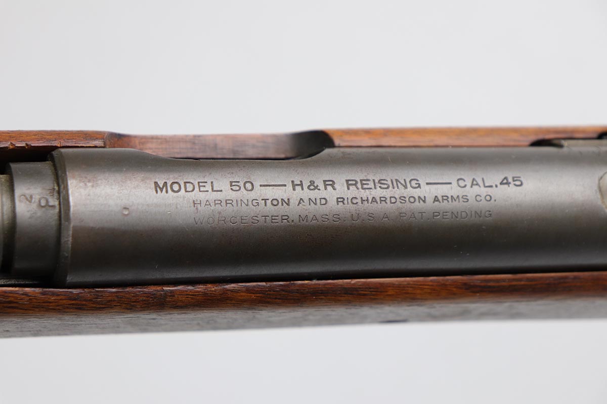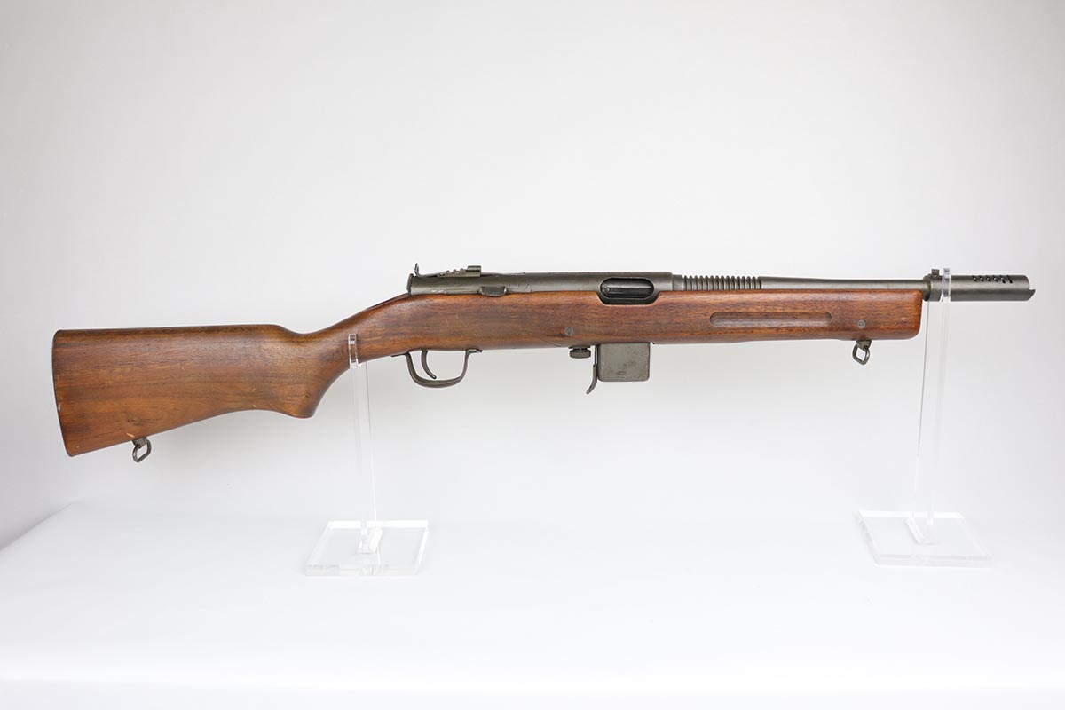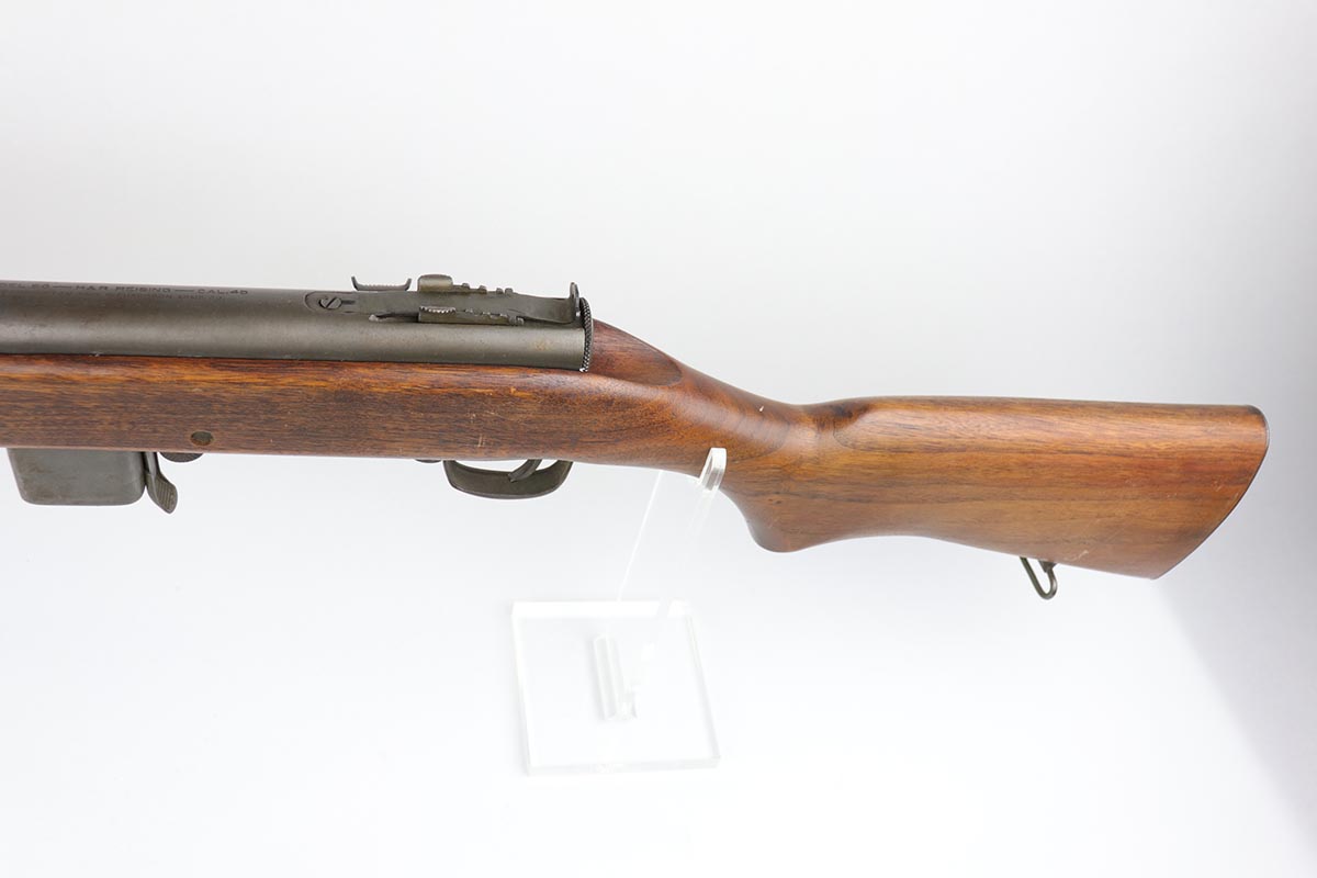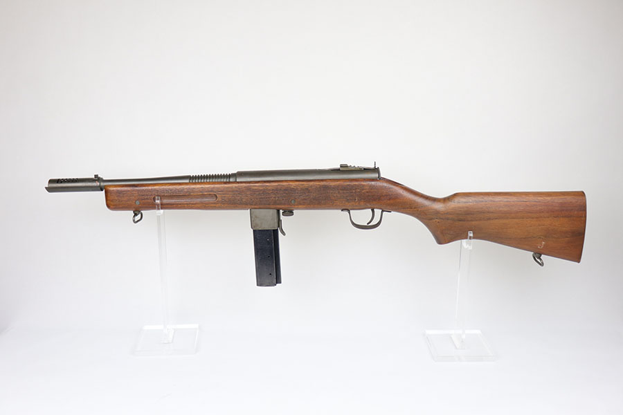 2/13/20 – This is an original and fully transferable H&R Reising M50 submachine gun with desirable phosphate finish. The Reising M-50 was notably issued to Marines in the Pacific Theater during WWII as an alternative to the Thompson sub-machine gun which was in short supply. Although not well received by the Marines, these guns were also supplied to various police departments and utilized for decades after WWII. They have gained in popularity over the years with recreational shooting enthusiasts as a well made, relatively inexpensive entry level machine gun which utilizes readily available ammunition. This particular example shows minimal finish loss overall, with a few scuffs and a couple spots of paint on the muzzle/compensator. The parkerized finish likely indicates that this is military example, as commercial models were typically blued. Military models also typically have a three hole trigger guard and markings such as PM2 over the chamber, which this rifle does. Terrific stock is without defect. Strong, shiny bore. NOTE: The rifle is photoed without magazine but does include an original magazine.