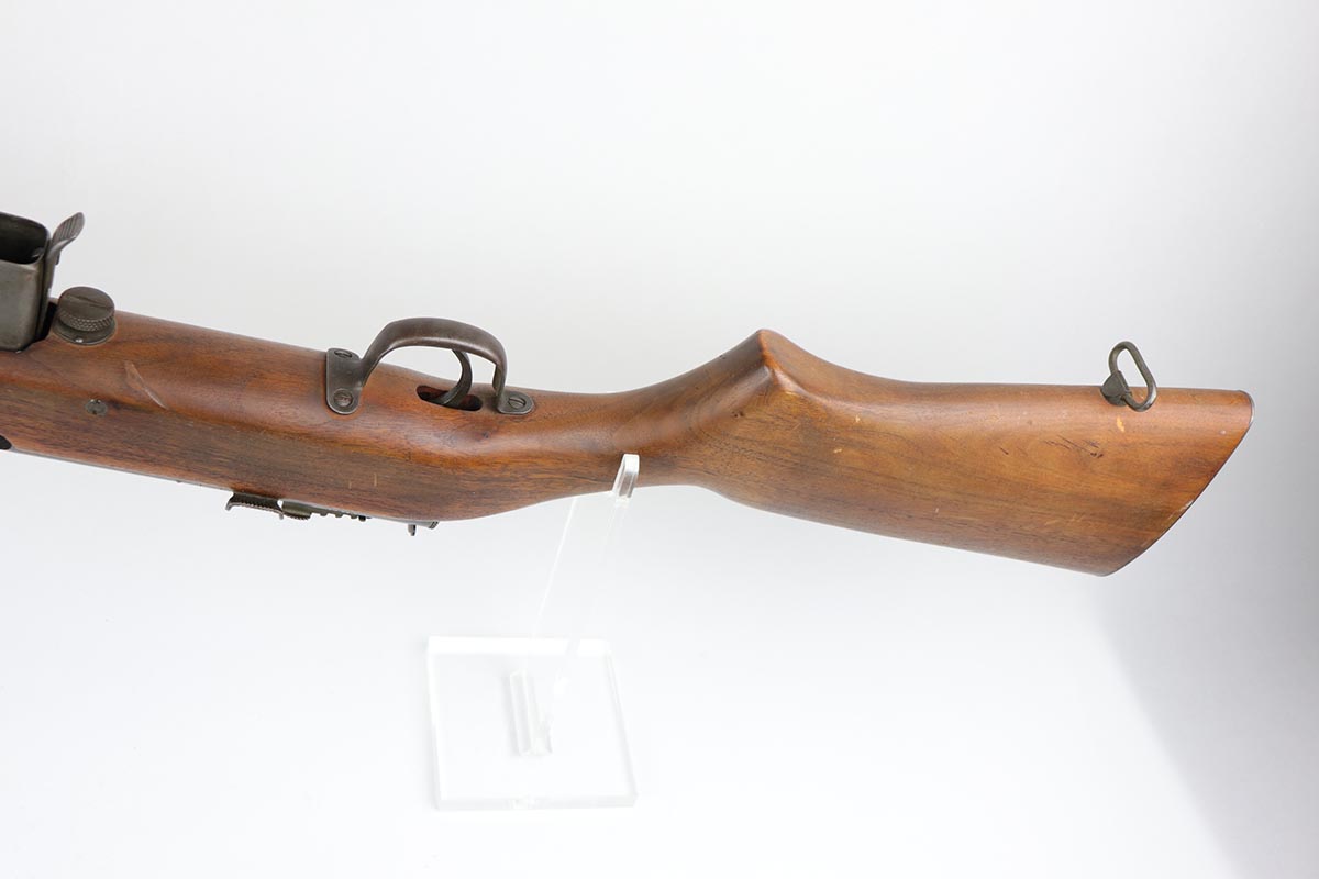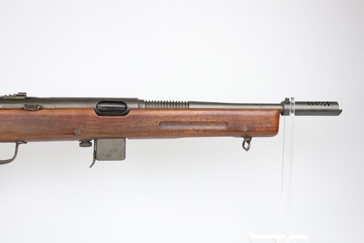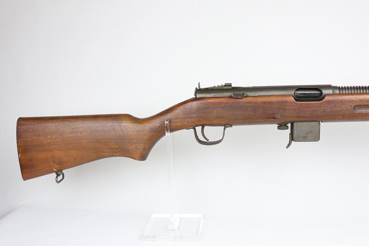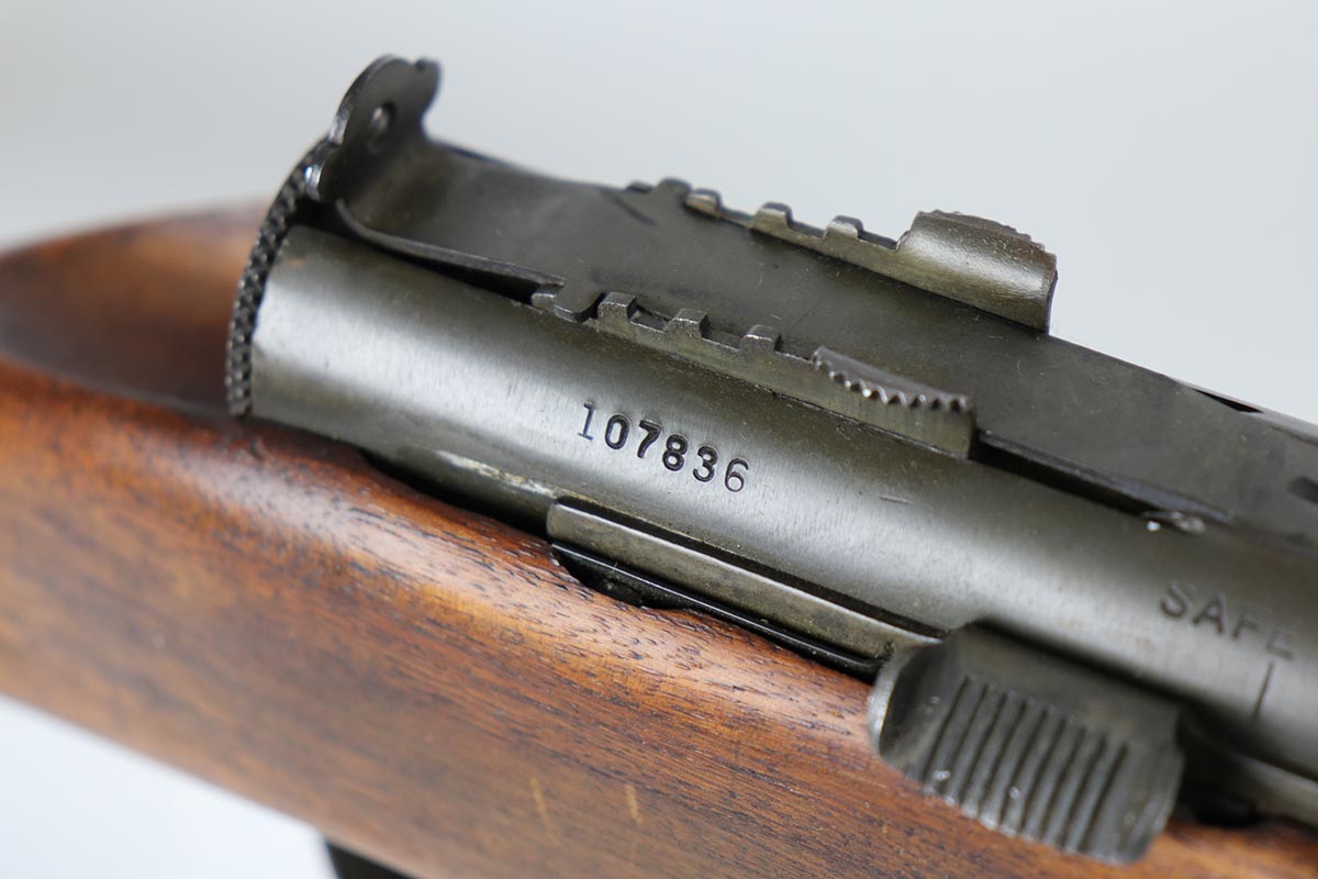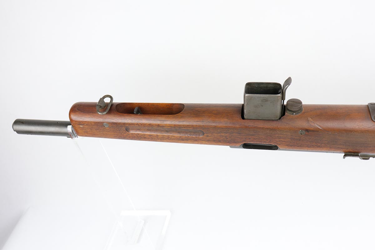 2/13/20 – This is an original and fully transferable H&R Reising M50 submachine gun with desirable phosphate finish. The Reising M-50 was notably issued to Marines in the Pacific Theater during WWII as an alternative to the Thompson sub-machine gun which was in short supply. Although not well received by the Marines, these guns were also supplied to various police departments and utilized for decades after WWII. They have gained in popularity over the years with recreational shooting enthusiasts as a well made, relatively inexpensive entry level machine gun which utilizes readily available ammunition. This particular example shows minimal finish loss overall, with a few scuffs and a couple spots of paint on the muzzle/compensator. The parkerized finish likely indicates that this is military example, as commercial models were typically blued. Military models also typically have a three hole trigger guard and markings such as PM2 over the chamber, which this rifle does. Terrific stock is without defect. Strong, shiny bore. NOTE: The rifle is photoed without magazine but does include an original magazine.