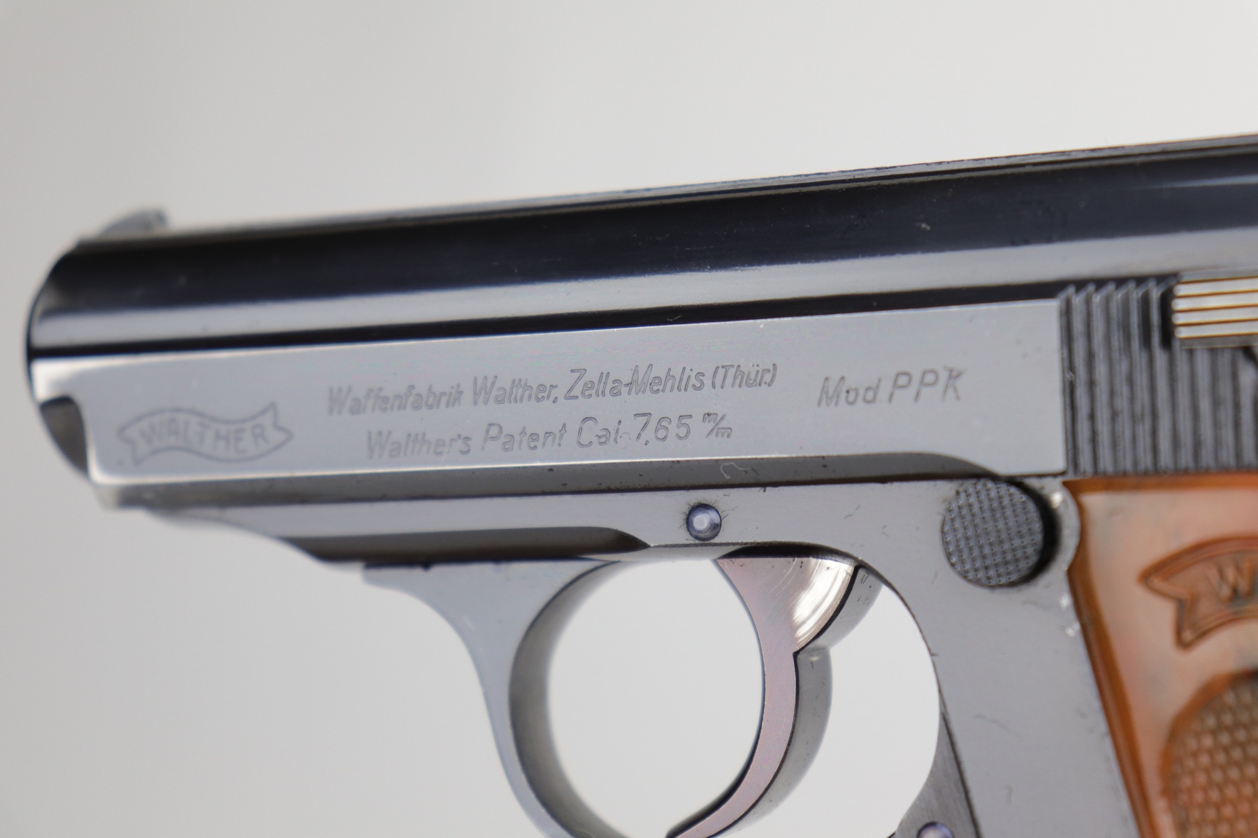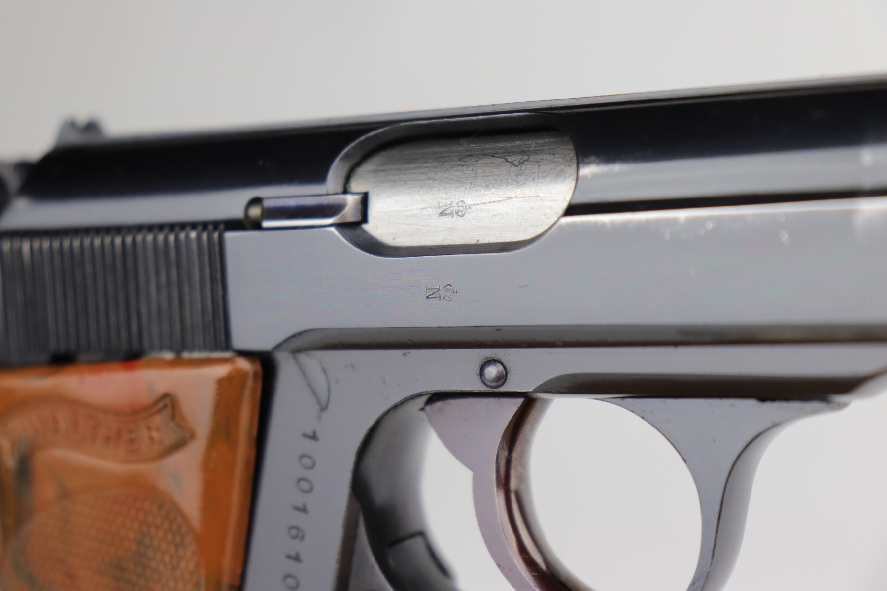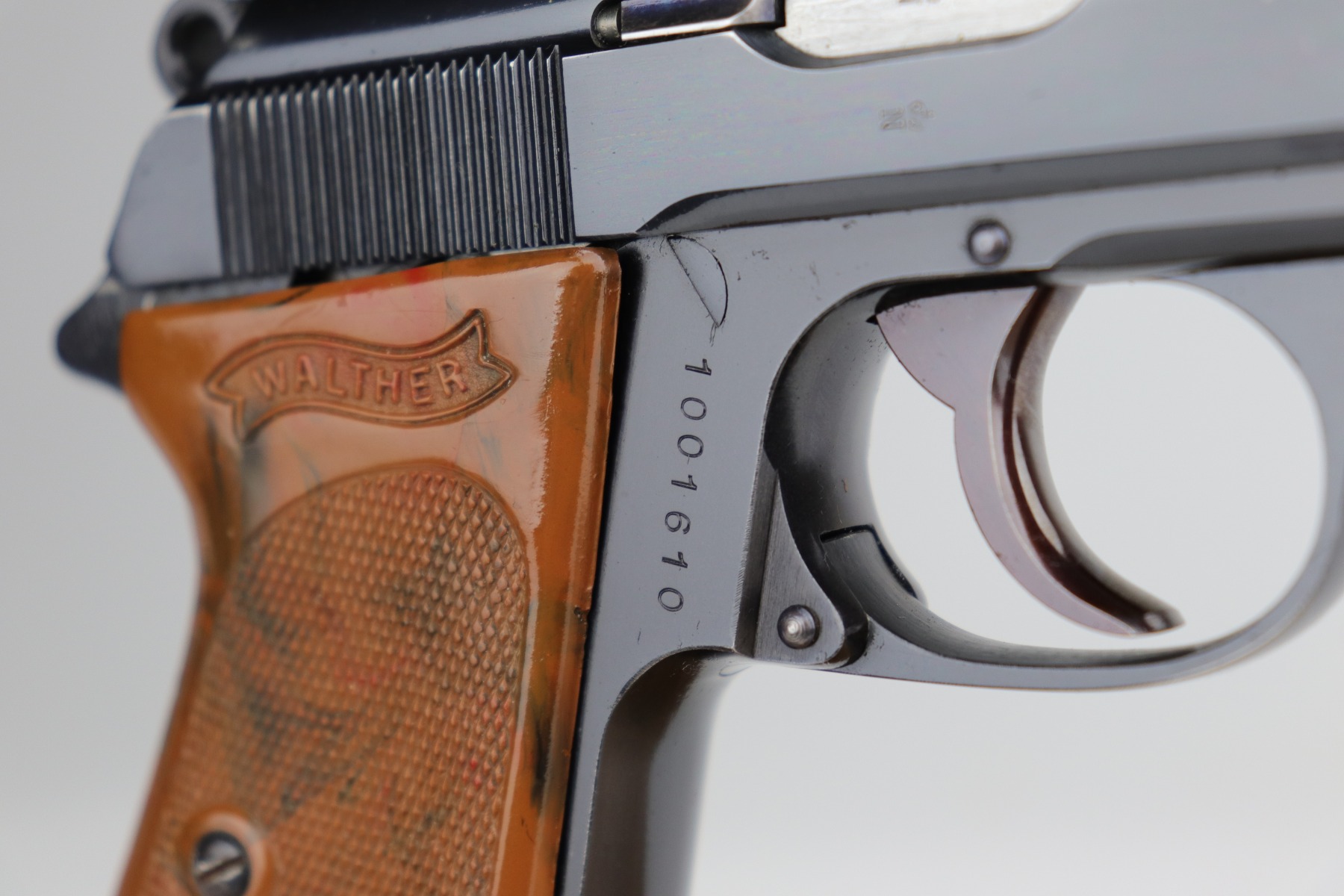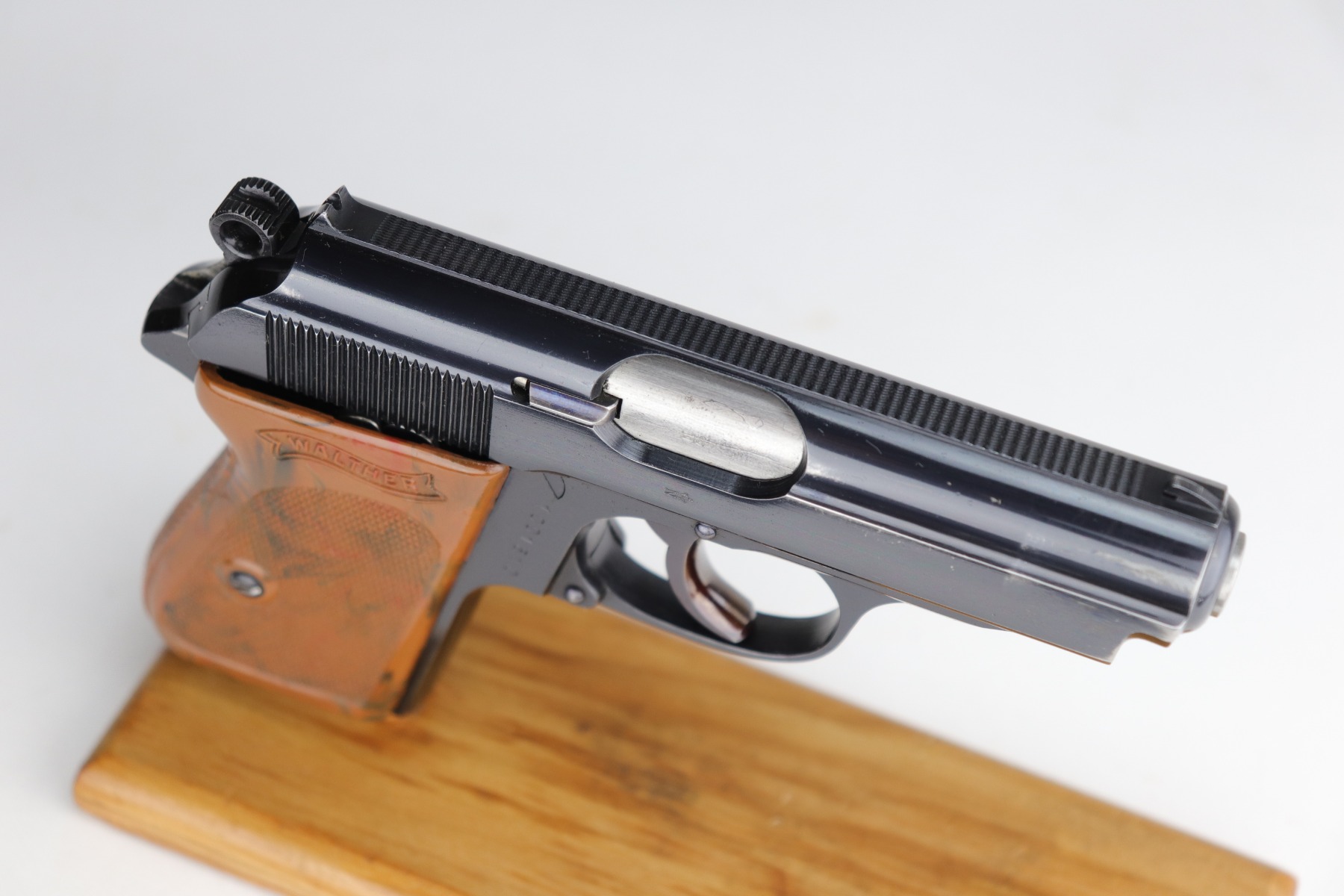 10/30/20 – This is an excellent example of a “Million Series” Walther PPK manufactured in 1938. It comes with the original capture paperwork with the name of the veteran who brought it back. The gun is all matching and has the proper “Crown N” proofs. It is in excellent condition, retaining about 97-98% of its original bluing. The fire blue on the safety lever is mostly in tact. There is minor wear around the muzzle and a few spots of wear on the right side of the slide. A few very minor dings here and there. It comes with a minty brown grip and a brown finger extension magazine. The bore is minty – shiny with strong rifling.