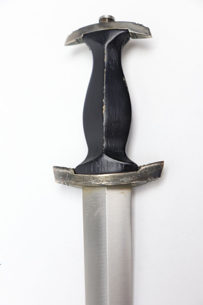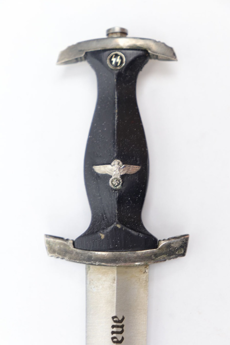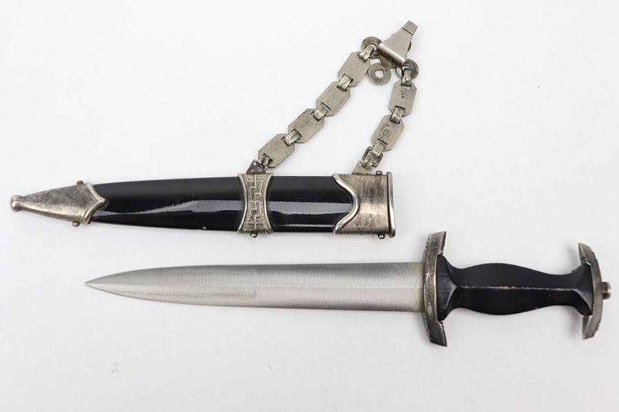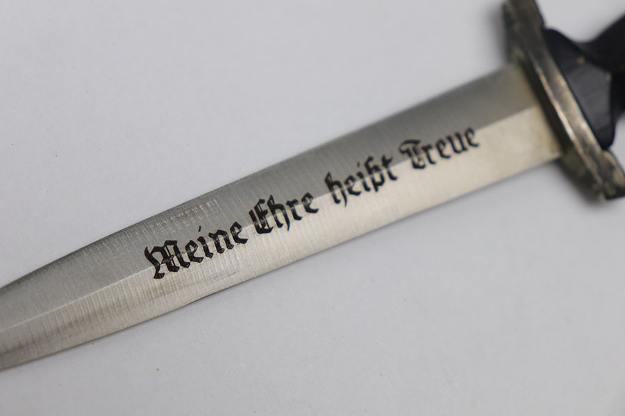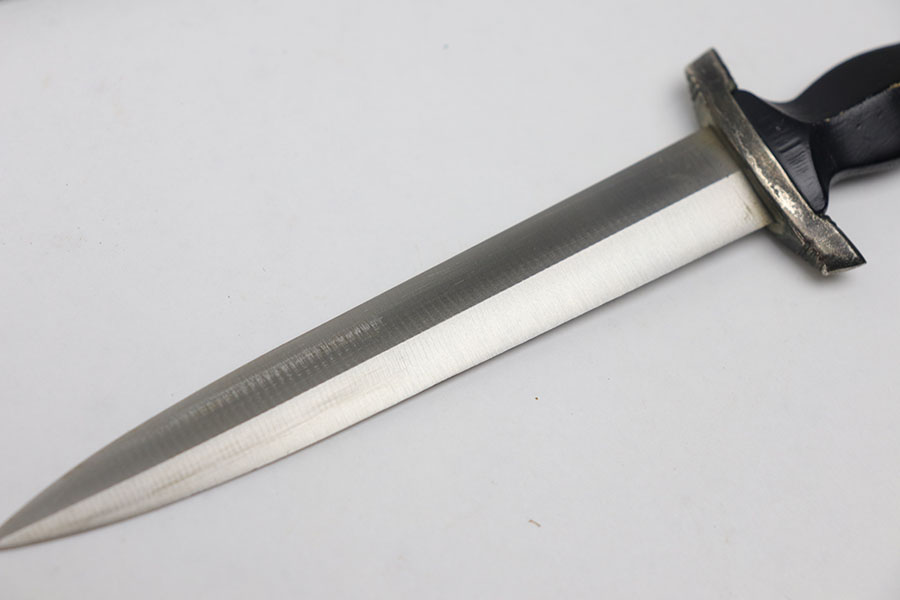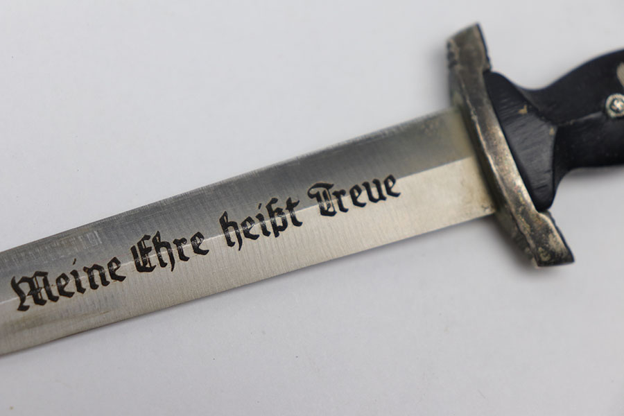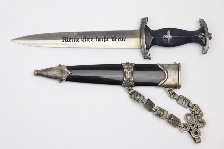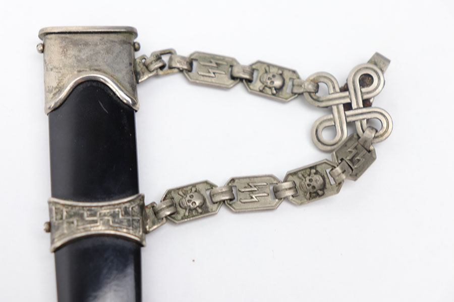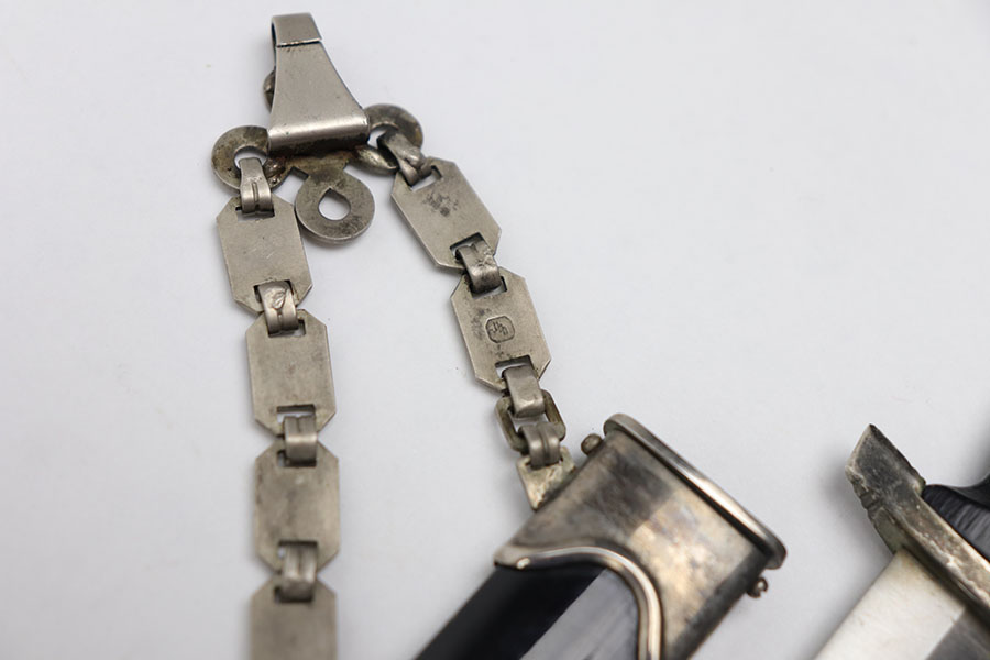 11/23/20 – This is a miniature chained SS dagger from WW2. The dagger inside the sheath measures about 7.2 inches. The blade is about 4.25 inches in length. The blade is excellent, very clean with an inscription on one side and no maker marking. Cross graining is clearly visible. The handle is in great condition with minimal wear and there is light patina on the hand guard and pommel. Similar patina is found on the sheath. The chain is in excellent condition with a small maker stamp on the reverse side.