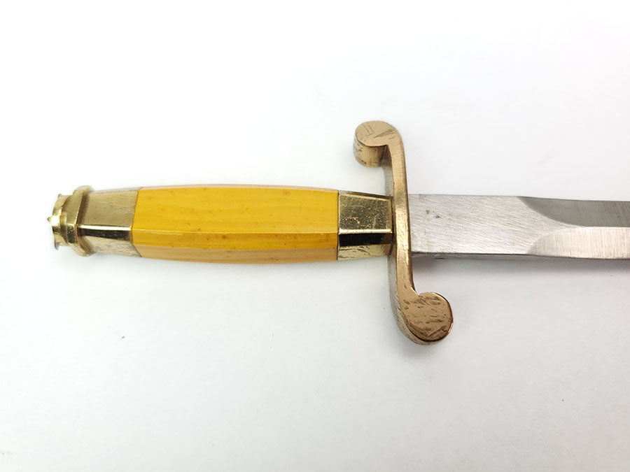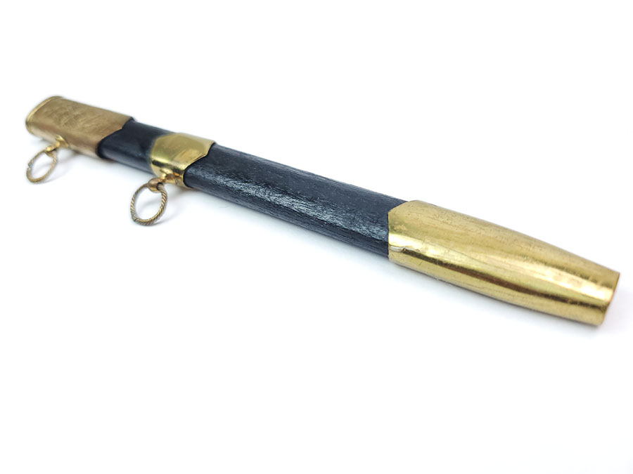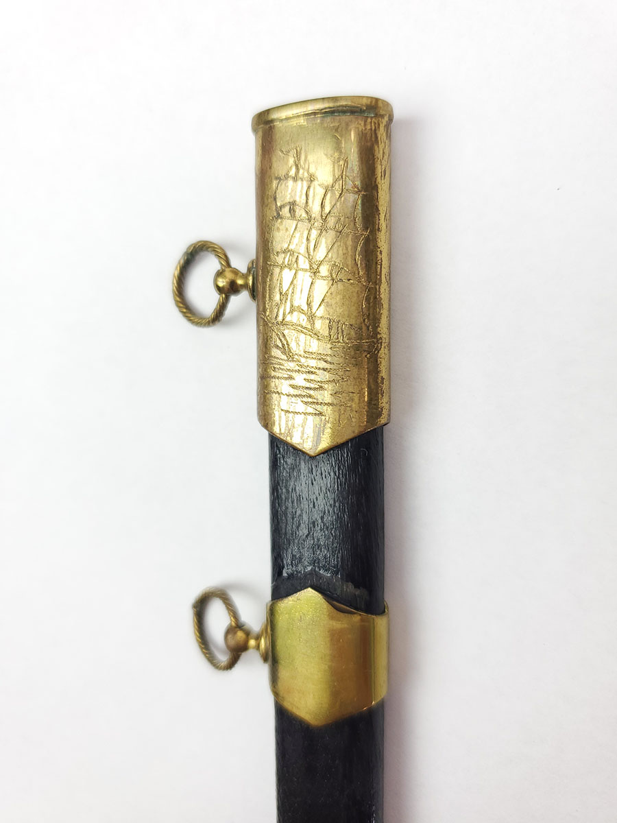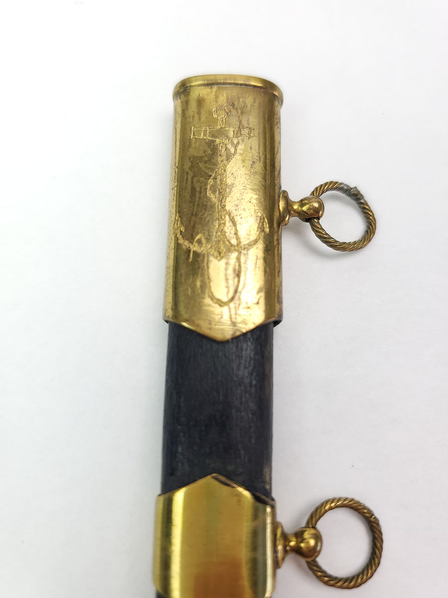 8/7/20 – This is a collectible miniature Russian Navy dagger. These are very rare, and are made in 1953 by the Soviet Union. The scabbard has scratching of an anchor on one side and a ship on the other. This is on the upper mount / metal of the scabbard. The blade has a few small spots of oxidation but is otherwise excellent.