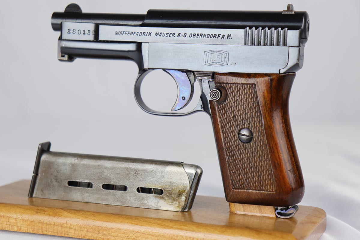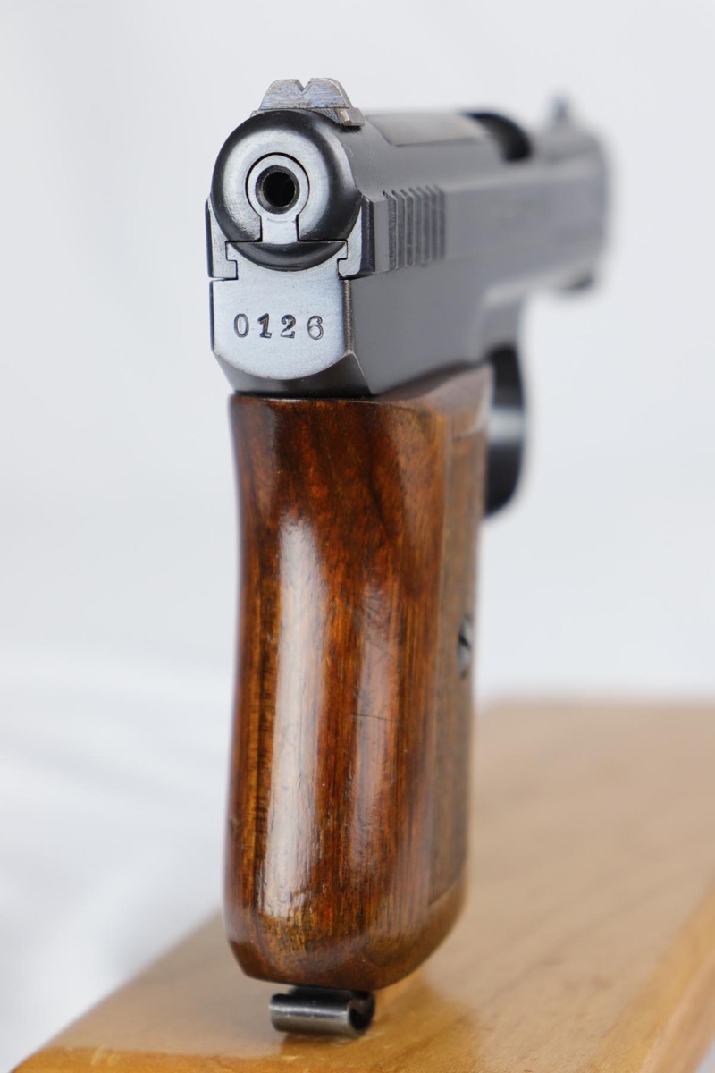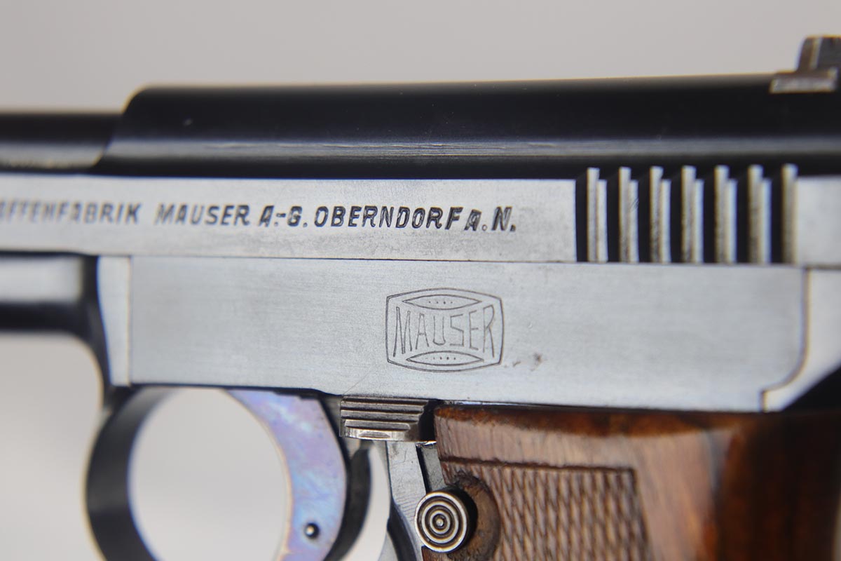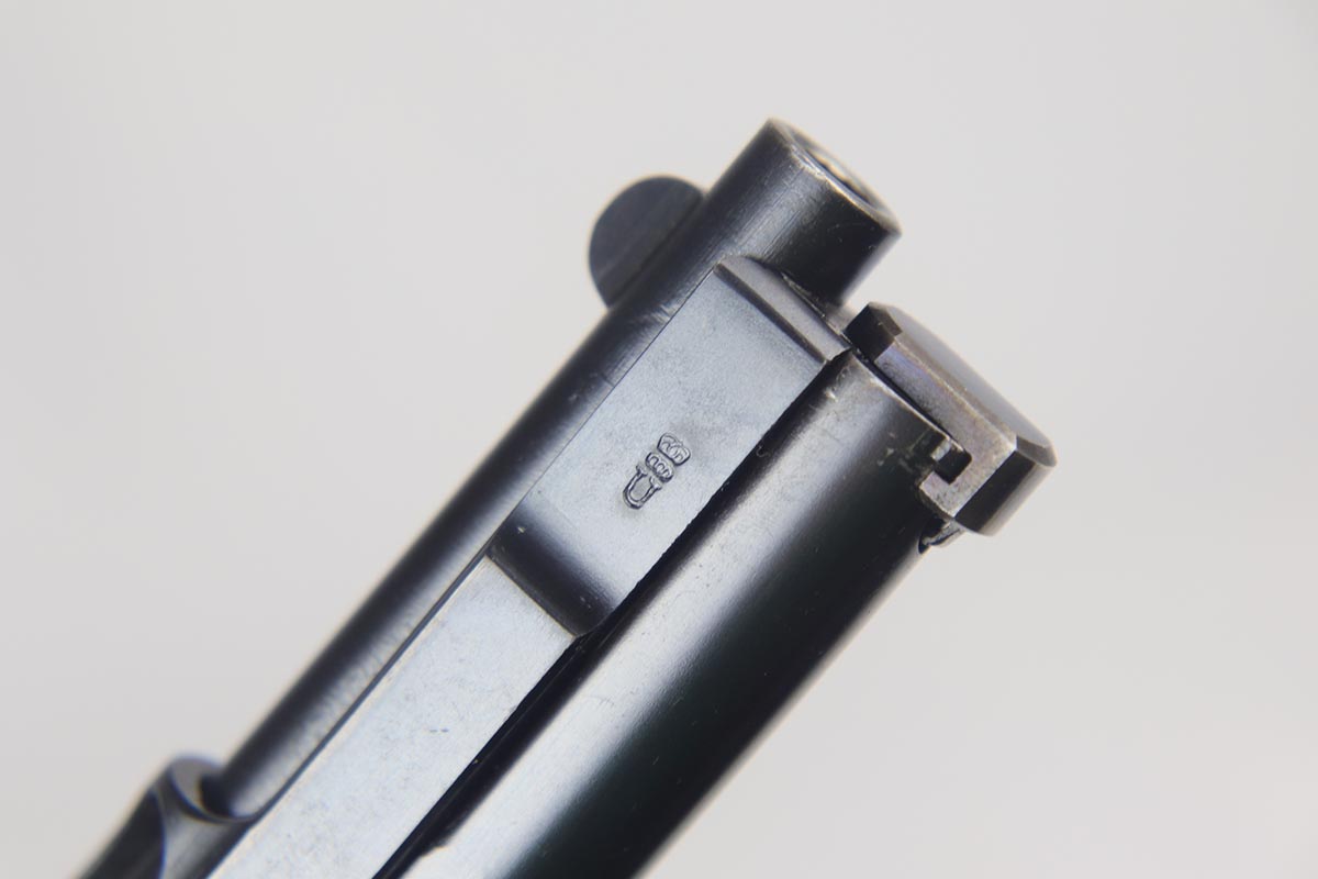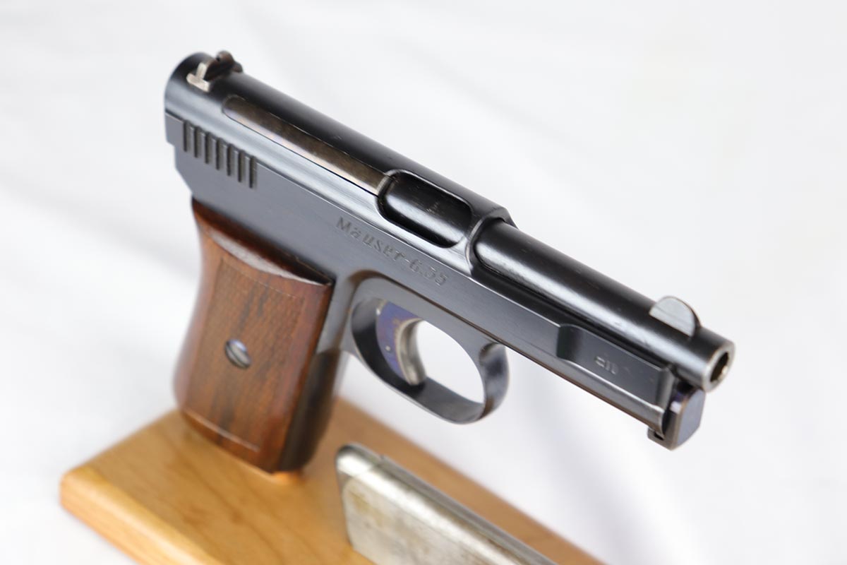 10/1/18 – This is a mint condition Mauser model 1910 pistol with Crown/U proofs on slide. The original finish shows virtually zero bluing loss, and a similarly minty grip and bore. Trigger shows excellent fire bluing. All correct and original.