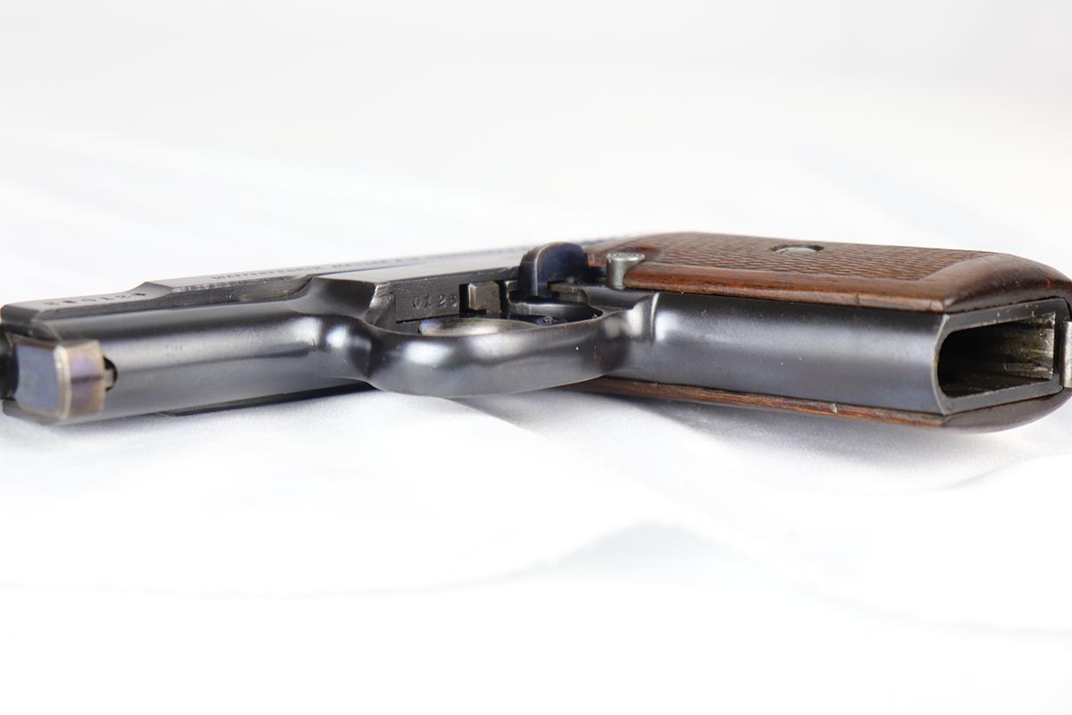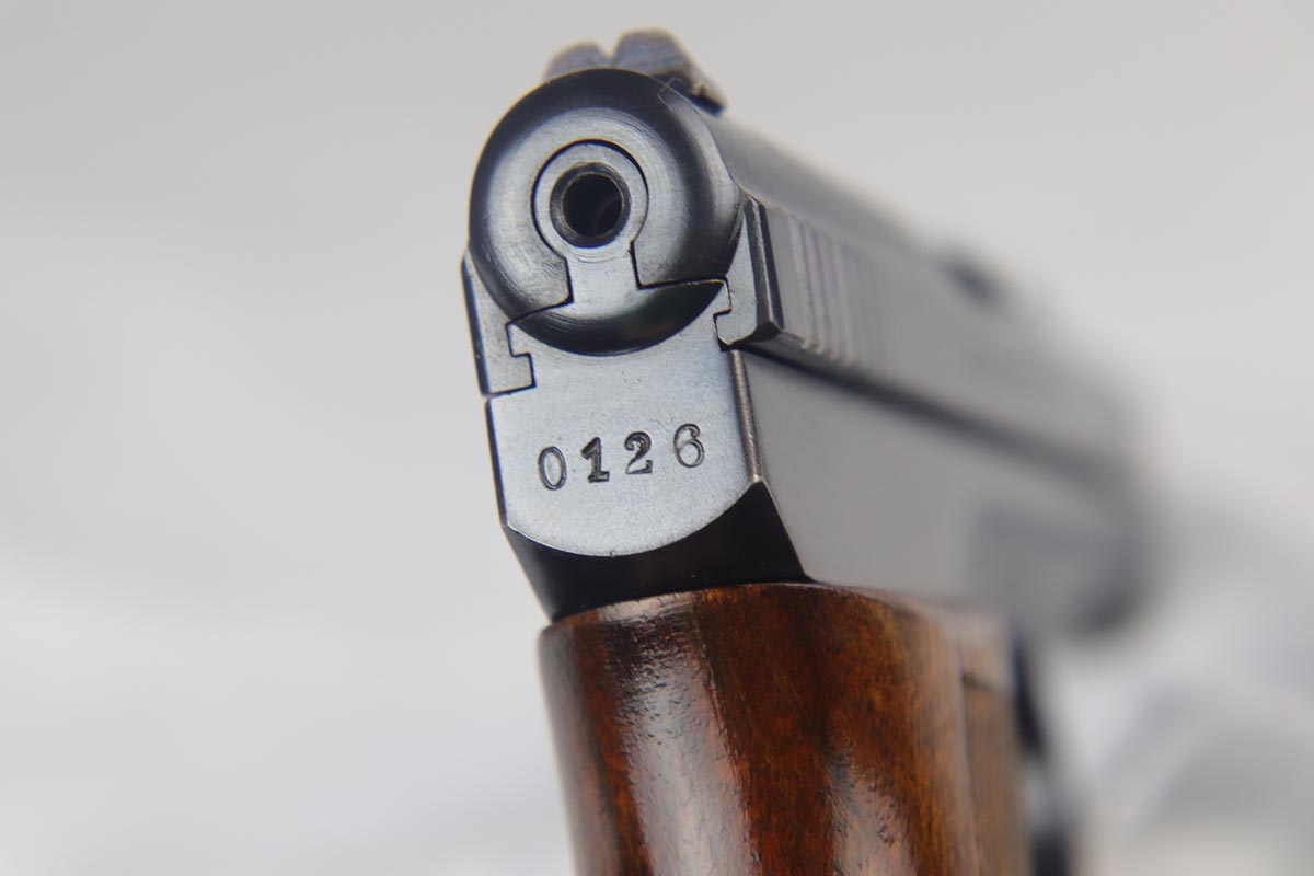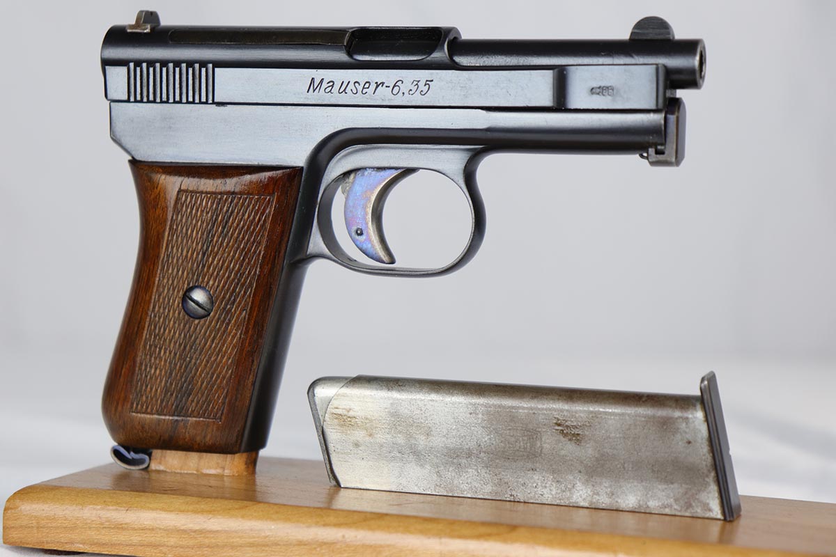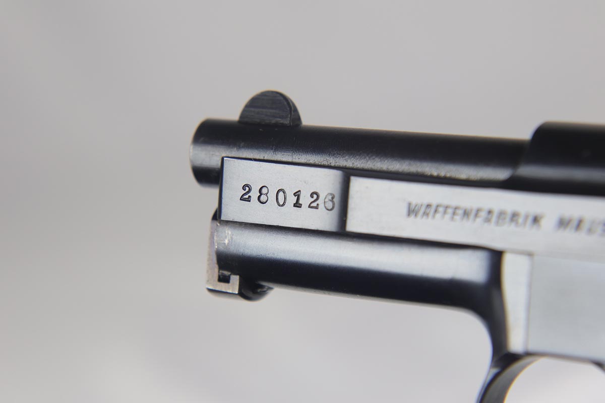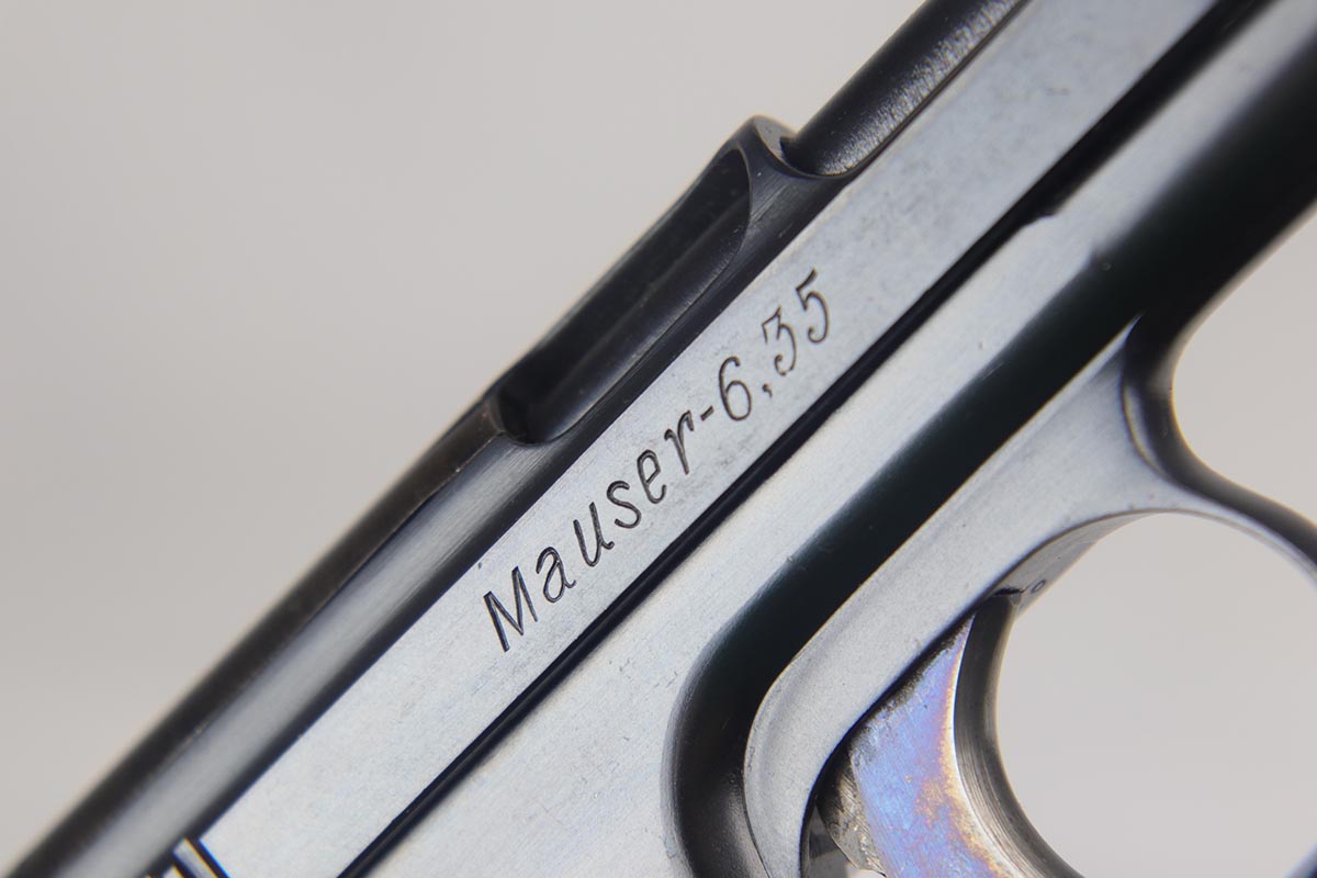 10/1/18 – This is a mint condition Mauser model 1910 pistol with Crown/U proofs on slide. The original finish shows virtually zero bluing loss, and a similarly minty grip and bore. Trigger shows excellent fire bluing. All correct and original.