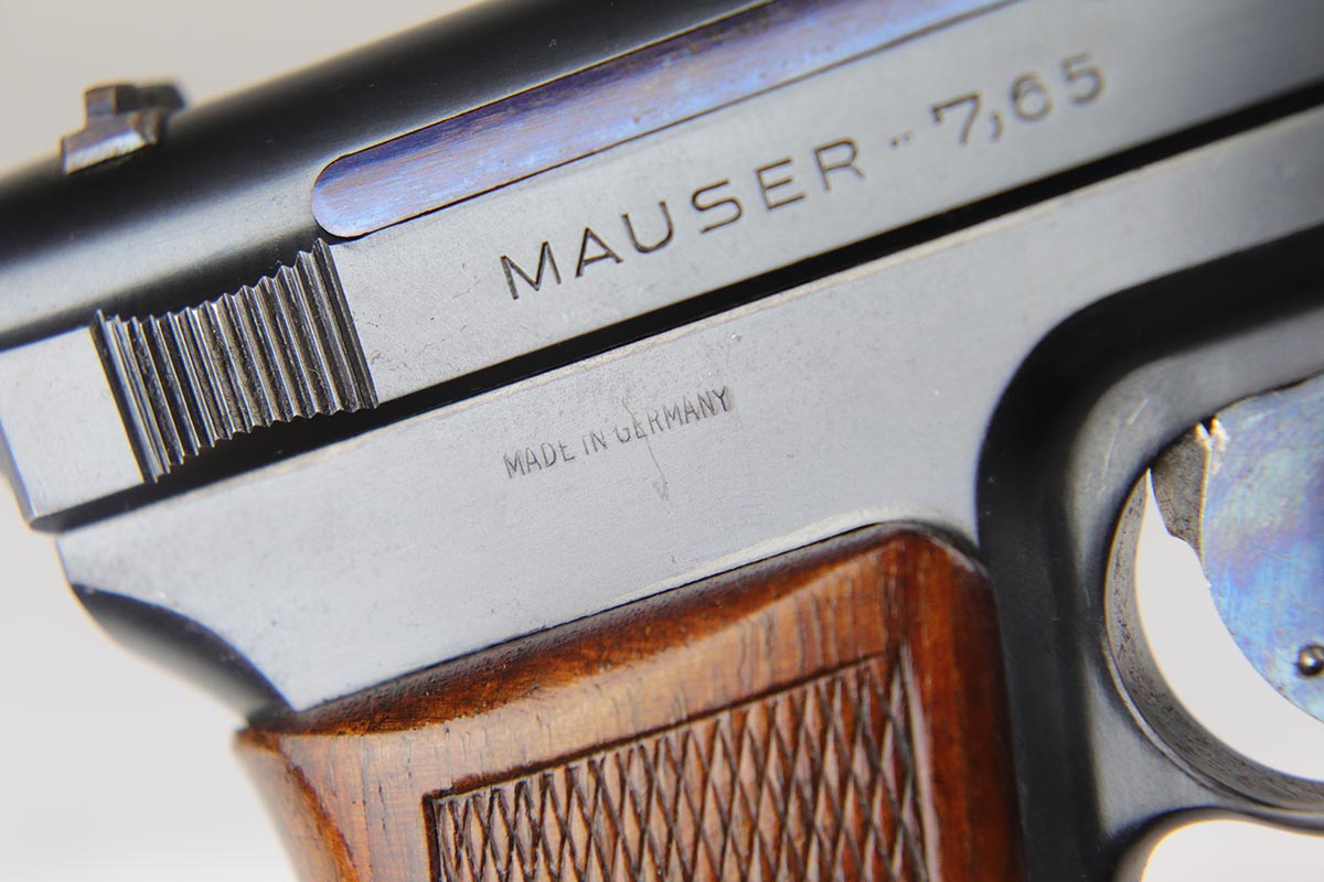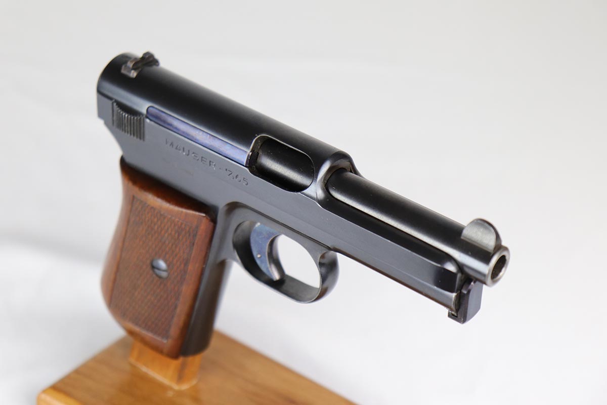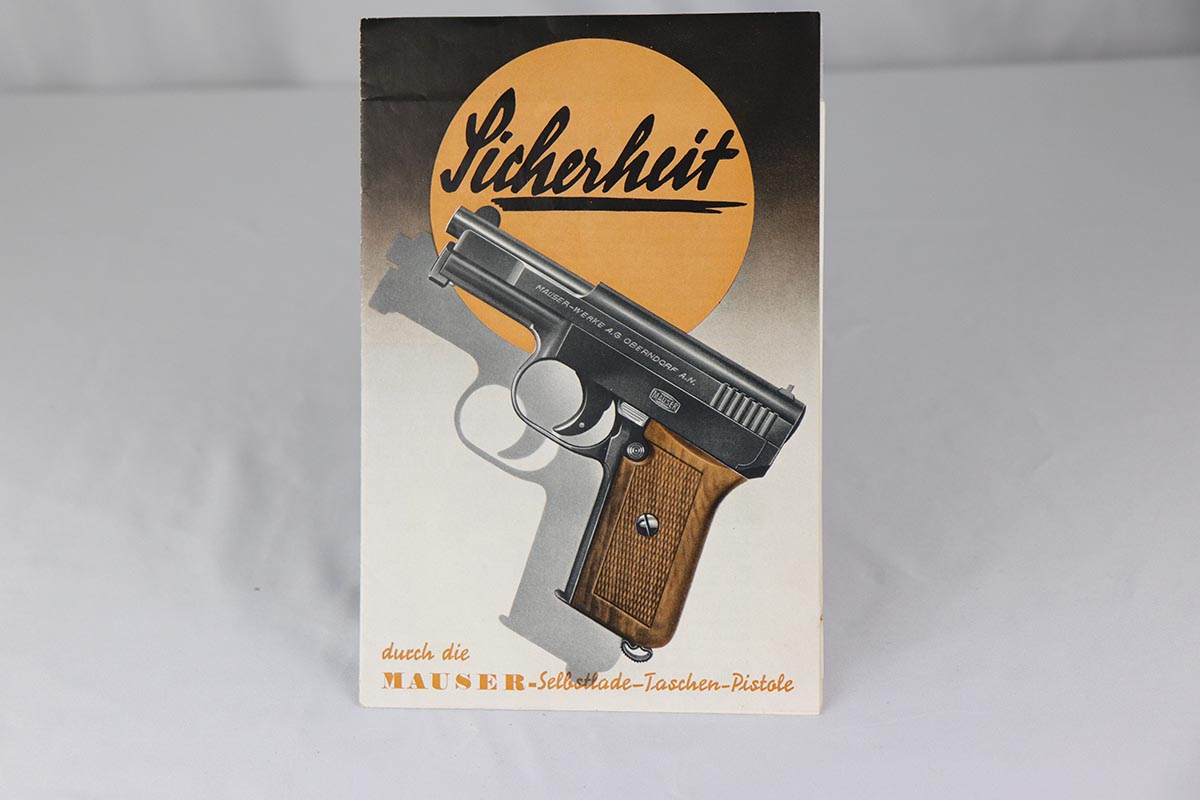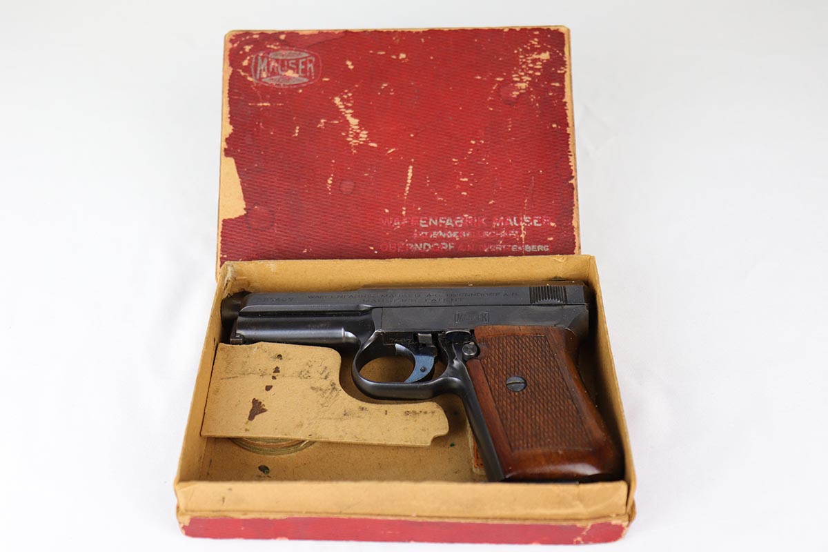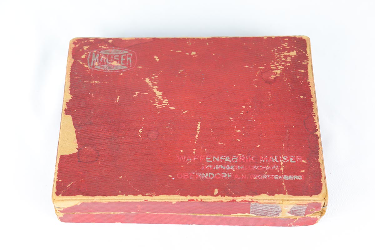 3/1/18 – This is a mint condition 1914 Mauser in original Mauser box.  The finish rates at 99+% with no flaws to mention.  Germany export proof on right side of frame. Excellent grips, magazine and bore.  The box shows wear but is largely intact.  The original divider is in the box but would need to be glued back in place.  Also comes with an original Mauser sales pamphlet!