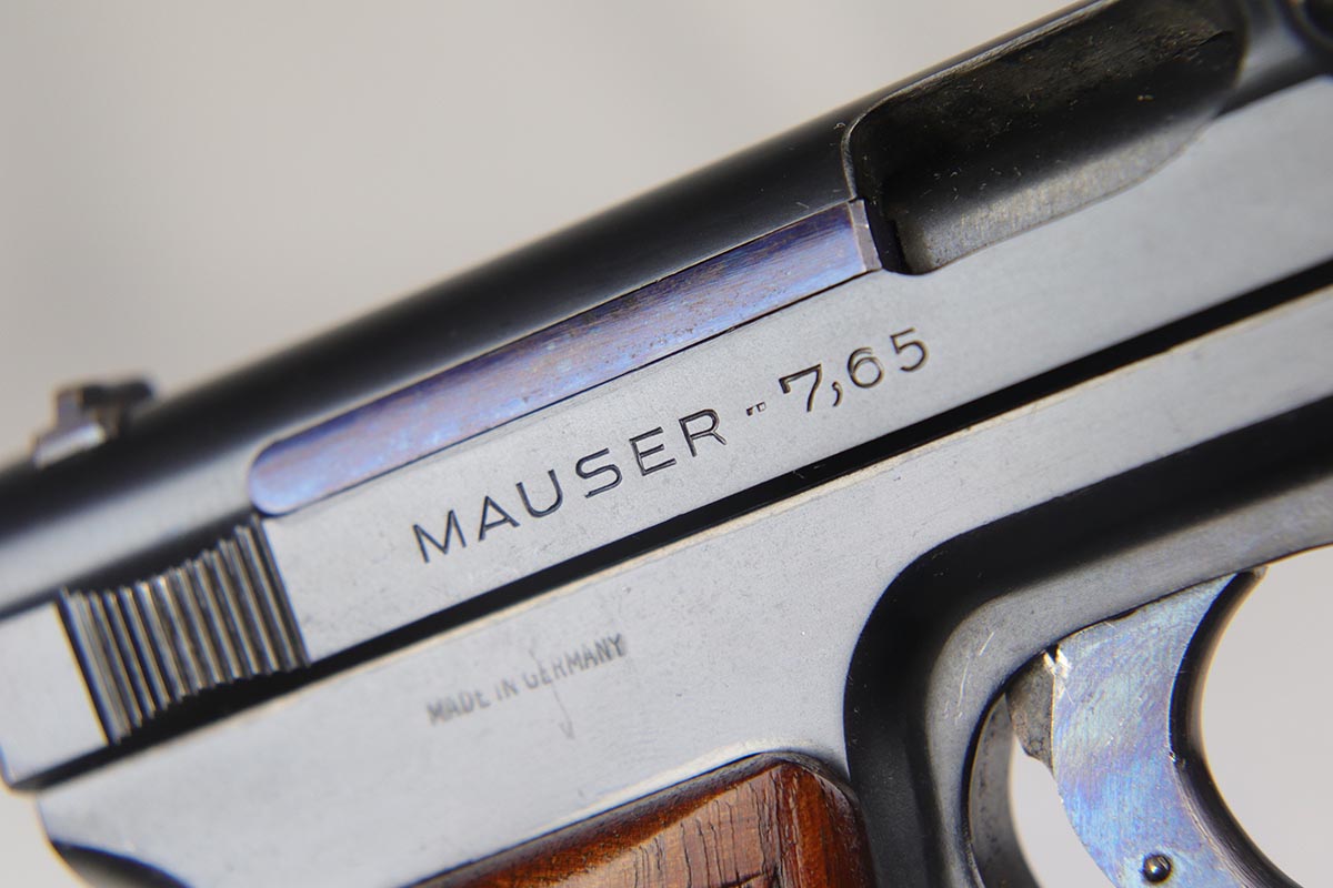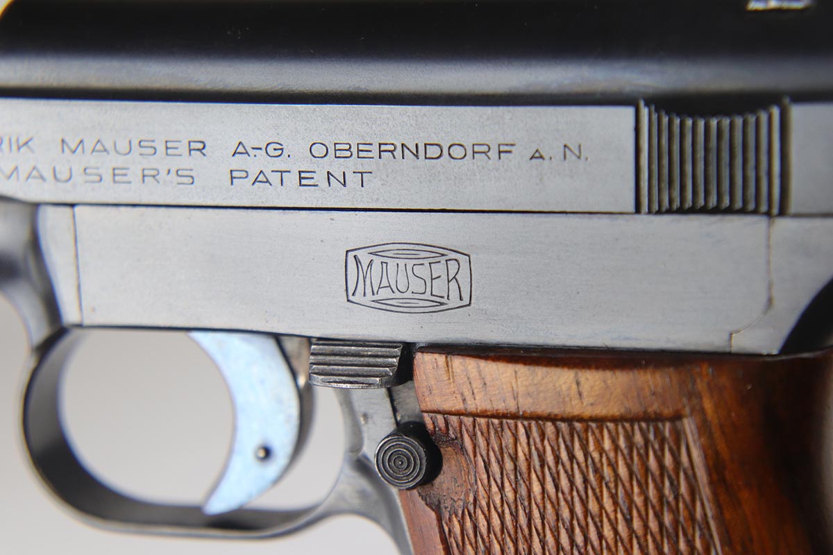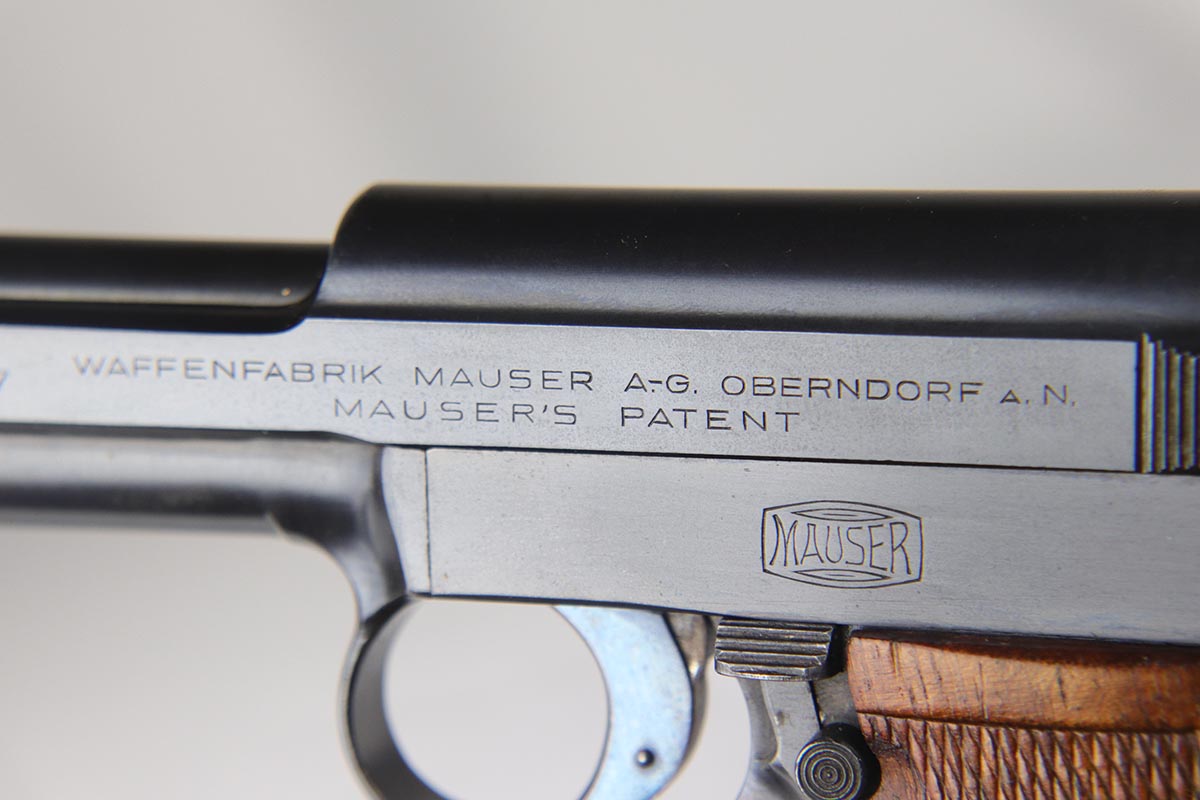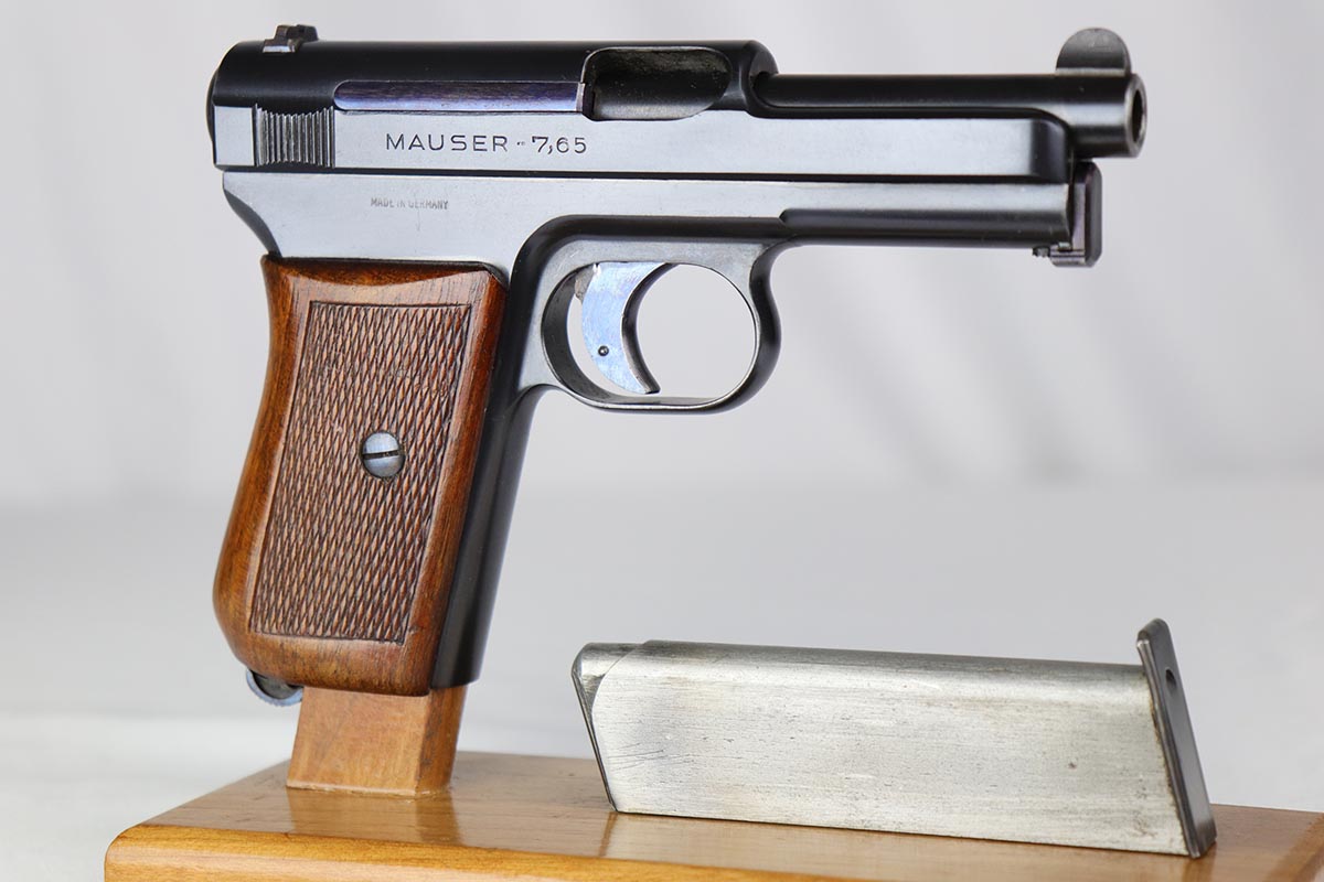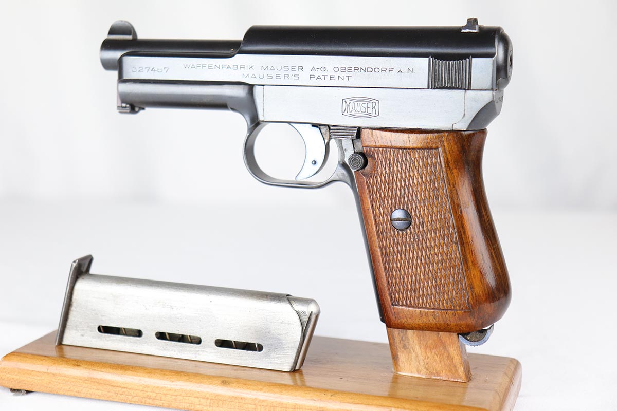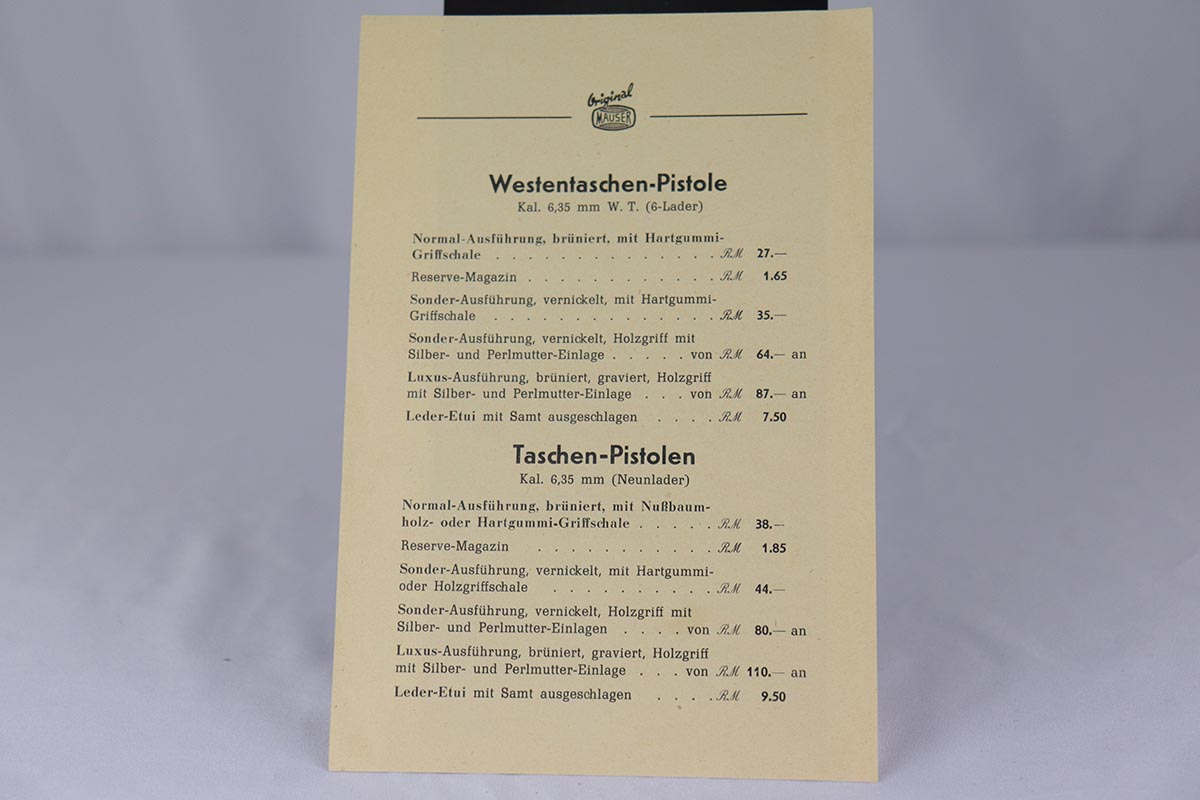 3/1/18 – This is a mint condition 1914 Mauser in original Mauser box.  The finish rates at 99+% with no flaws to mention.  Germany export proof on right side of frame. Excellent grips, magazine and bore.  The box shows wear but is largely intact.  The original divider is in the box but would need to be glued back in place.  Also comes with an original Mauser sales pamphlet!