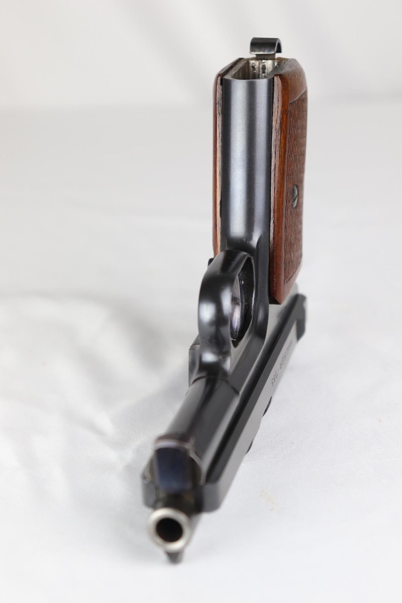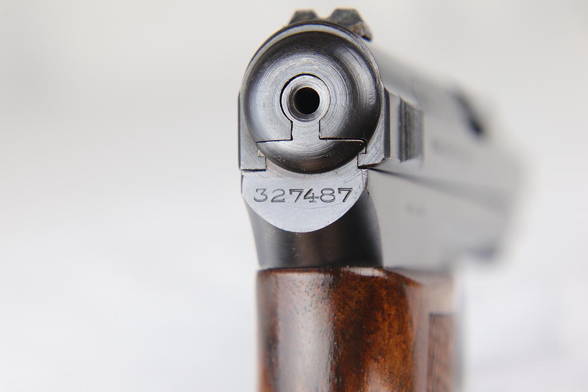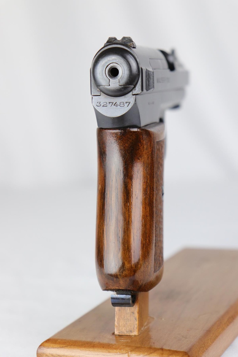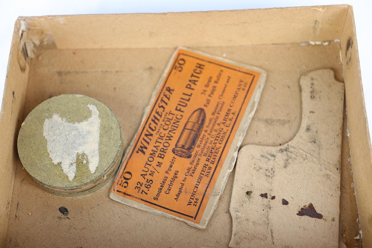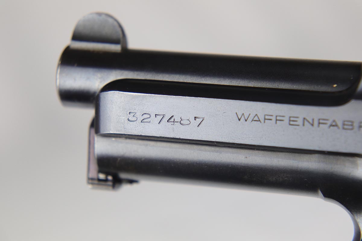 3/1/18 – This is a mint condition 1914 Mauser in original Mauser box.  The finish rates at 99+% with no flaws to mention.  Germany export proof on right side of frame. Excellent grips, magazine and bore.  The box shows wear but is largely intact.  The original divider is in the box but would need to be glued back in place.  Also comes with an original Mauser sales pamphlet!