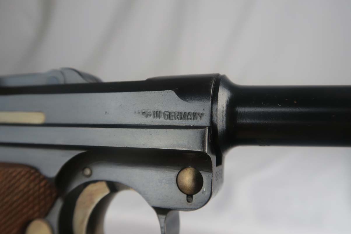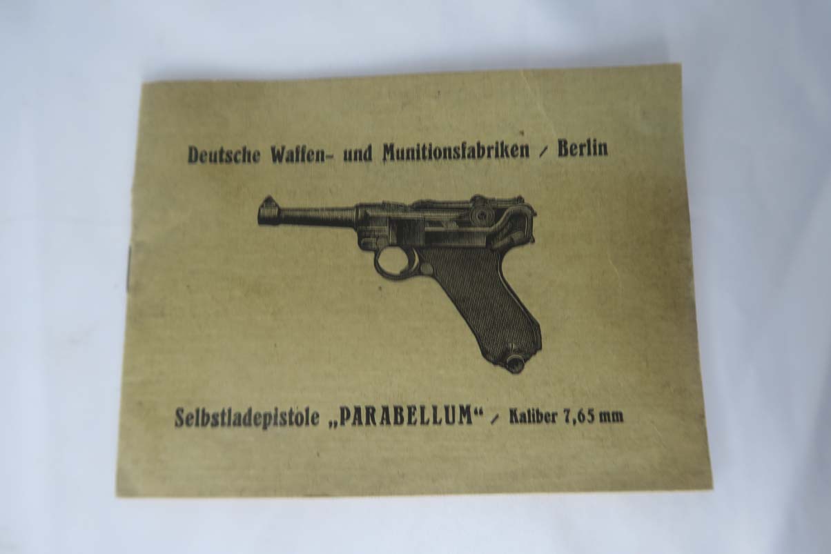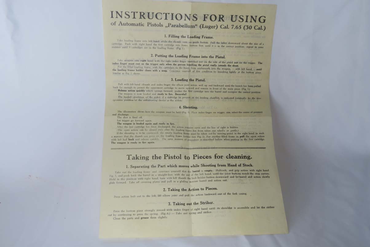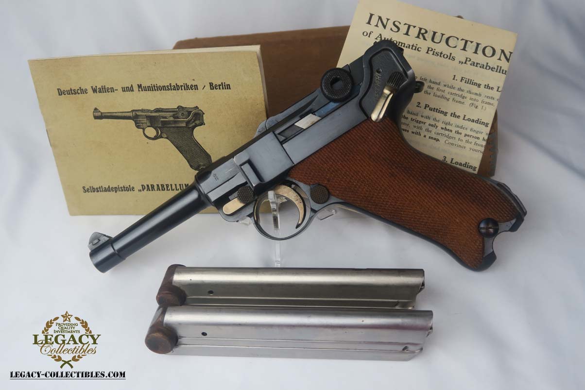 9/4/18 – This is a mint 1920 commercial DWM luger in the original box. It comes with a spare magazine which is period correct, as well as the WWI era manual and instructions for use page. The box is not serialized to the pistol, but commercial luger boxes generally weren’t. The finish of the pistol negligible wear, and the pistol is all original and correct. It is marked “MADE IN GERMANY” on the right side of the receiver. Minty bore, as well.