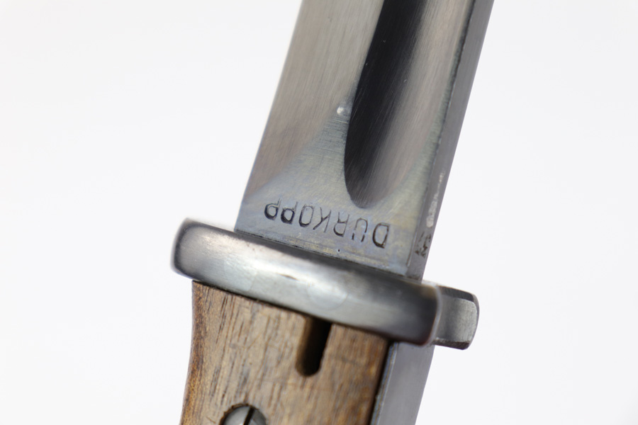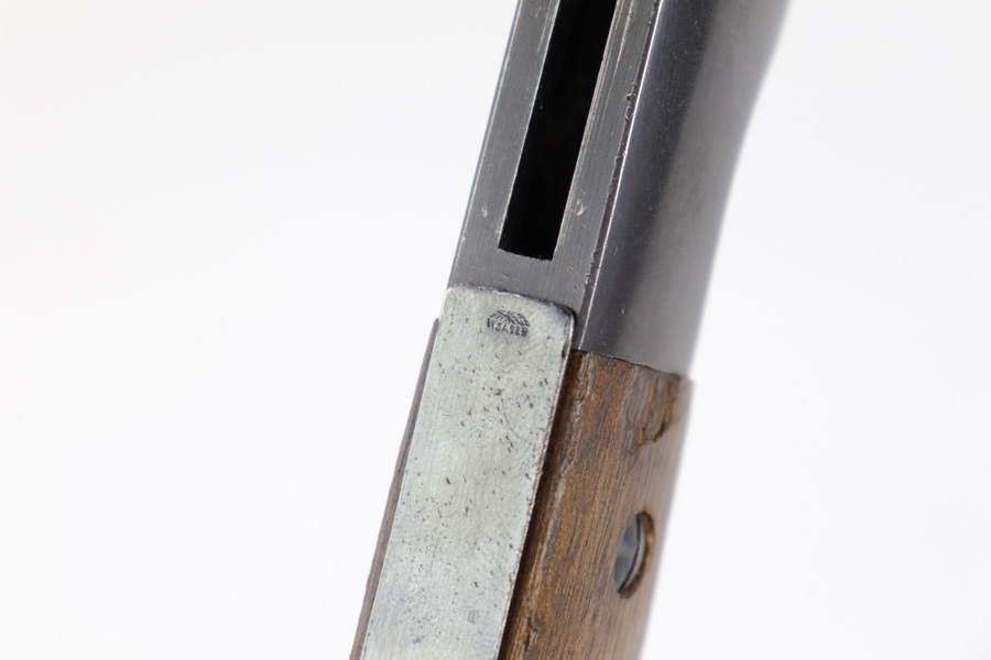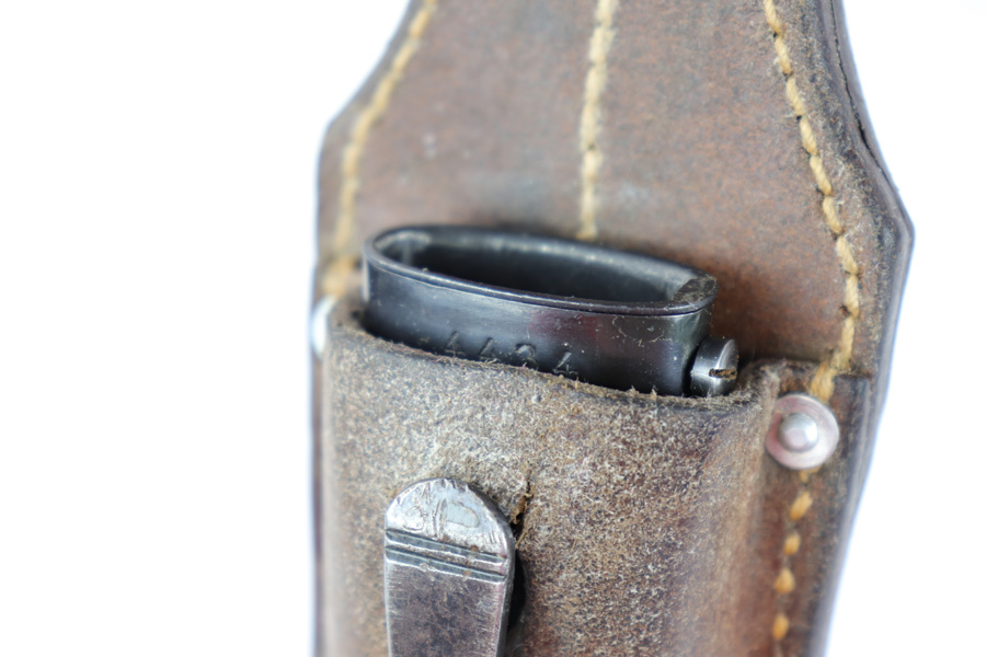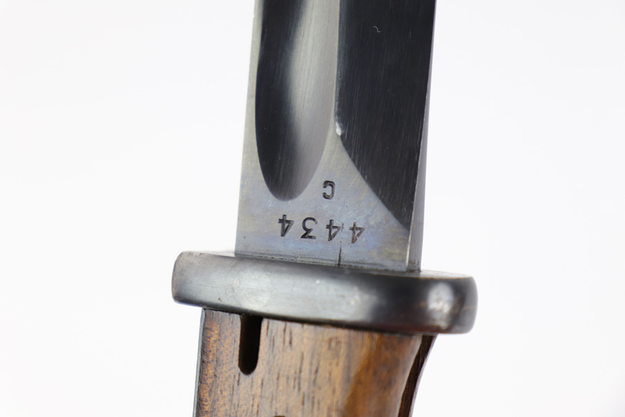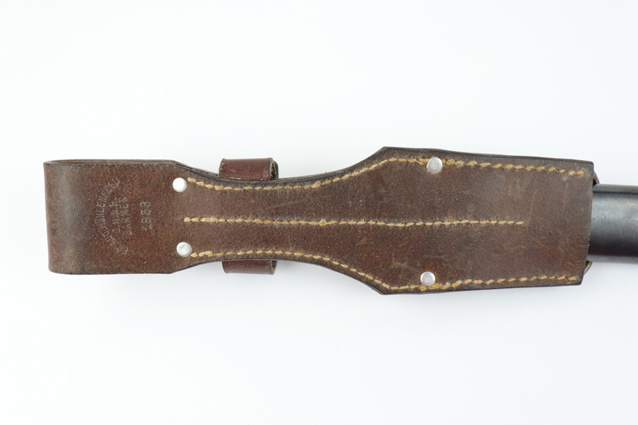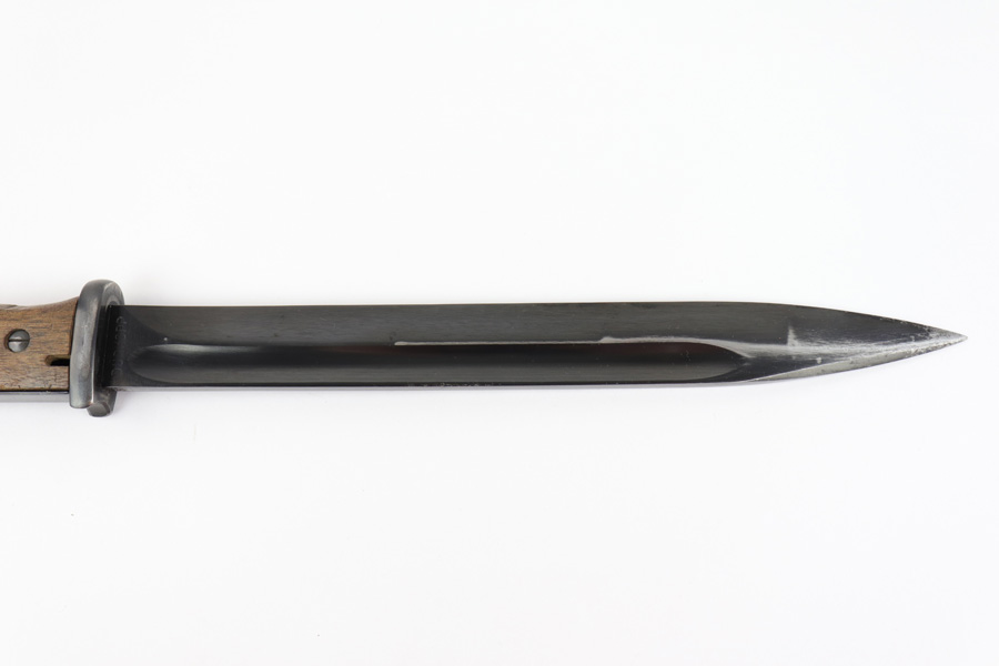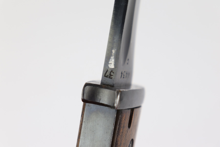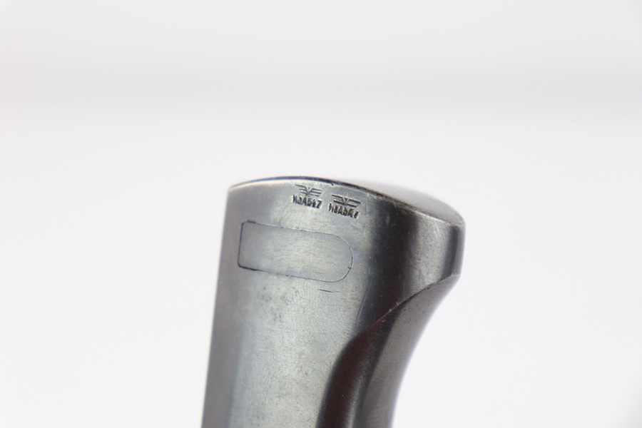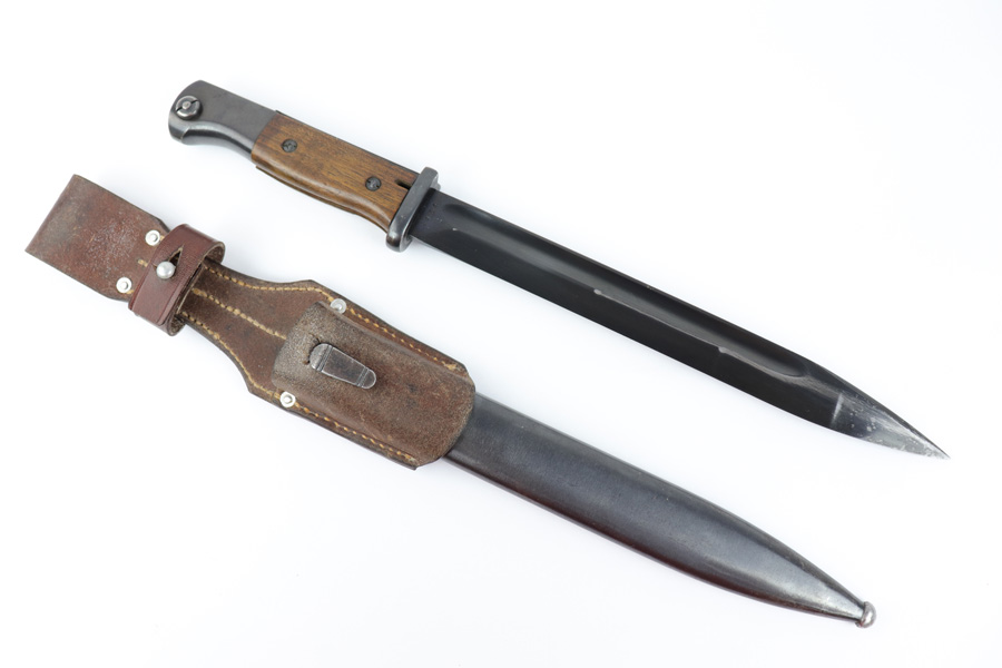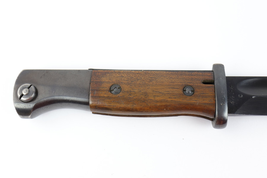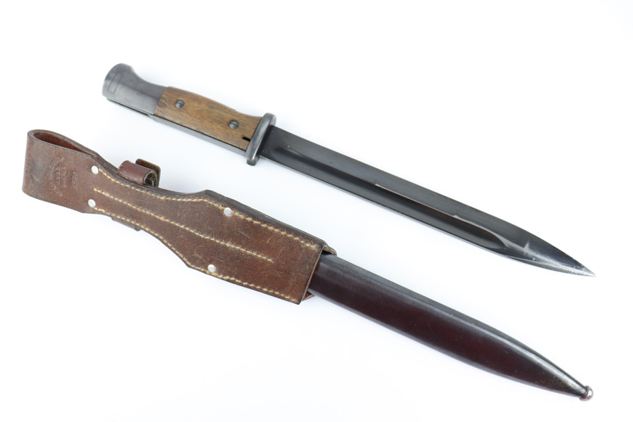 5/1/19 – This is an original early WW2 production K98 bayonet in minty condition. Beautiful bluing on the blade, handle, and scabbard. The toe of the blade and scabbard both have minor finish loss as shown in photos, but this is light surface wear. The blade is maker marked on one side and serial numbered on the other. The scabbard is matching serial numbered. The wood handle has no cracks or chips. The brown leather frog has some light surface wear but all original leather and stitching with a 1938 date and maker stamp on the back. All original and authentic.
