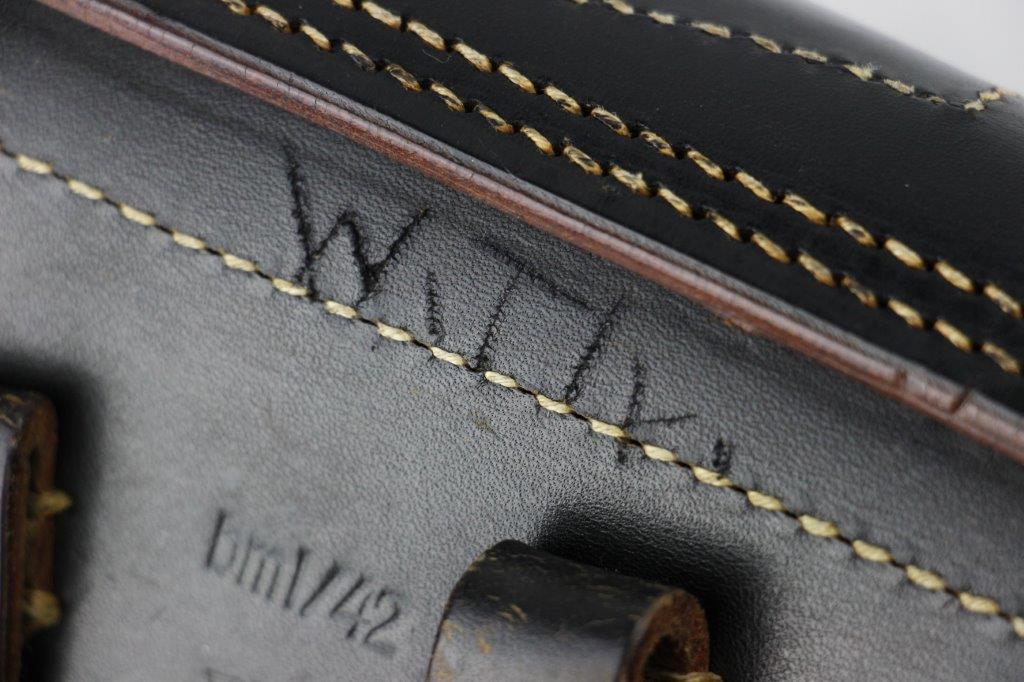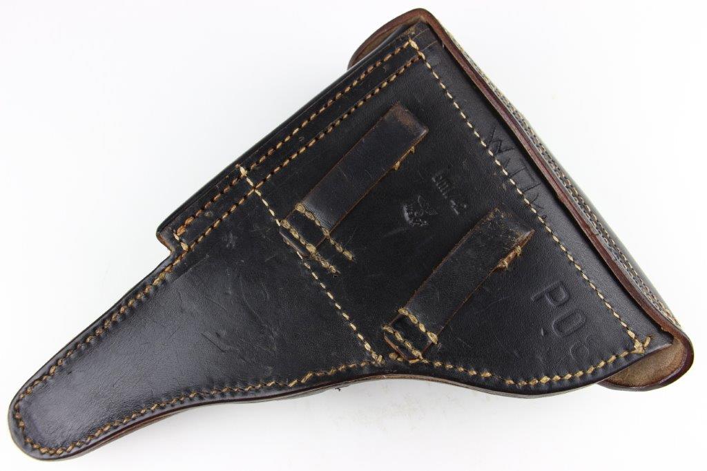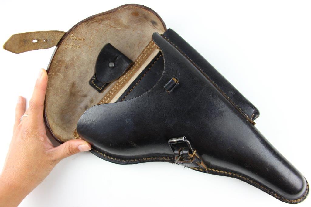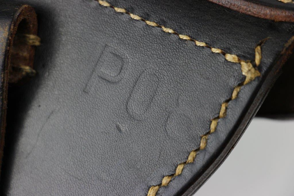 7/16/24 – This is a mint condition Luger holster from WW2. The holster features strong, crisp, and clean leather that’s so well preserved that the leather squeaks when moved. The leather holds shape and has minimal pliability. The ONLY flaw on this example are the initials scratched onto the back leather, just above the stitching. The back leather is maker stamped, dated, waffen proofed, and P.08 designation stamped. All markings are clearly visible. The interior leather is extremely well preserved, and the stitching is all original throughout. A great match for any high-end 1941 or 1942 Luger. Examples in this condition are few and far between.
