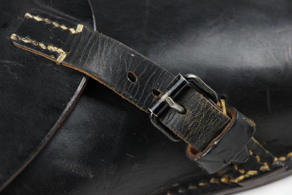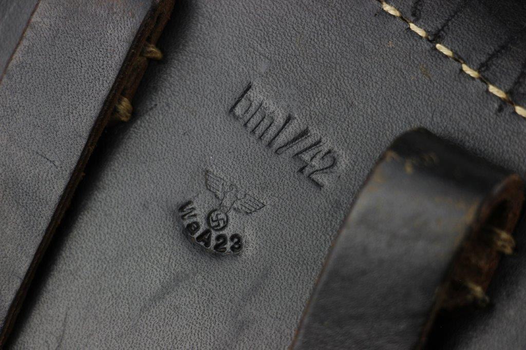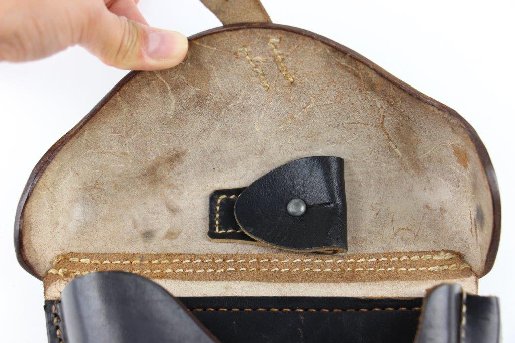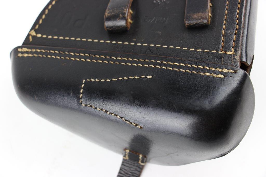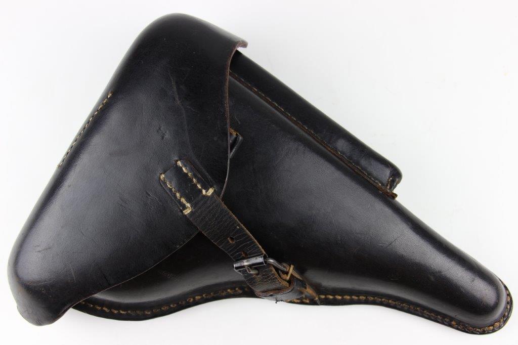 7/16/24 – This is a mint condition Luger holster from WW2. The holster features strong, crisp, and clean leather that’s so well preserved that the leather squeaks when moved. The leather holds shape and has minimal pliability. The ONLY flaw on this example are the initials scratched onto the back leather, just above the stitching. The back leather is maker stamped, dated, waffen proofed, and P.08 designation stamped. All markings are clearly visible. The interior leather is extremely well preserved, and the stitching is all original throughout. A great match for any high-end 1941 or 1942 Luger. Examples in this condition are few and far between.