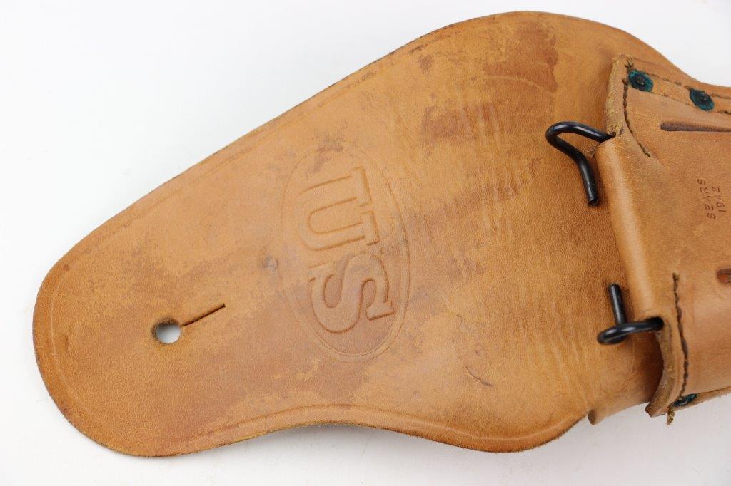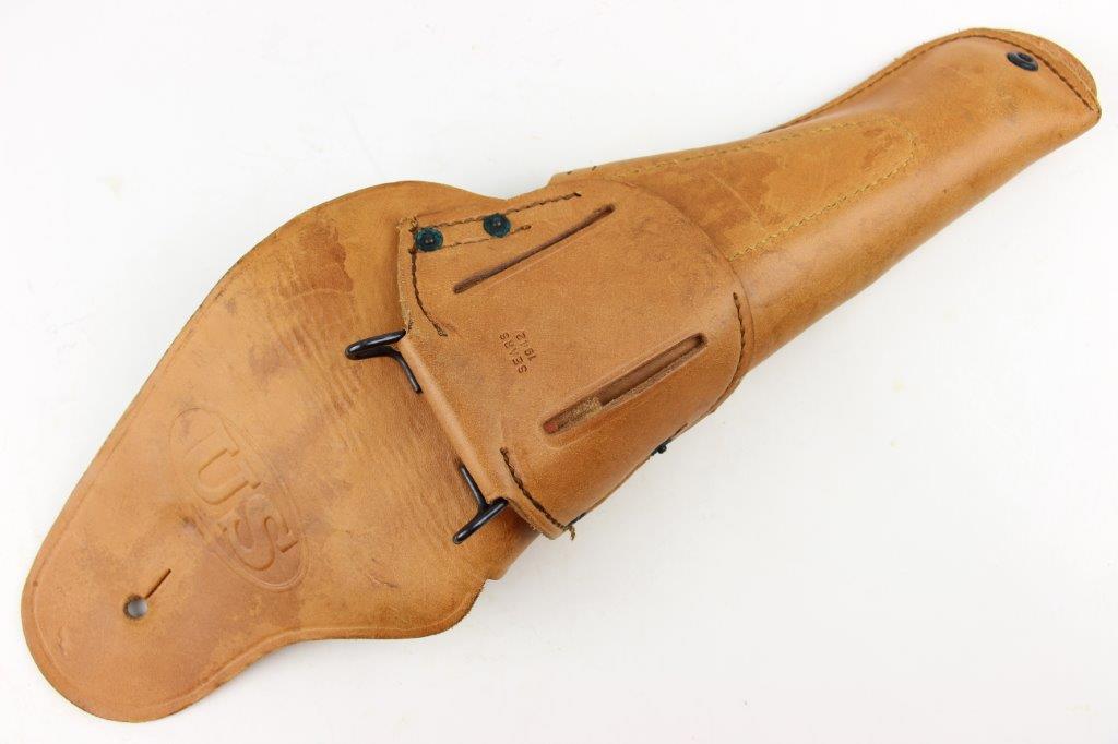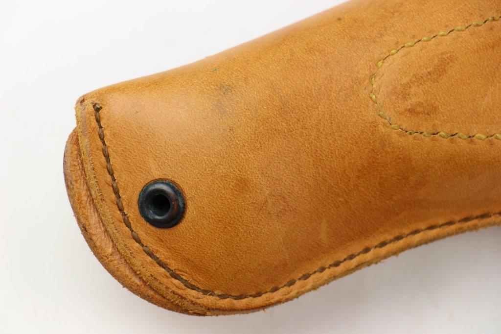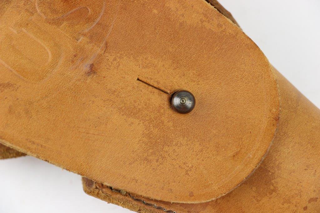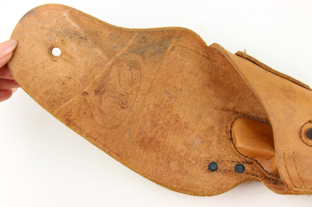 9/25/24 – This is a mint condition M1916 holster for the M1911A1 pistol. This holster is a high-end example with light brown leather that’s crisp and clean throughout. Some mild surface discoloration on the exterior leather as shown, and mild use wear evident on the interior leather. The leather has normal pliability as well. Excellent, tight stitching throughout. Stamped on the back leather with a crisp maker and date stamp. Beautiful, original blued finish on the closure knob and belt hooks, which is seldom seen on examples today.