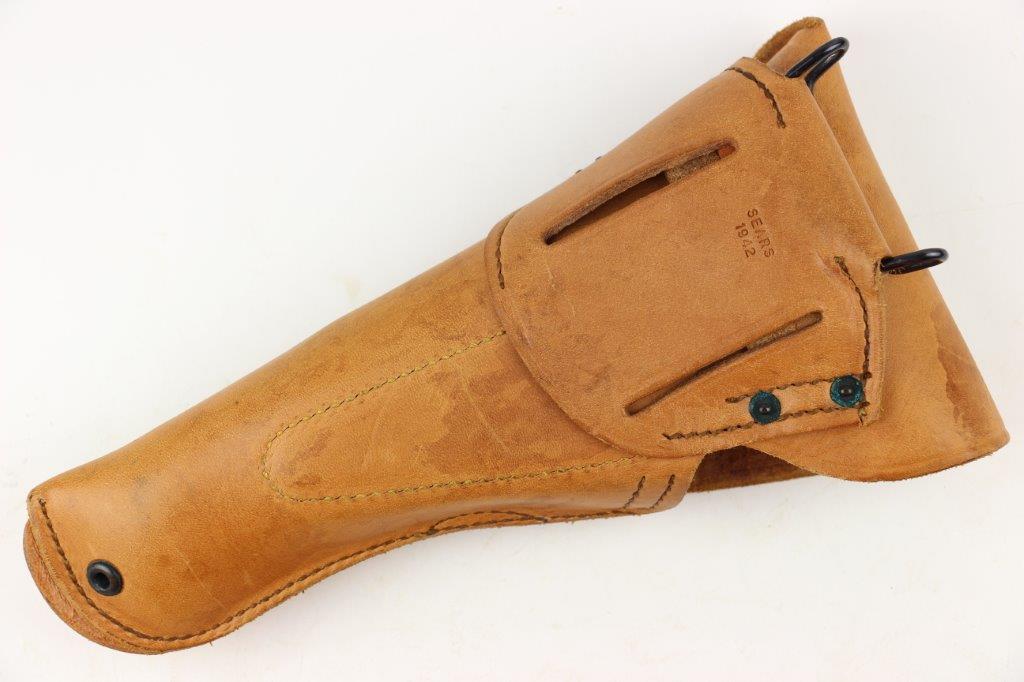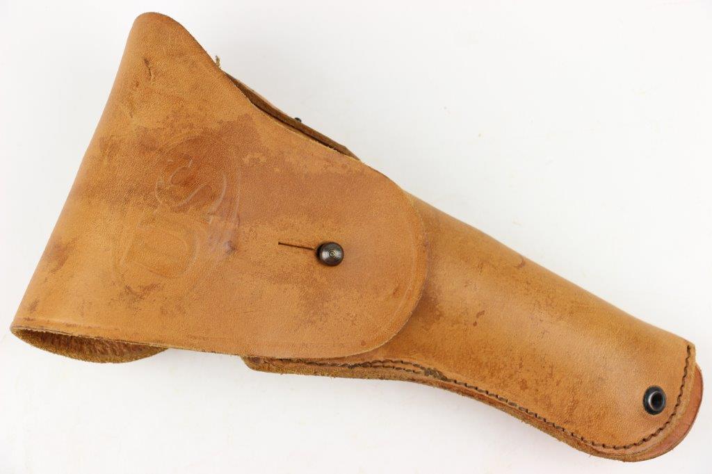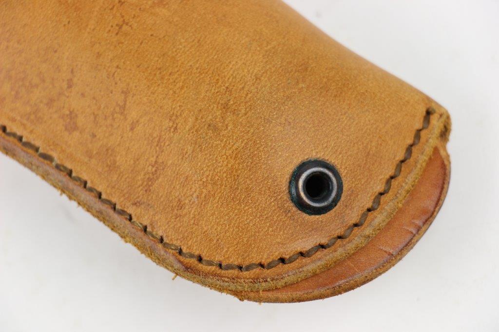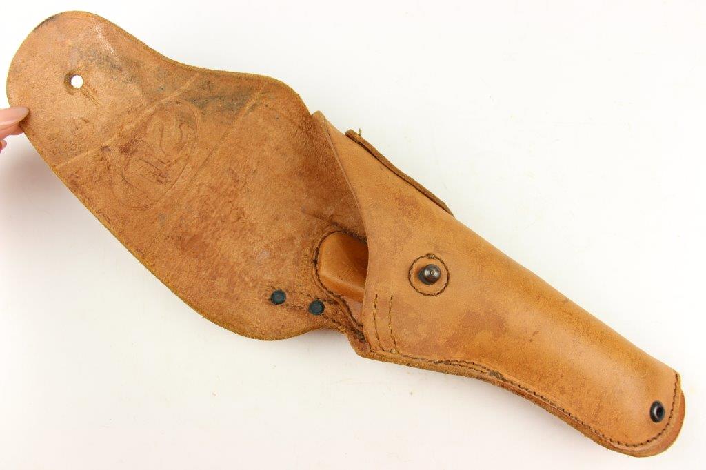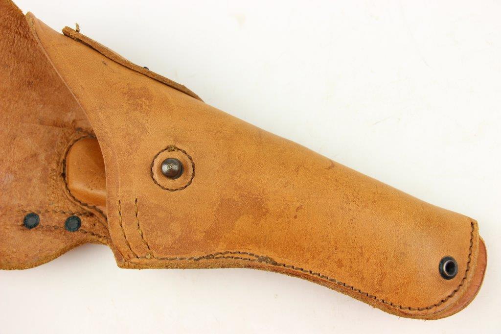 9/25/24 – This is a mint condition M1916 holster for the M1911A1 pistol. This holster is a high-end example with light brown leather that’s crisp and clean throughout. Some mild surface discoloration on the exterior leather as shown, and mild use wear evident on the interior leather. The leather has normal pliability as well. Excellent, tight stitching throughout. Stamped on the back leather with a crisp maker and date stamp. Beautiful, original blued finish on the closure knob and belt hooks, which is seldom seen on examples today.