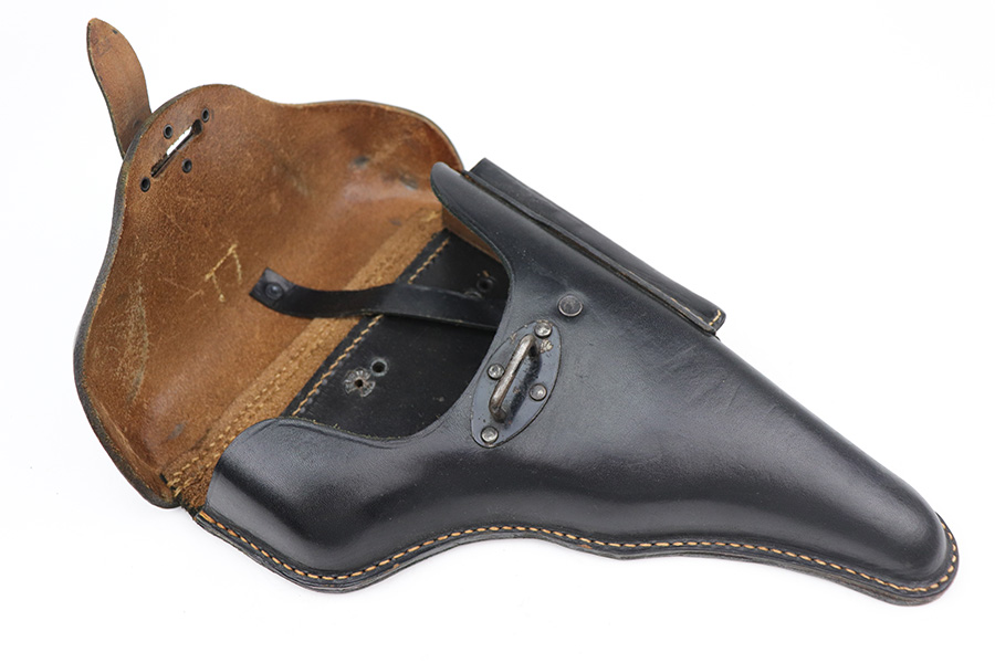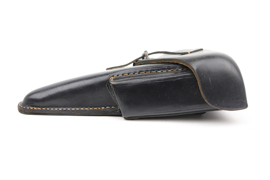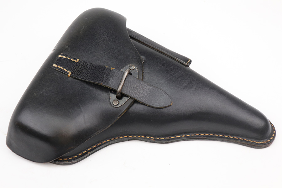 8/27/21 – This black P.38 holster is in mint condition. The stitching is in pristine condition and the leather of the holster shows very minimal wear. The holster has no waffen stamp and was potentially not issued. The holster shows a “P.38” and maker mark “jhg 42”. The straps on the holster are also riveted.
