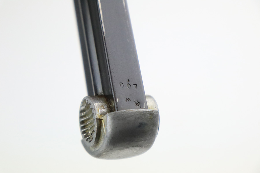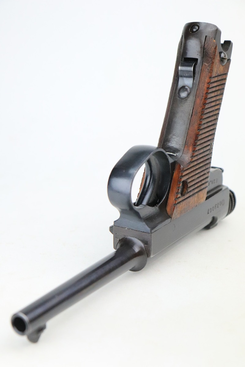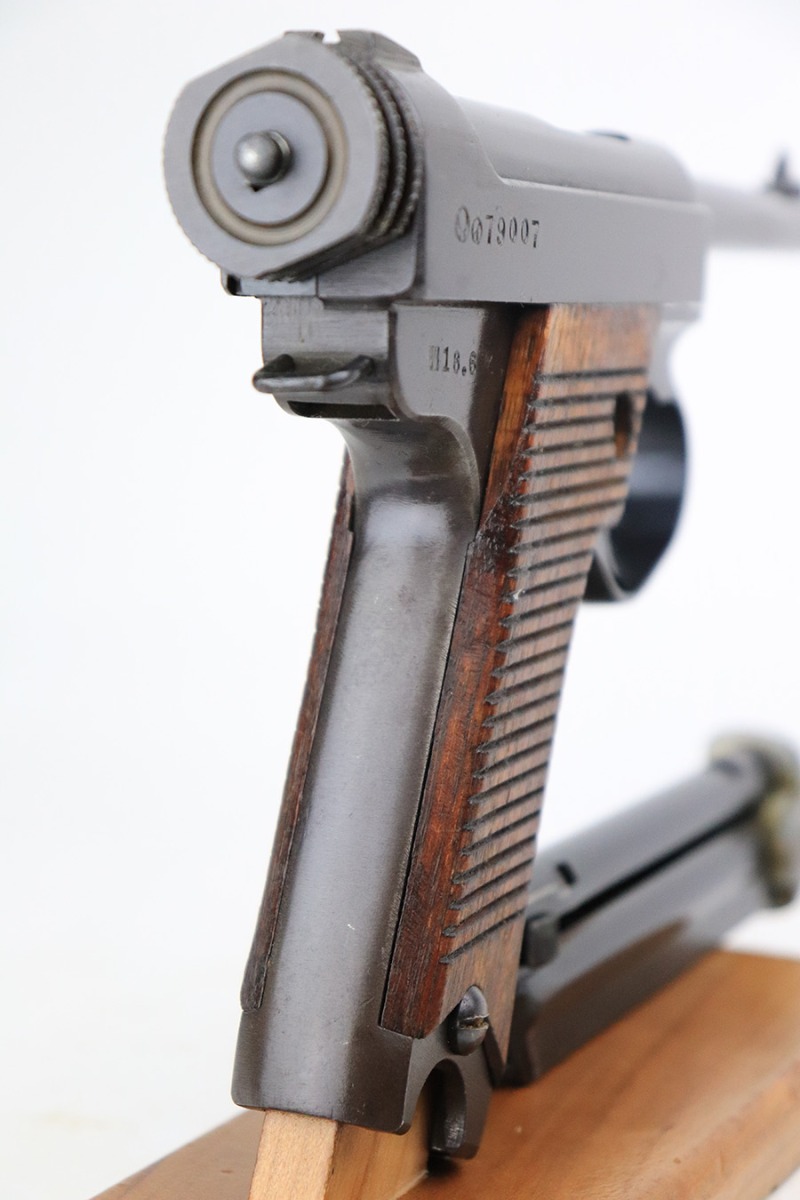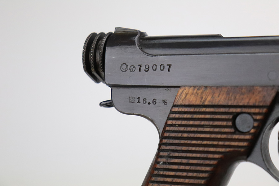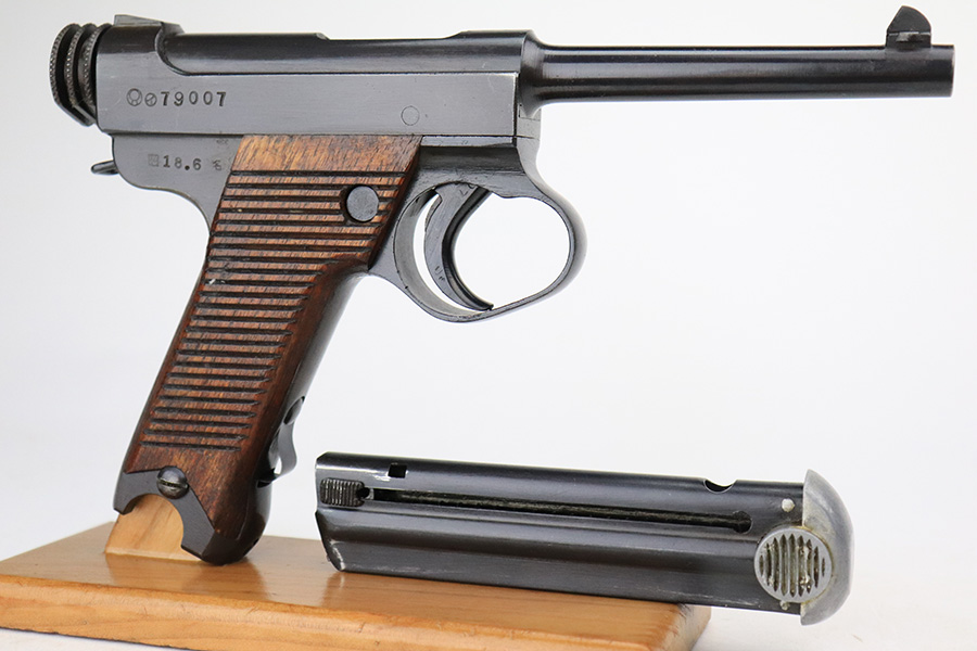 8/15/22 – This is a mint example of a Nambu Type 14 issued to the Japanese military in June of 1943. The gun is all matching and comes with one original matching-numbered magazine. It is in mint condition with virtually no signs of finish loss, wear, or use. Just a hint of dulling in the finish on the back strap. Comes with excellent matching-numbered wood grips. The bore is like-new.