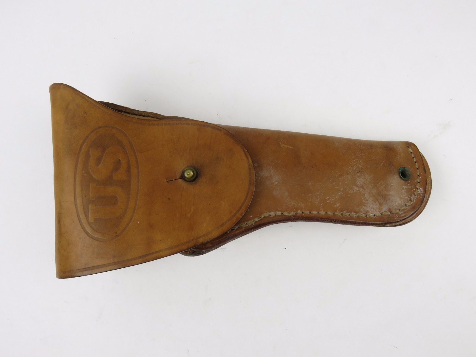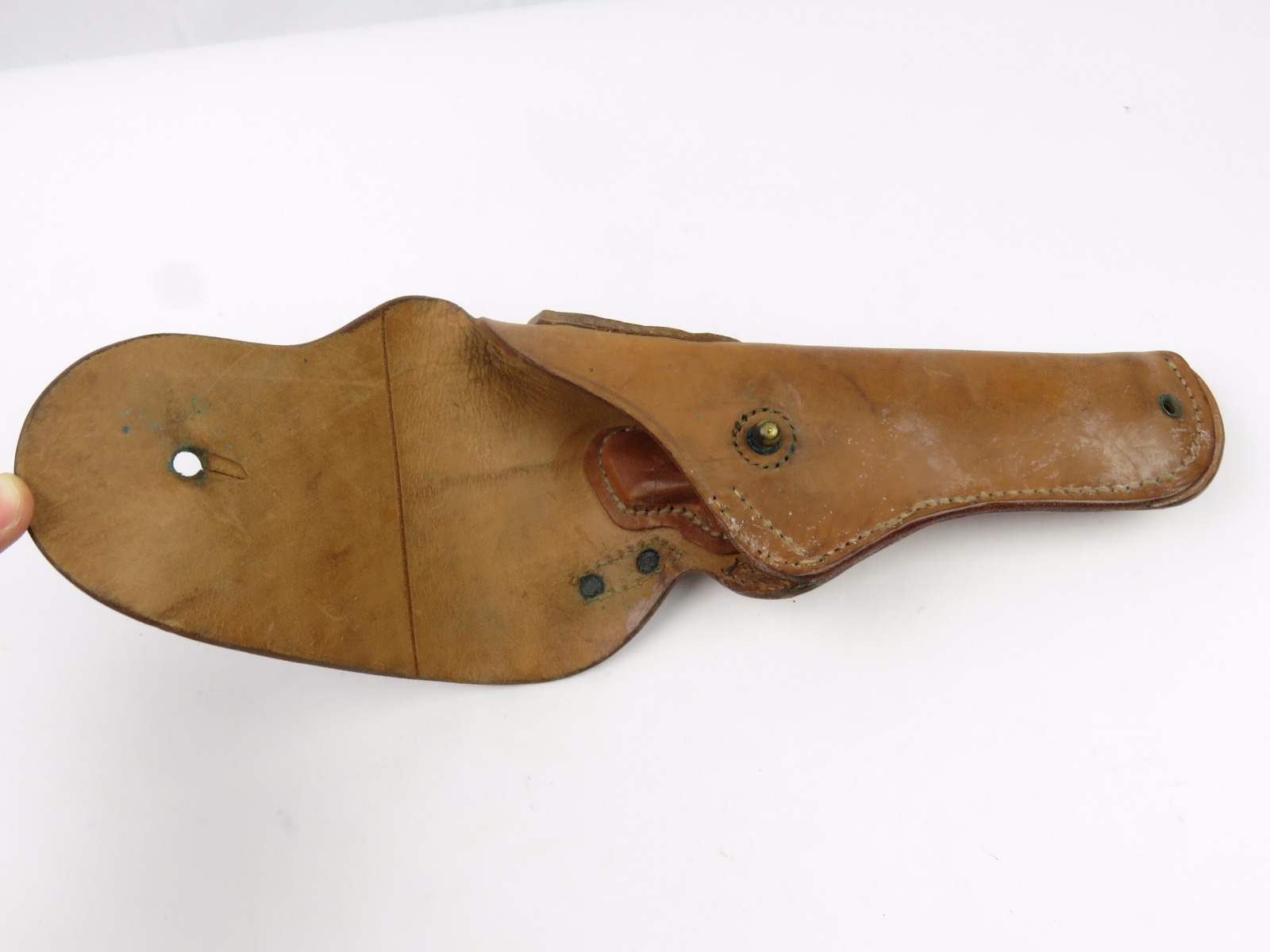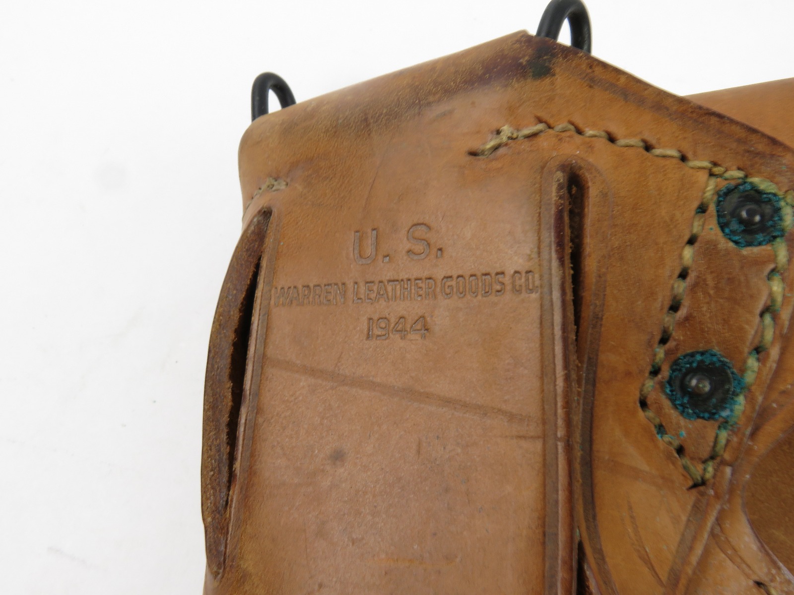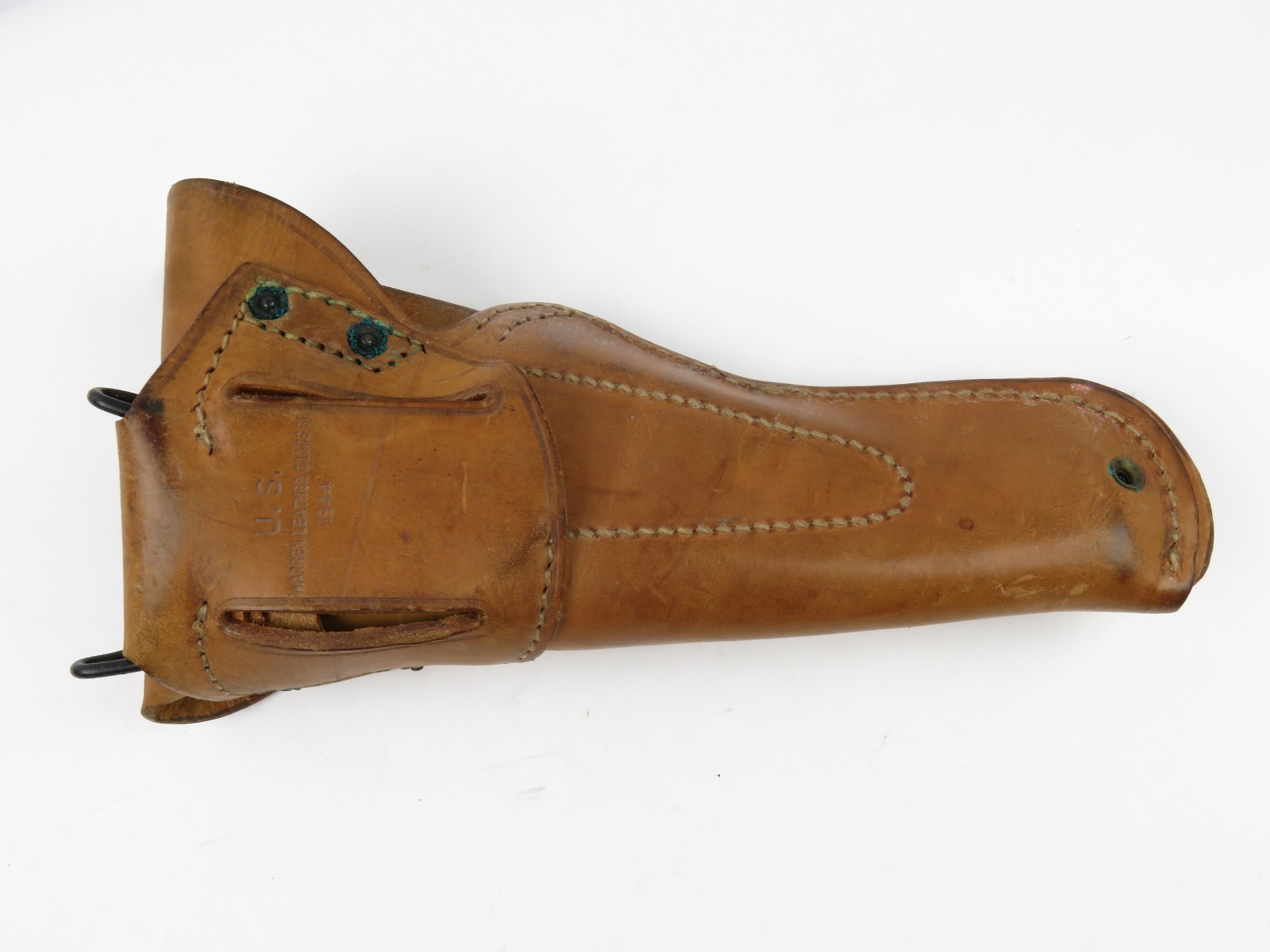 8/7/17 – This is an original late WW2 production 1911A1 holster. The holster is in minty condition, with beautiful strong leather. The light brown leather has some very light mold growing on the front near the toe – but this can easily be cleaned. The leather and stitching is all original and authentic. The back of the holster is maker stamped and dated. Guaranteed original.