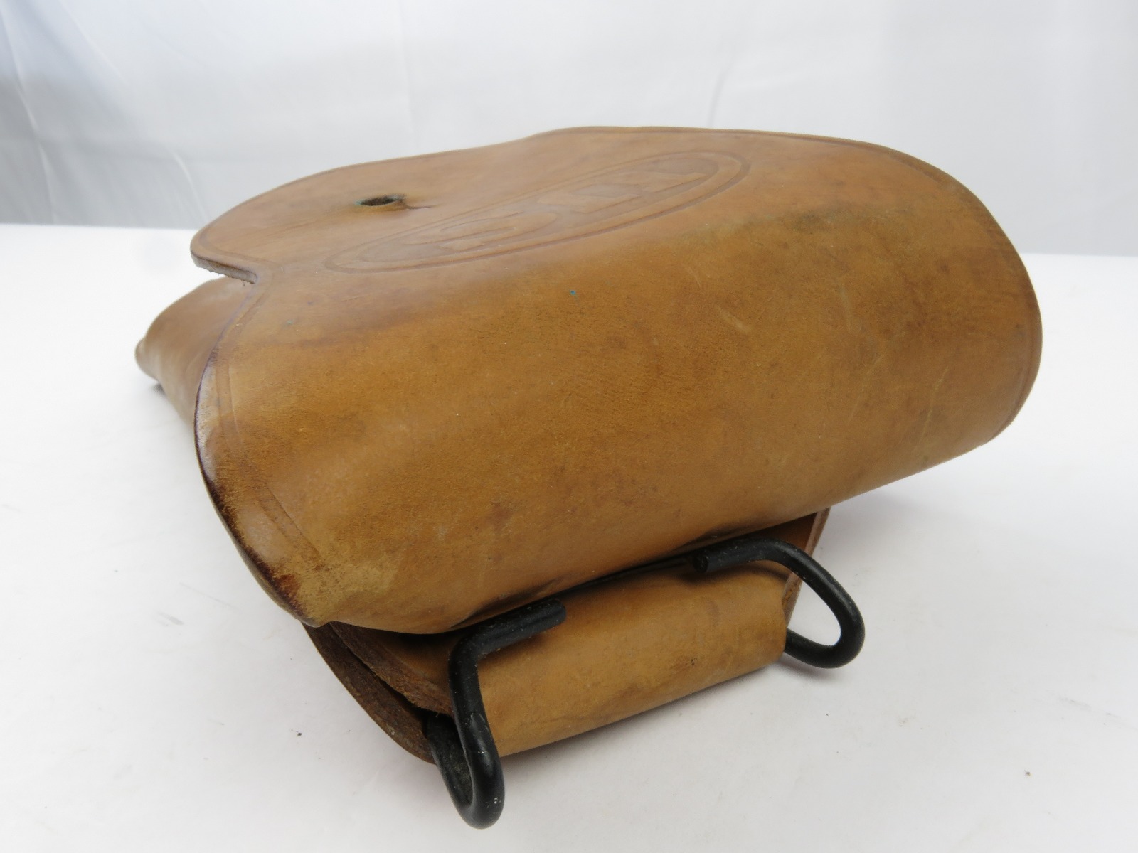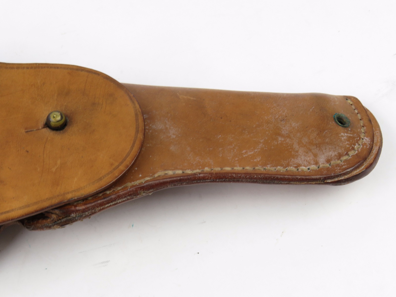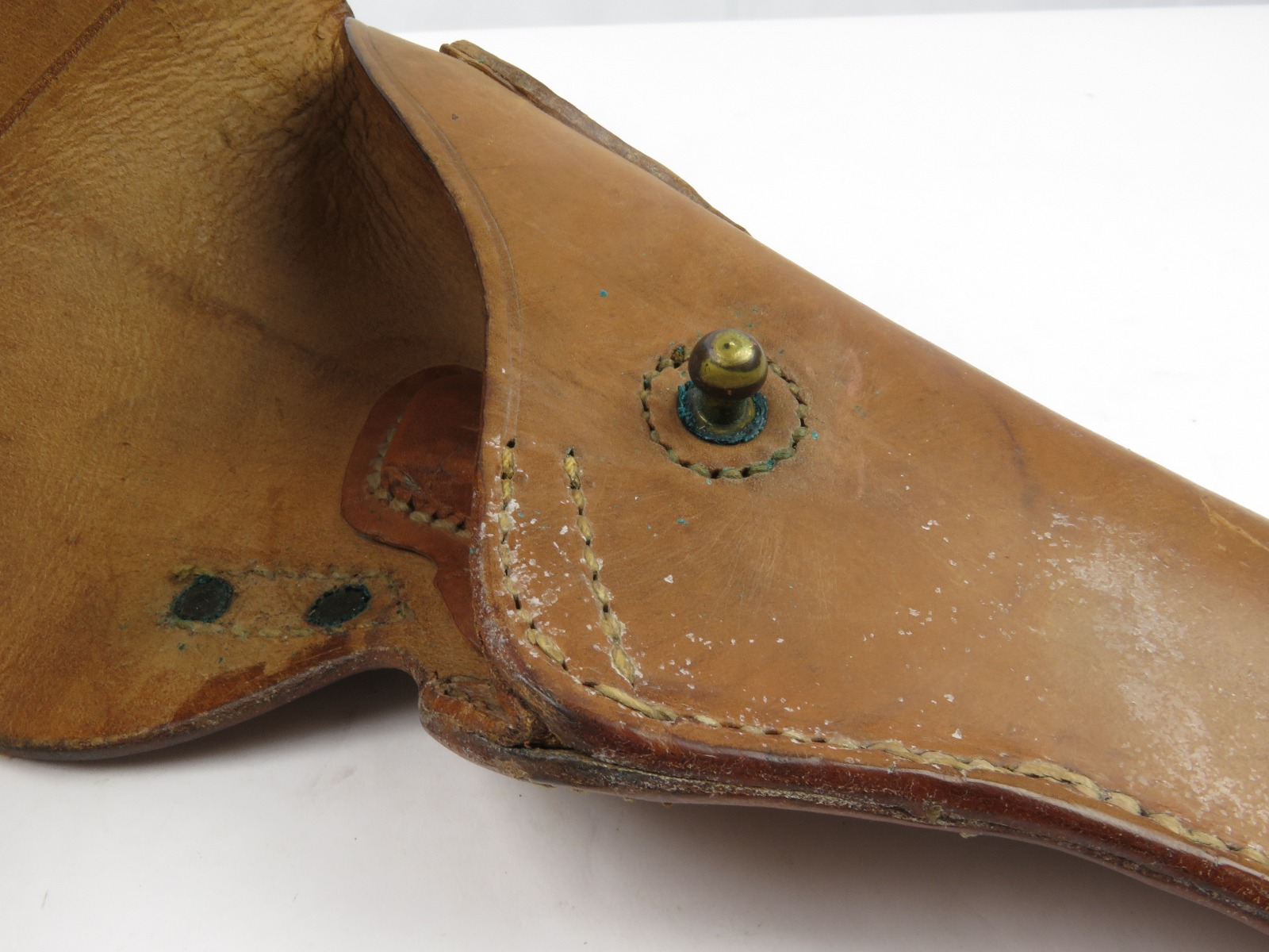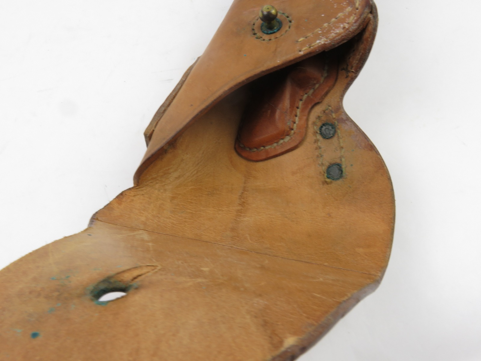 8/7/17 – This is an original late WW2 production 1911A1 holster. The holster is in minty condition, with beautiful strong leather. The light brown leather has some very light mold growing on the front near the toe – but this can easily be cleaned. The leather and stitching is all original and authentic. The back of the holster is maker stamped and dated. Guaranteed original.