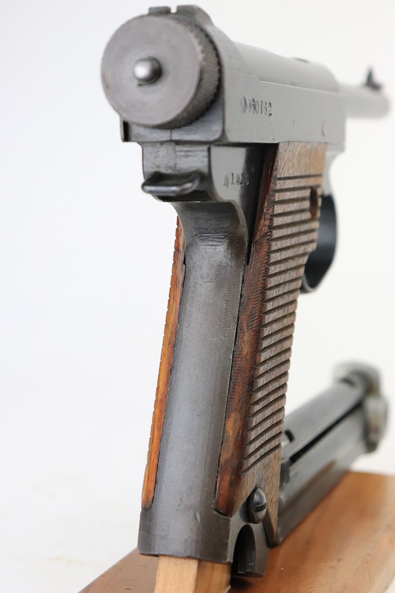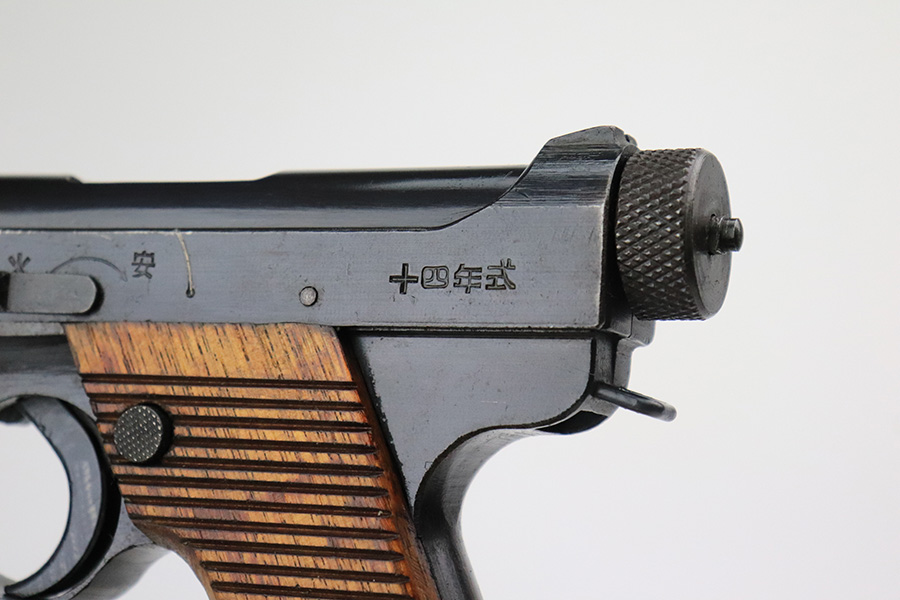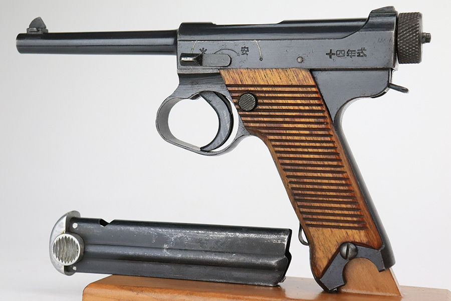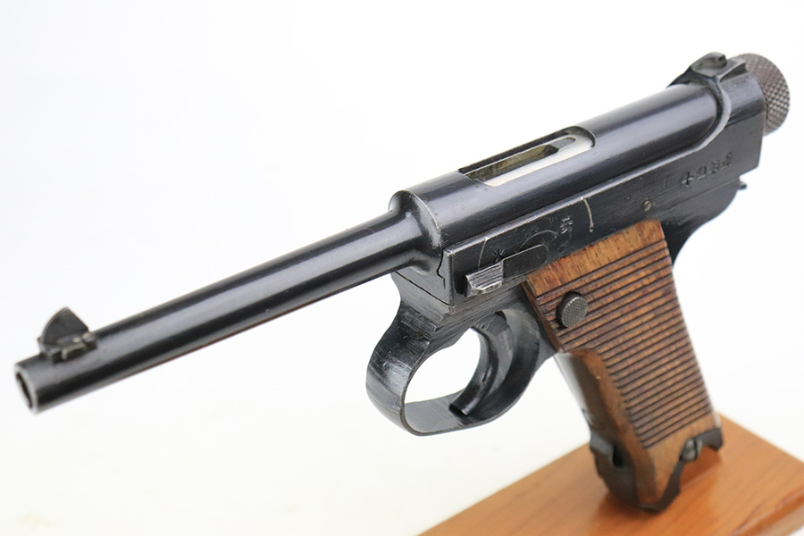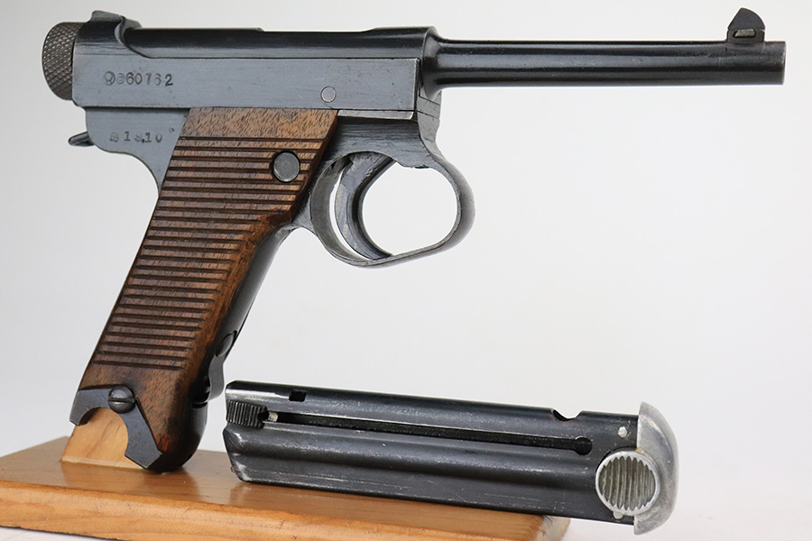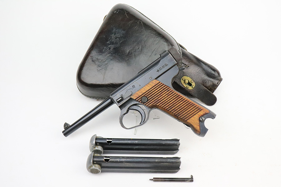 8/11/22 – This is a mint example of a Nambu Type 14 issued to the Japanese military in October of 1944. It is all matching and comes as a rig with two original matching-numbered magazines, a leather shoulder holster, cleaning rod, and a spare firing pin. The gun itself has retained virtually all of its original finish with a few tiny handling marks on both sides of the slide. Comes with minty matching-numbered wood grips. The bore is shiny with strong rifling and some light freckling here and there.