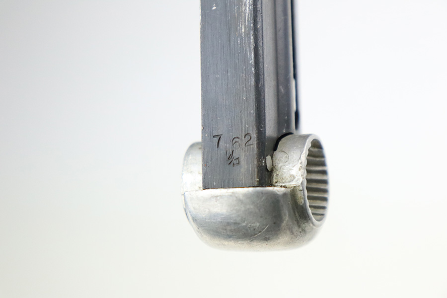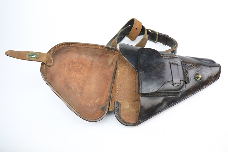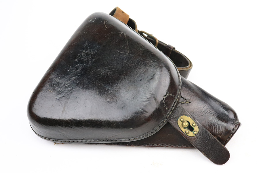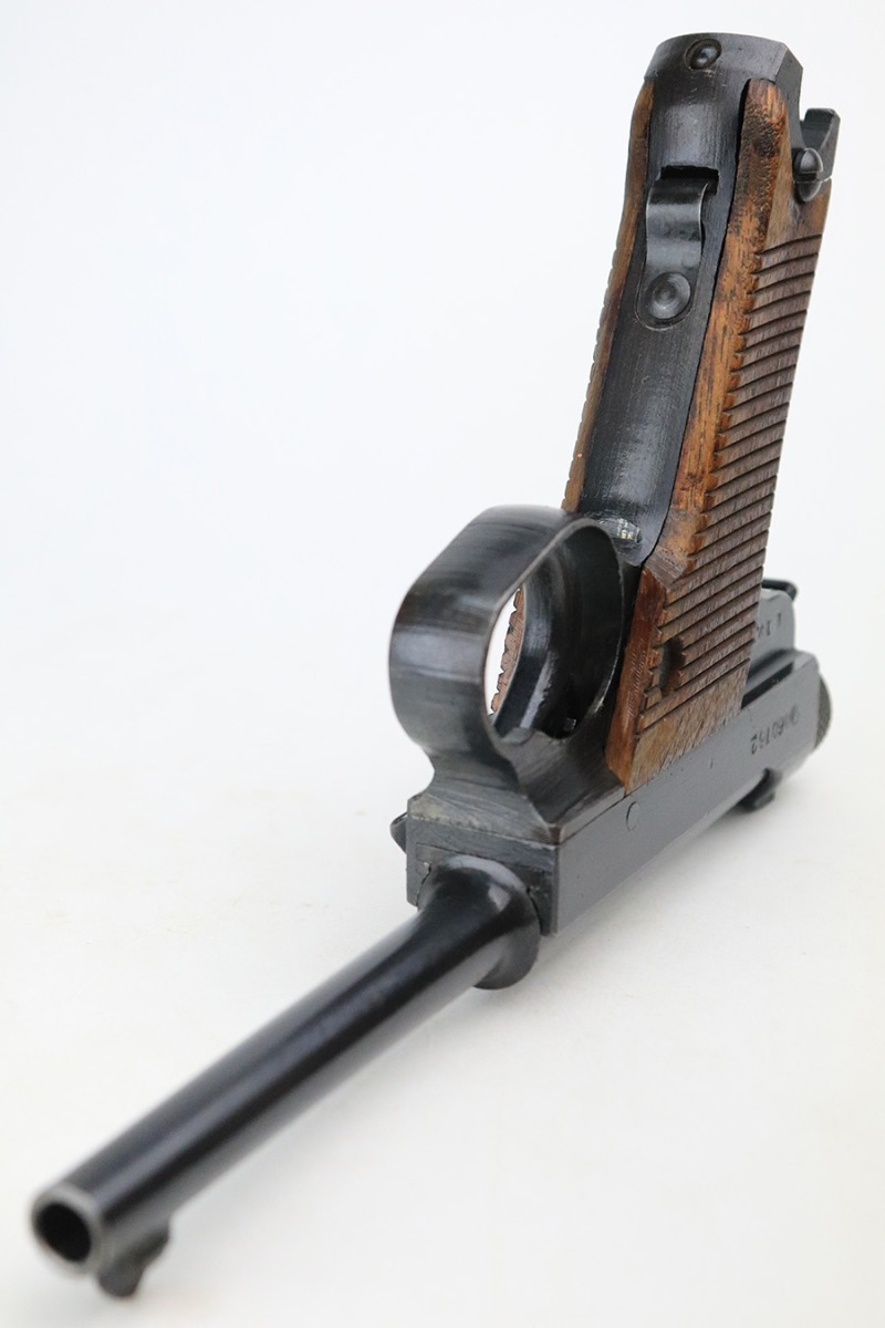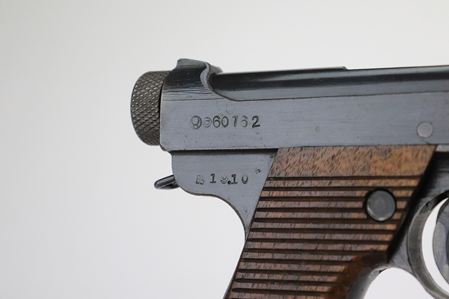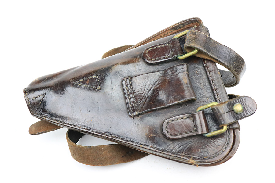 8/11/22 – This is a mint example of a Nambu Type 14 issued to the Japanese military in October of 1944. It is all matching and comes as a rig with two original matching-numbered magazines, a leather shoulder holster, cleaning rod, and a spare firing pin. The gun itself has retained virtually all of its original finish with a few tiny handling marks on both sides of the slide. Comes with minty matching-numbered wood grips. The bore is shiny with strong rifling and some light freckling here and there.