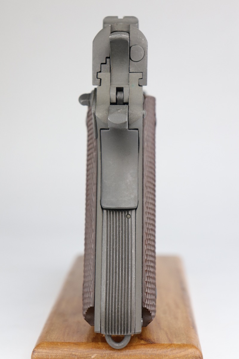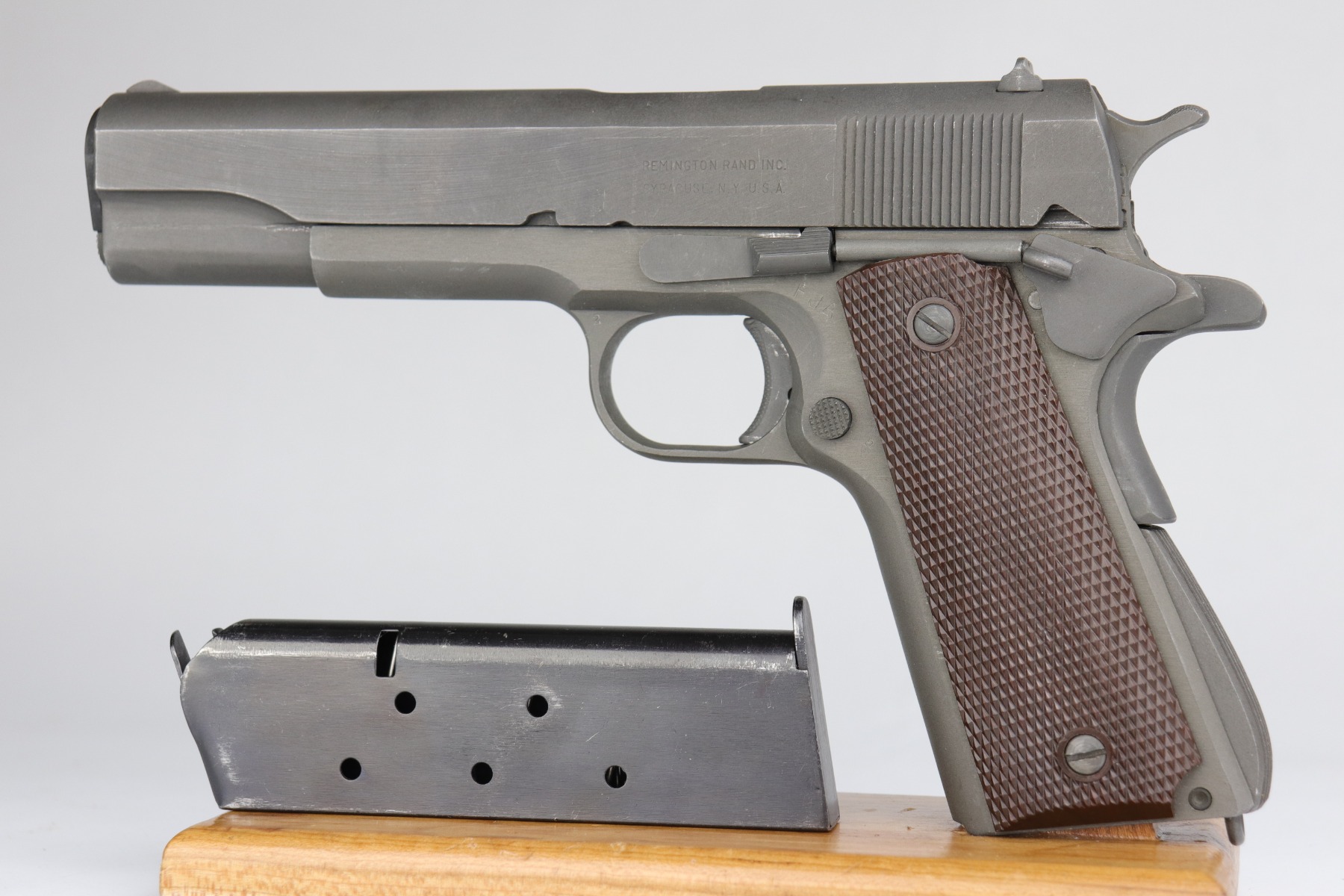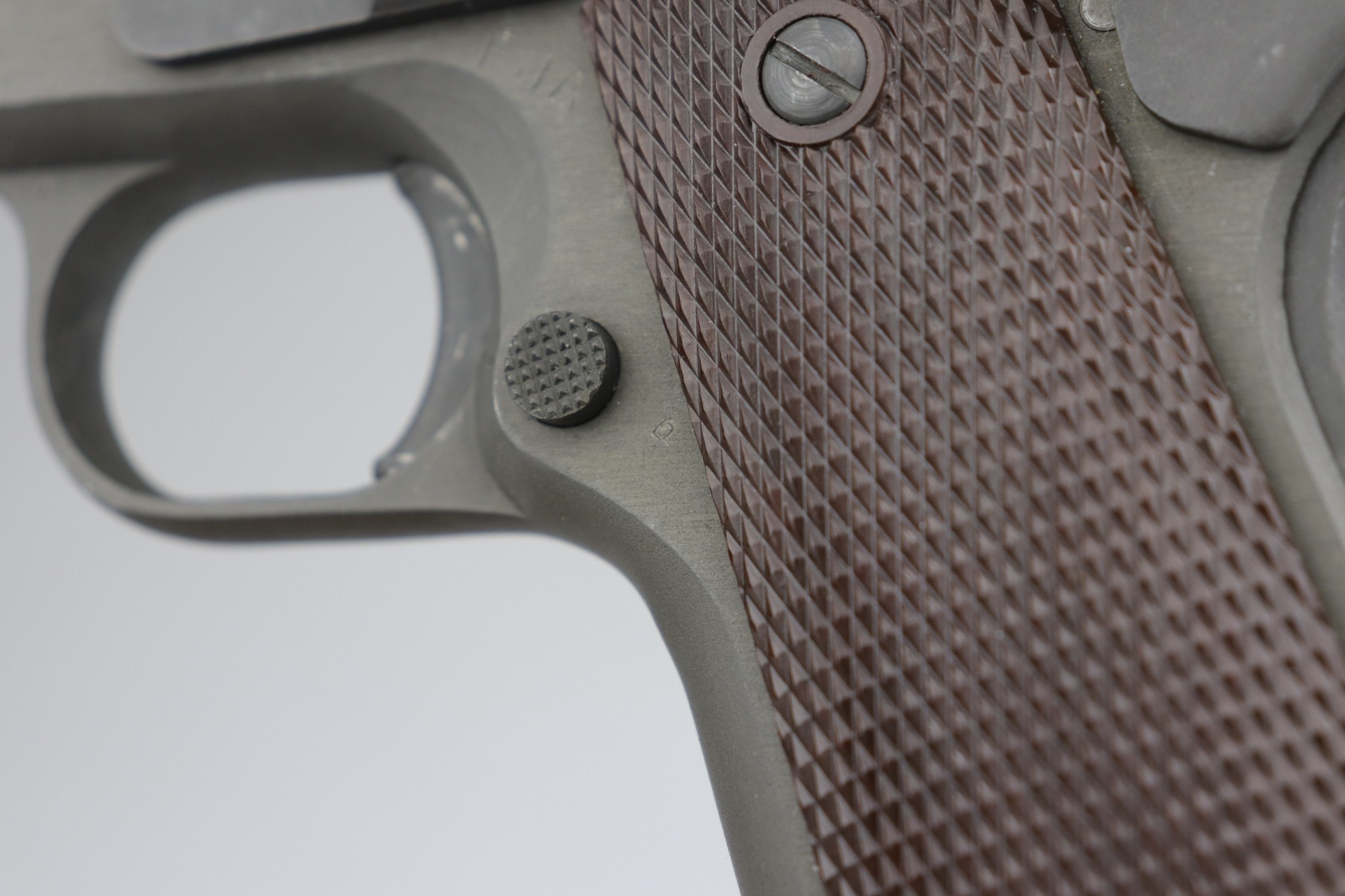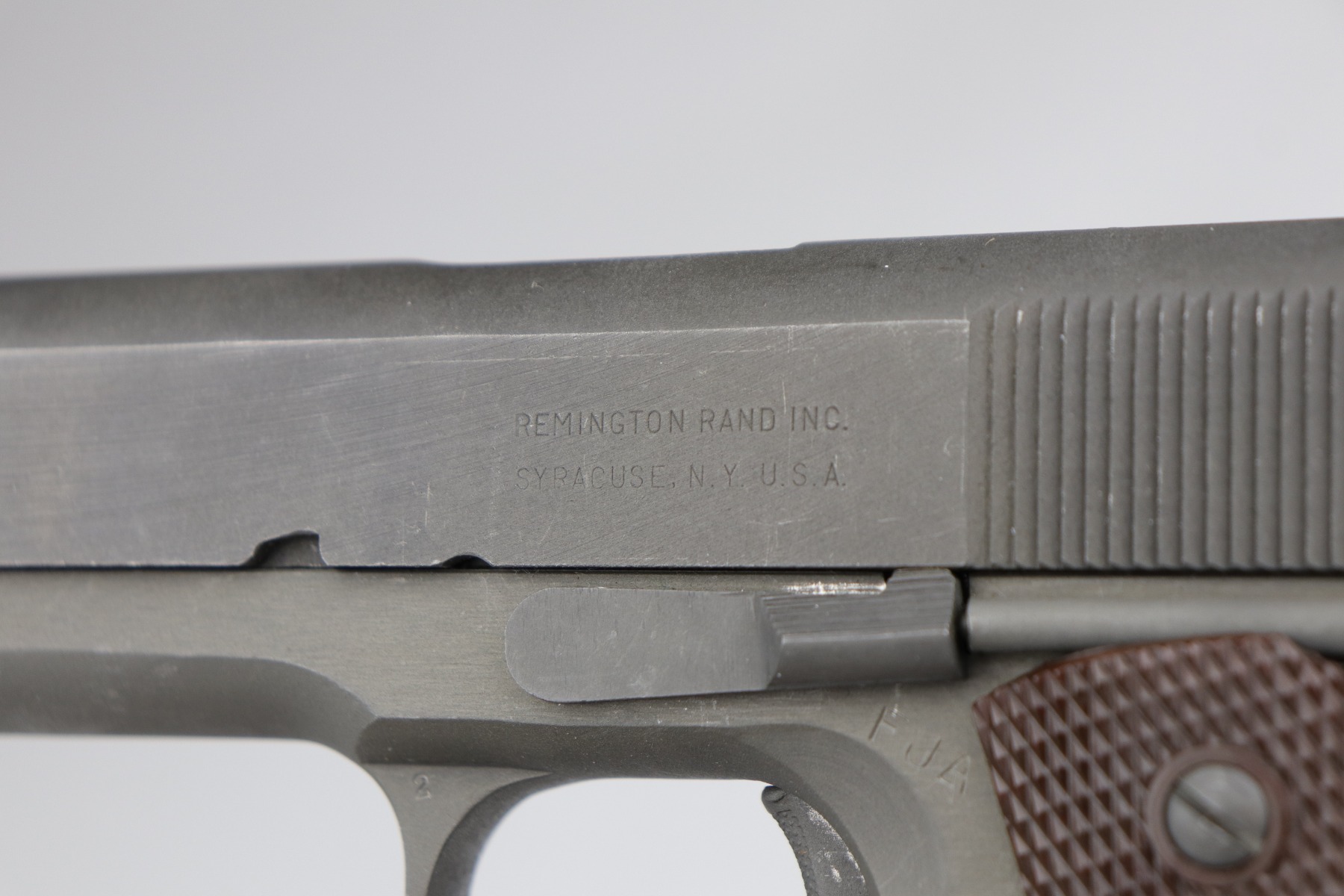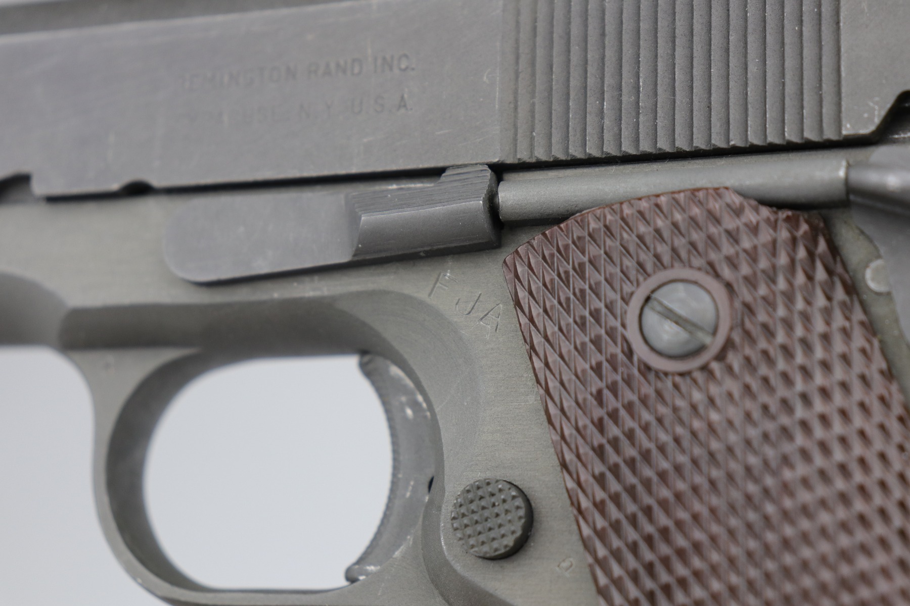 5/15/20 – This is a Mint example of an original WW2 US Military Remington Rand 1911A1 Pistol. From the serial number, this pistol was manufactured in 1945 and was actually one of the last Remington Rand’s made in WW2. This pistol has retained 99+% of its original finish. It has proper “P” proofs on the left side of the frame and on the top of the slide. It is “FJA” acceptance proofed. It also has the proper US Military cartouche on the right side of the slide. The bore is minty. The gun functions properly. The barrel has “HS” and “P” markings.