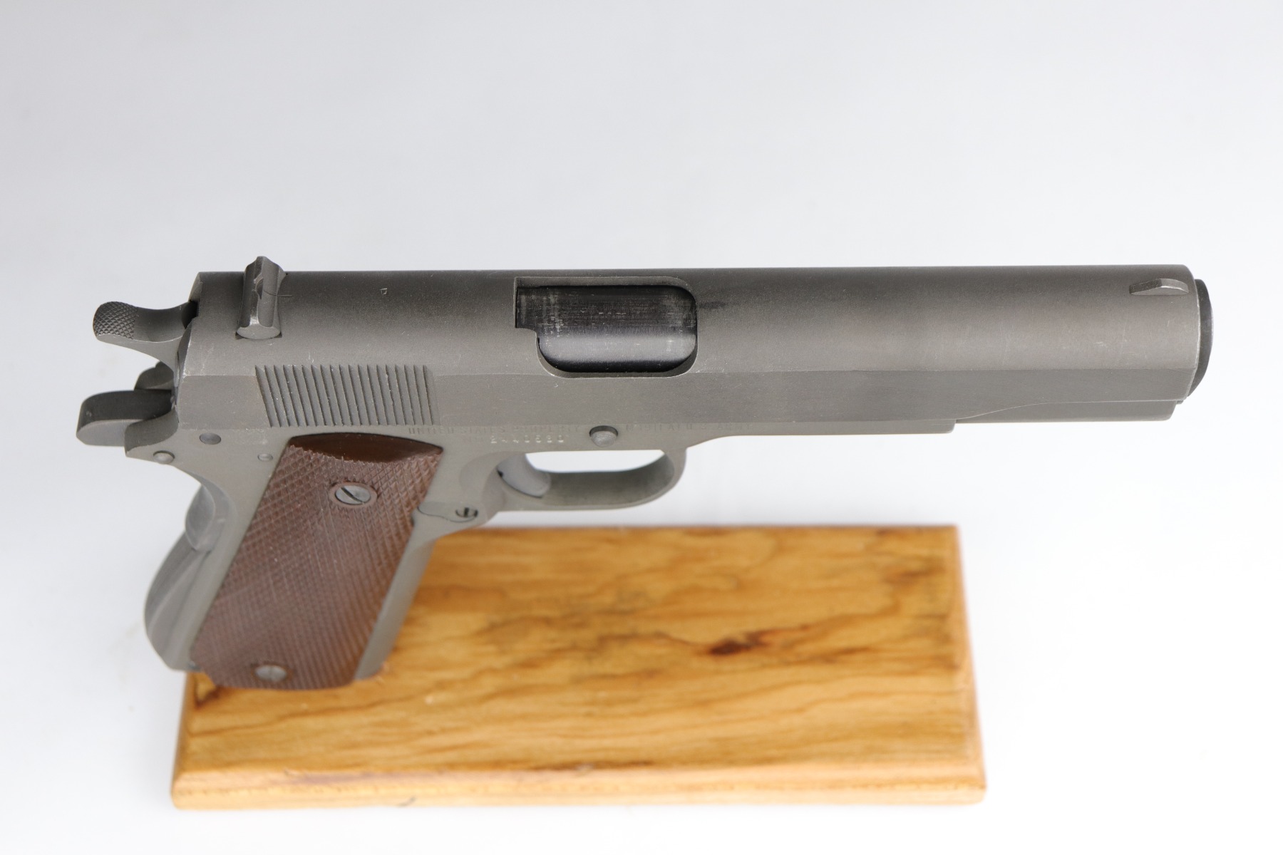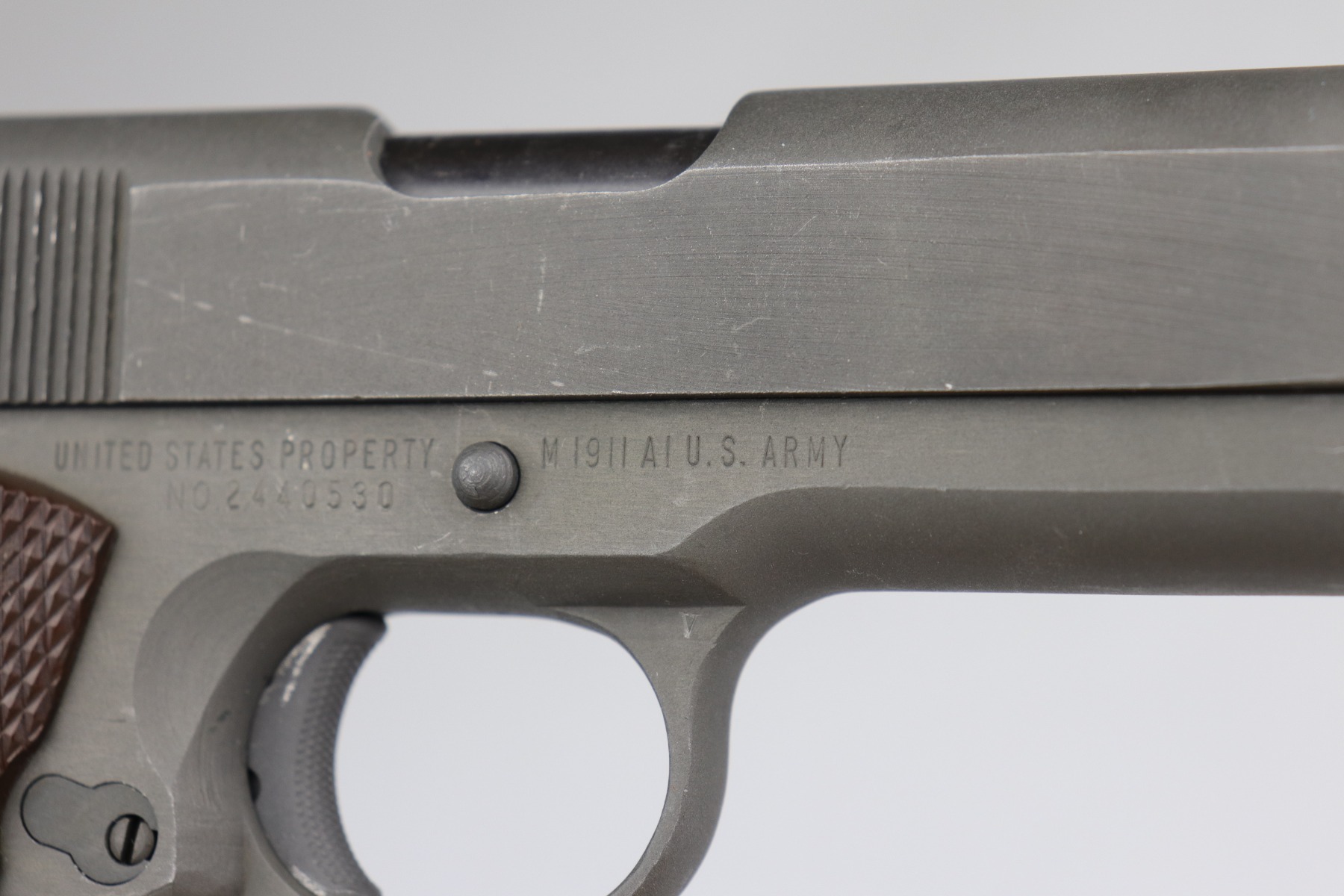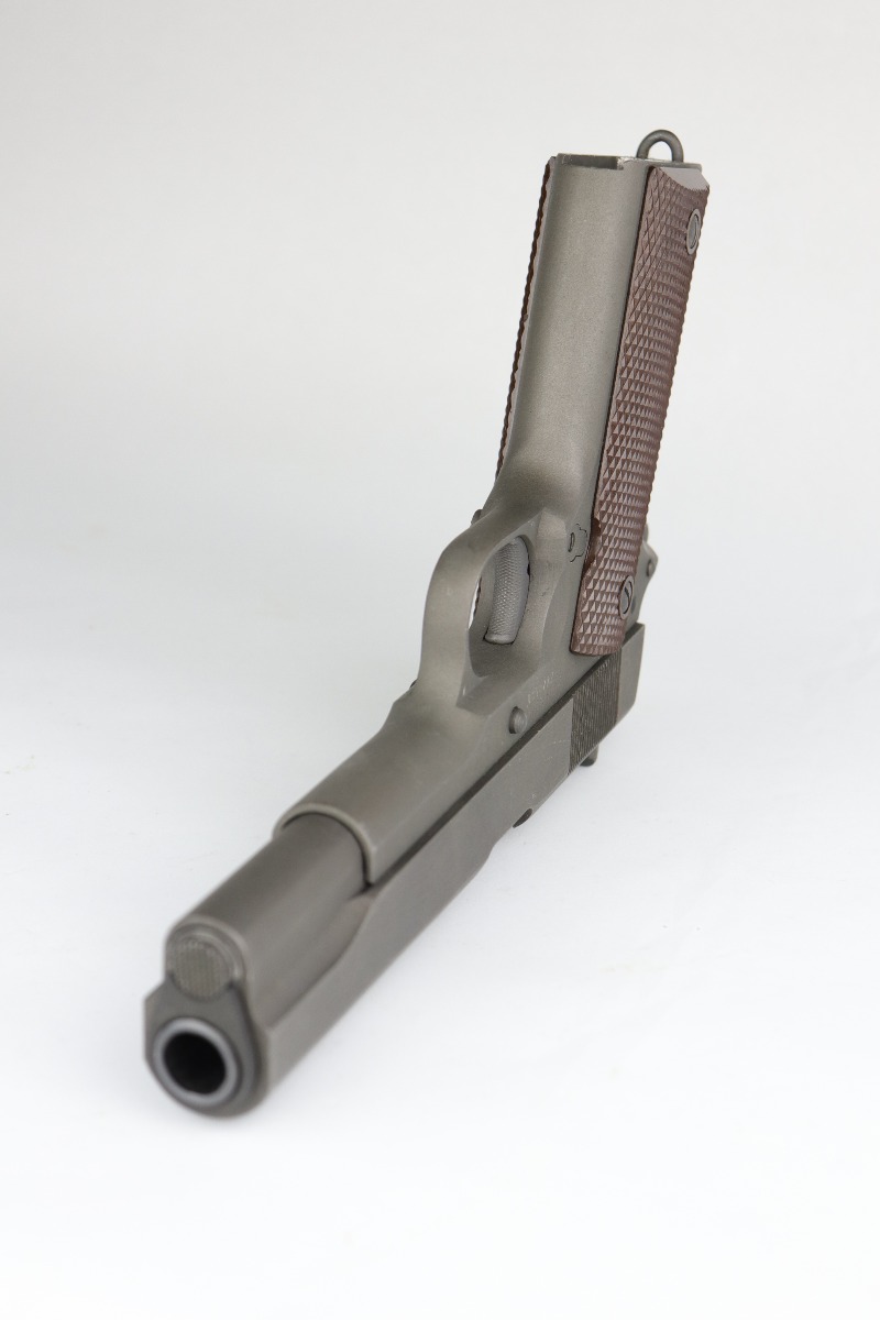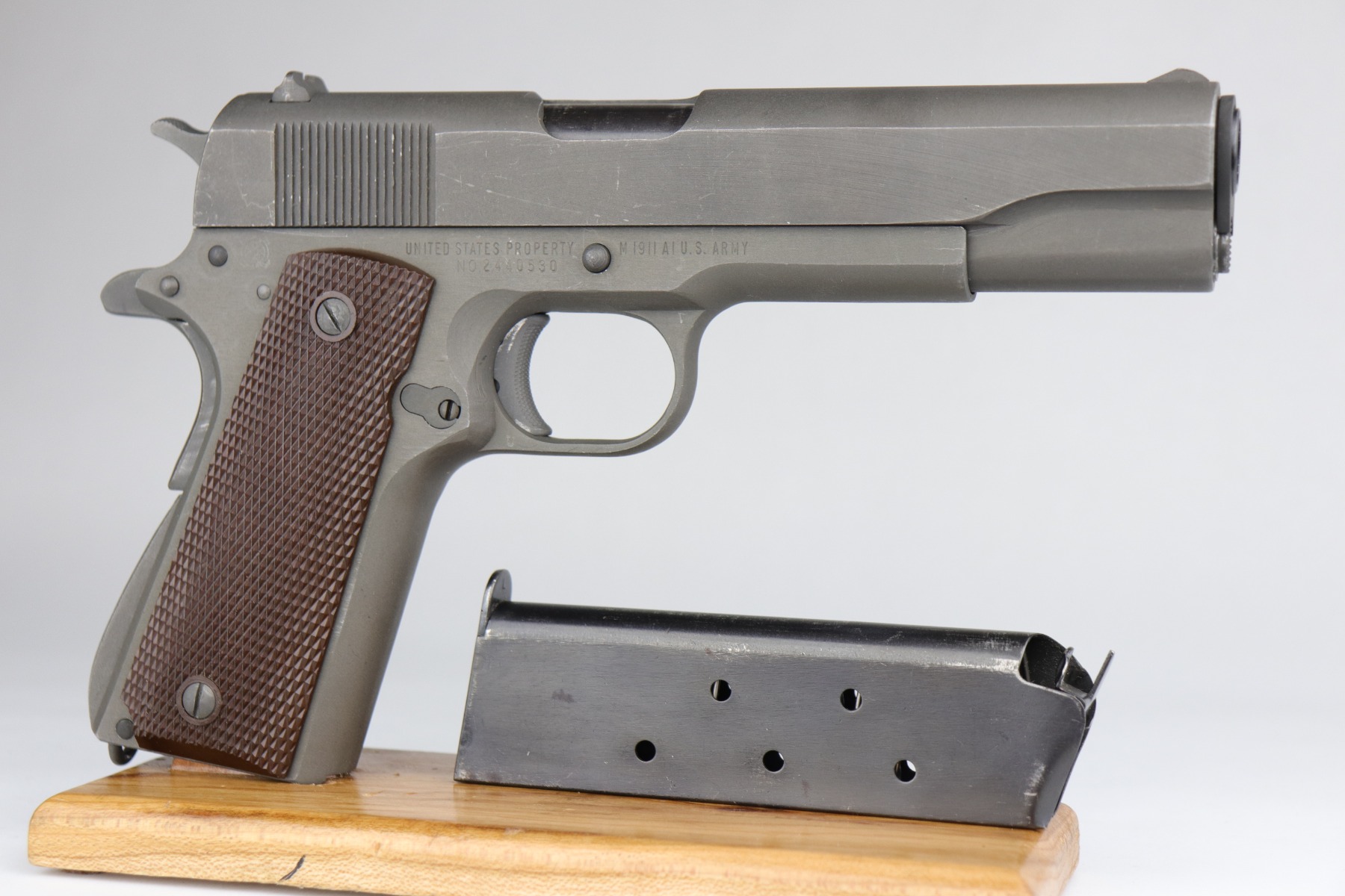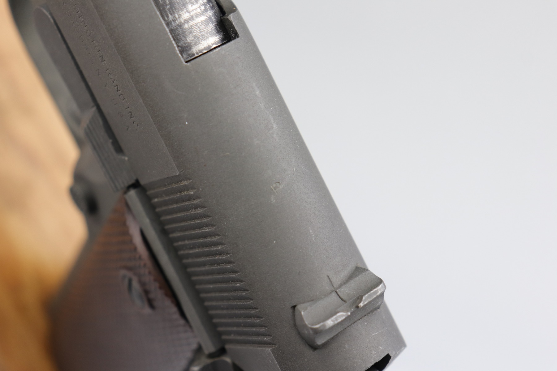5/15/20 – This is a Mint example of an original WW2 US Military Remington Rand 1911A1 Pistol. From the serial number, this pistol was manufactured in 1945 and was actually one of the last Remington Rand’s made in WW2. This pistol has retained 99+% of its original finish. It has proper “P” proofs on the left side of the frame and on the top of the slide. It is “FJA” acceptance proofed. It also has the proper US Military cartouche on the right side of the slide. The bore is minty. The gun functions properly. The barrel has “HS” and “P” markings.