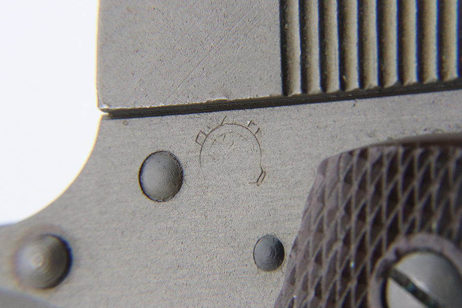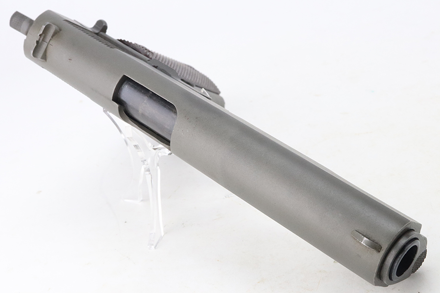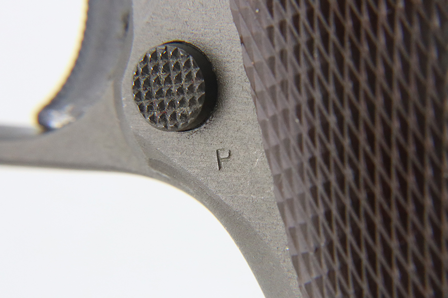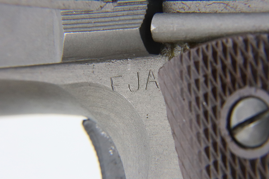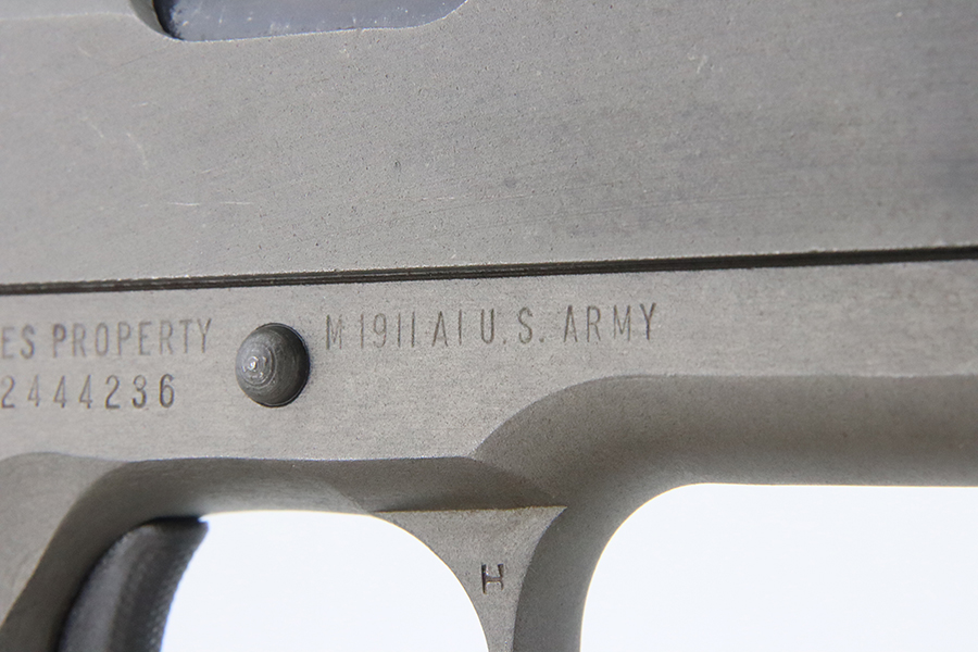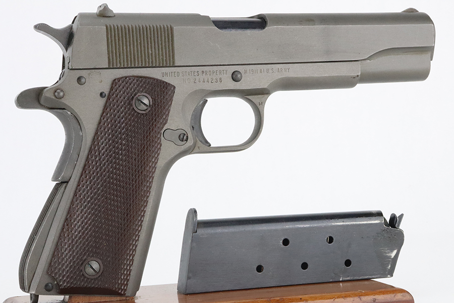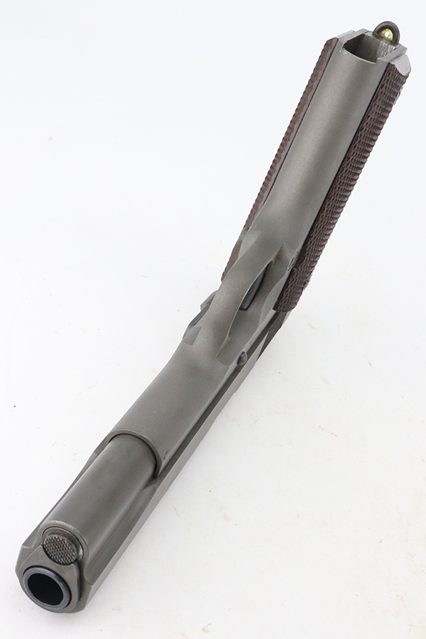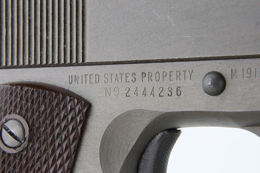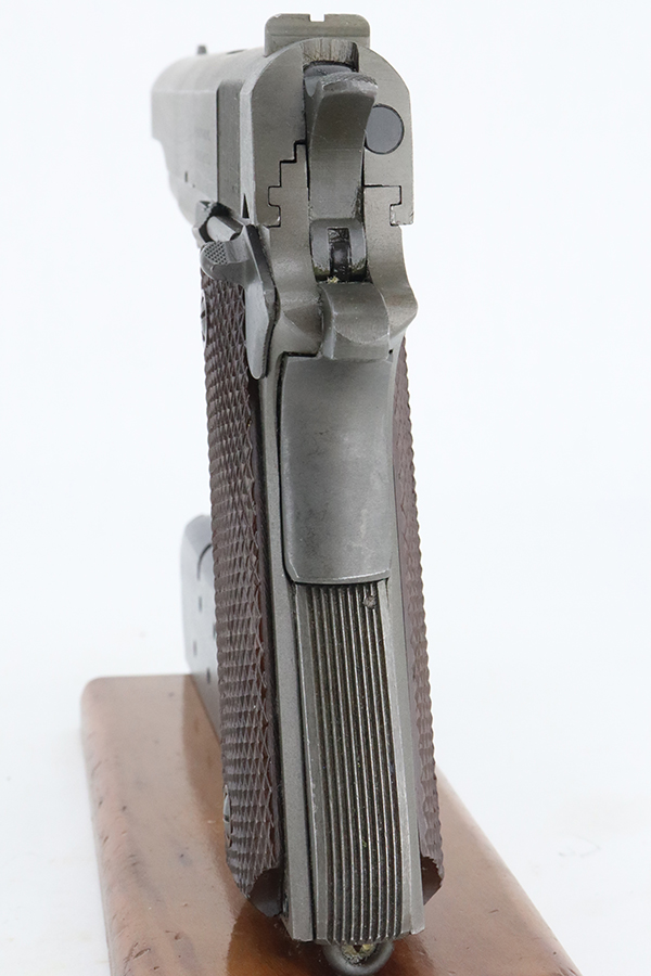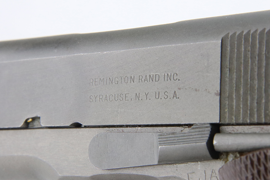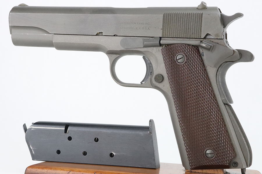 4/18/24 – This is a mint example of a Remington Rand Model 1911A1 issued to the US military in 1945. It is all correct and has a proper “HS” High Standard barrel. It has retained essentially all of its parkerized finish with some small spots of minor discoloration here and there along the slide. Fitted with period-correct reddish plastic grips and comes with a proper “R” marked magazine. Mint bore.