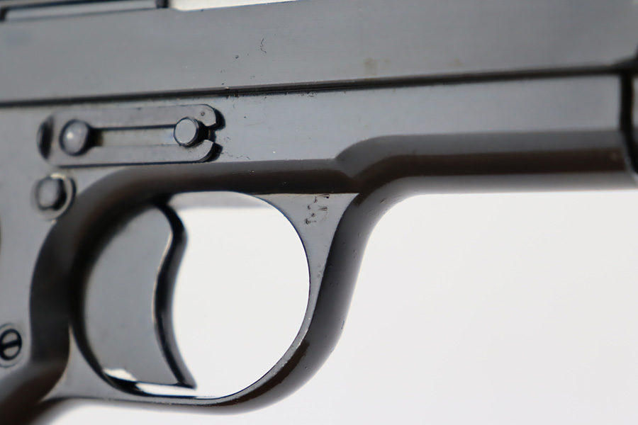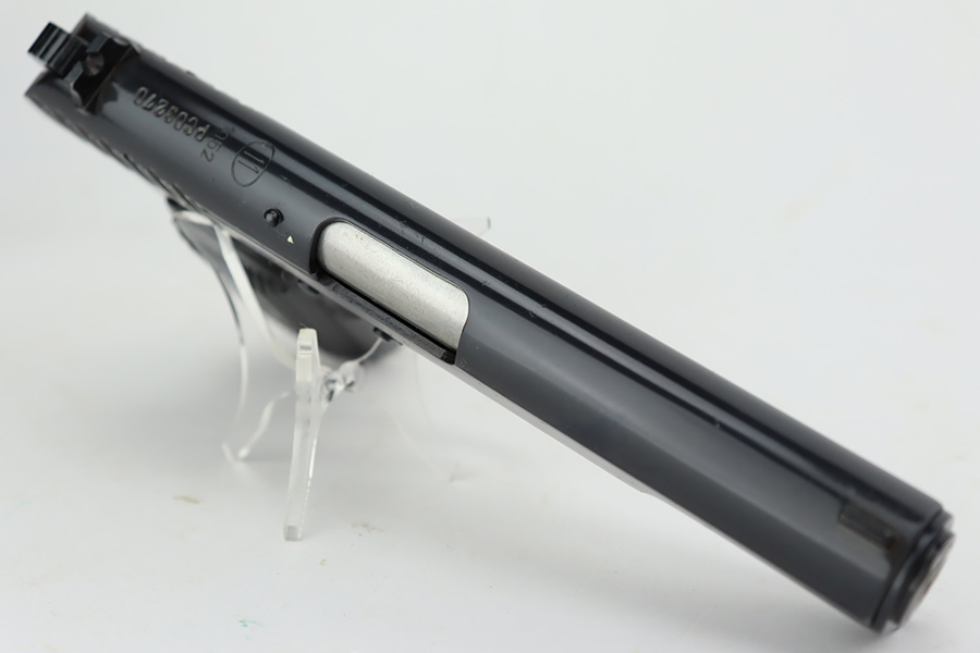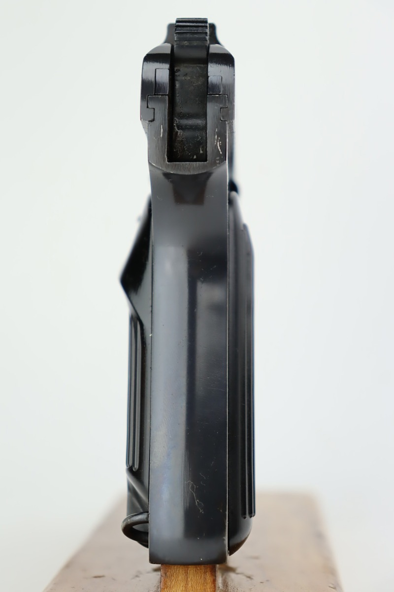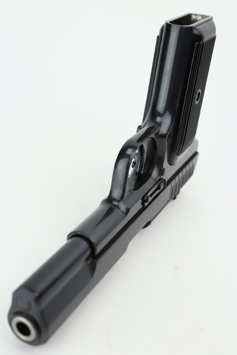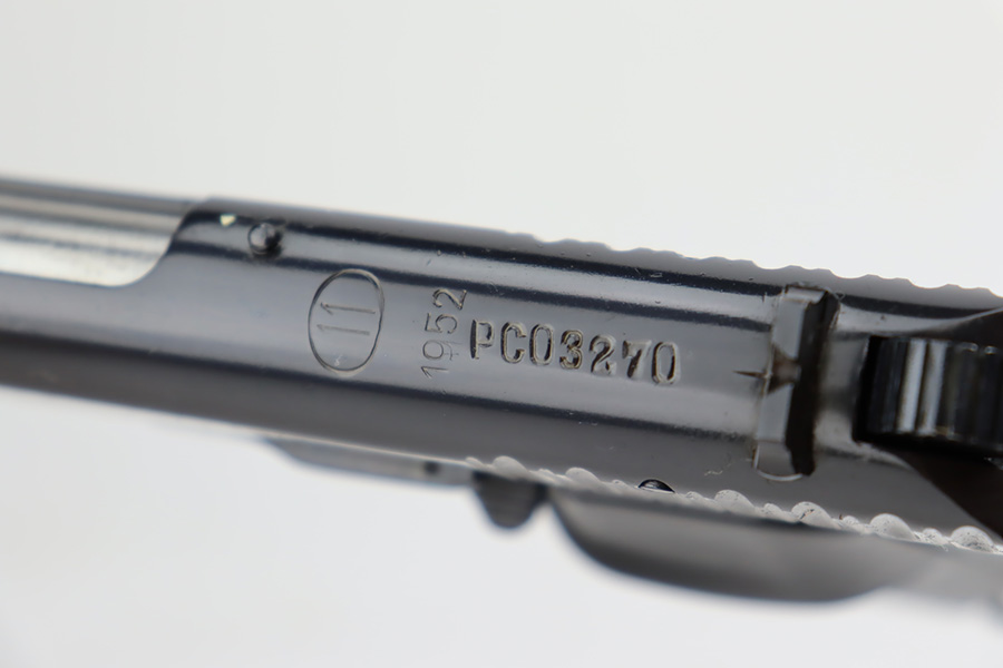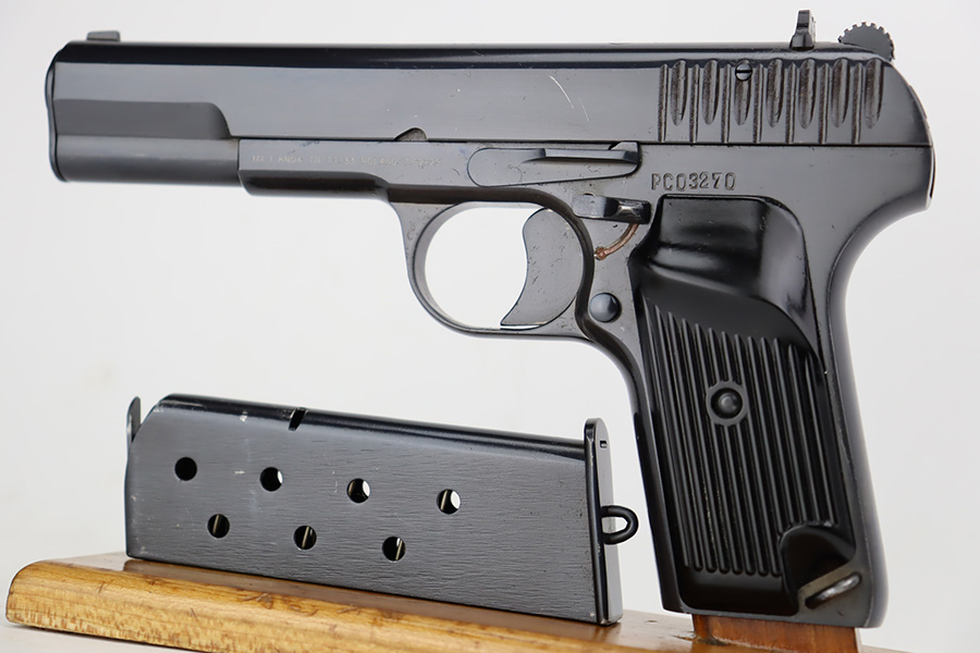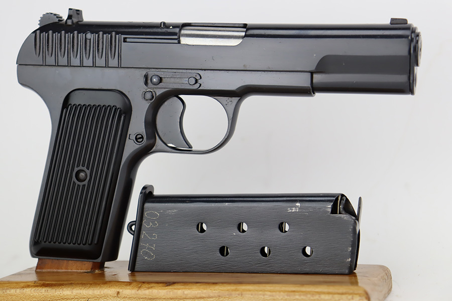 8/29/23 – This is a mint example of a Tokarev TT-33 manufactured in the Polish Radom Factory in 1952. All matching with an import mark on the left side of the frame. It has retained virtually all of its bluing with just a couple of very light scratches. Fitted with excellent black plastic grips and comes with one matching magazine. The bore has good rifling, but there is minor pin-pricking throughout.