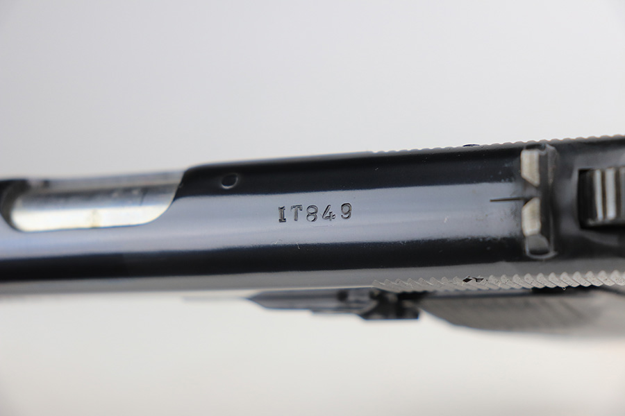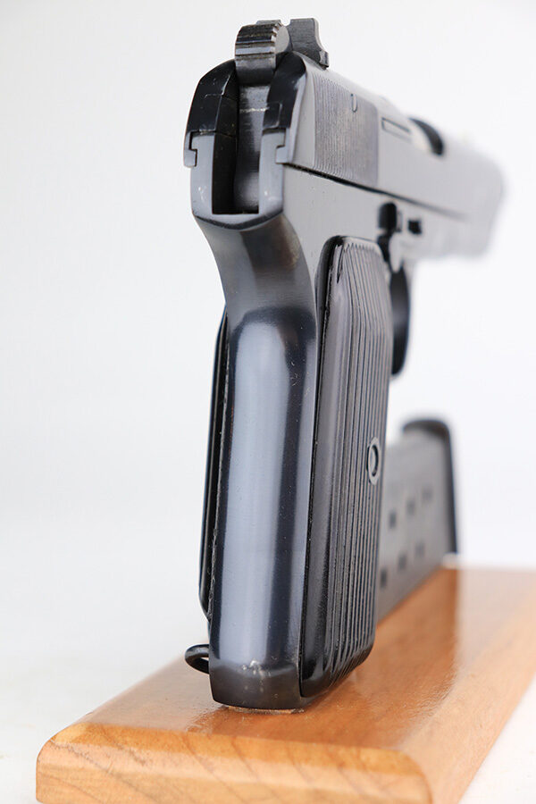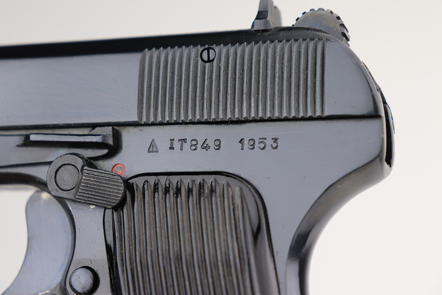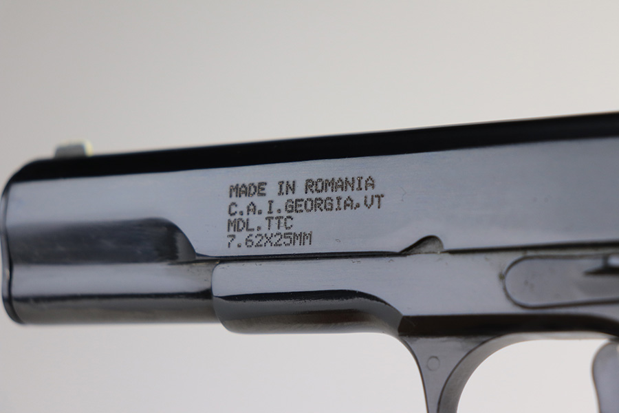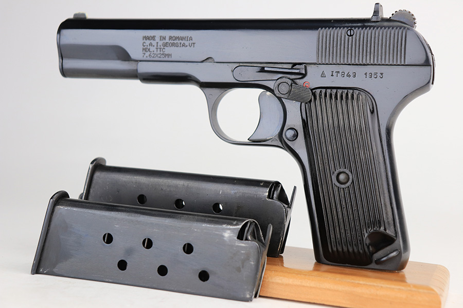 1/4/22 – This is a mint example of a Romanian Tokarev TTC manufactured in 1953. It is all matching and has an import mark on the left side of the slide. It has retained virtually all of its bluing with just the slightest hints of wear on some of the high edges. Comes with excellent black plastic grips and two proper magazines (mismatched to the gun). The bore is mint.