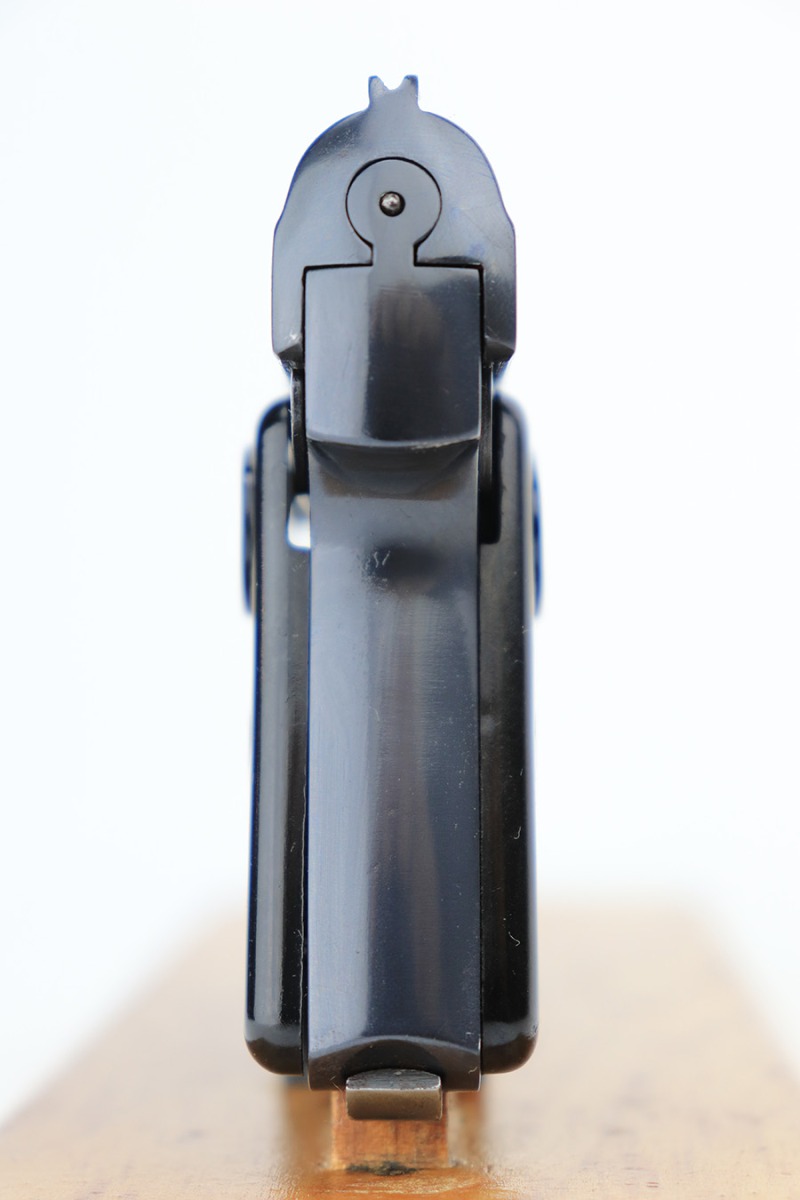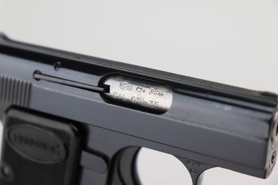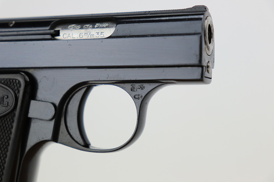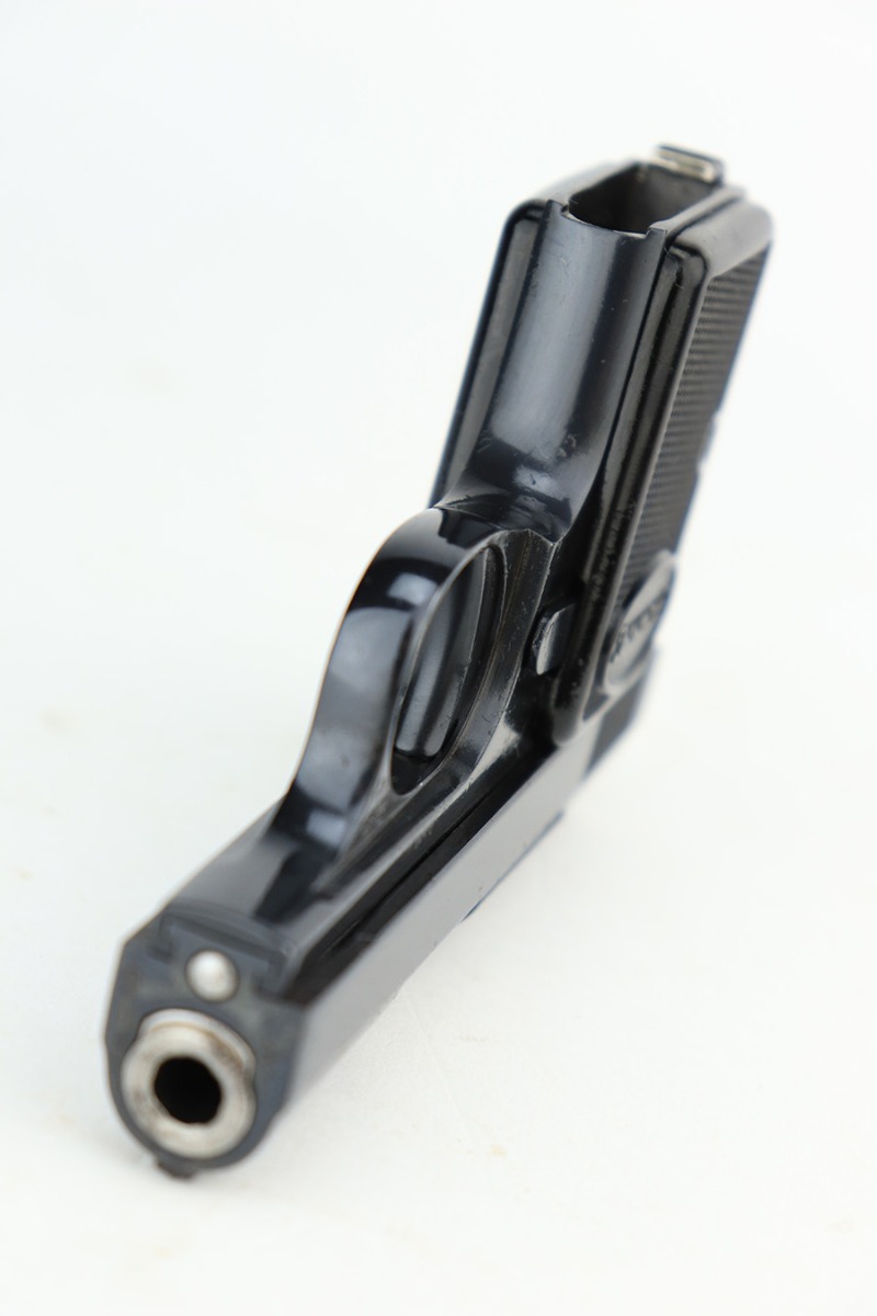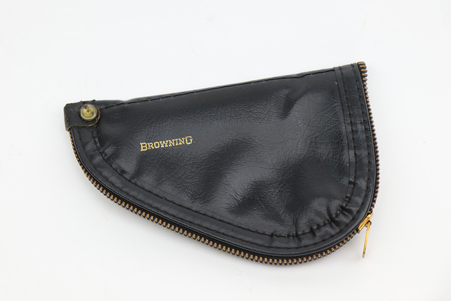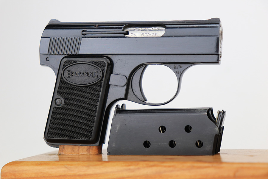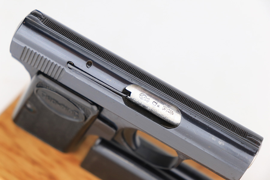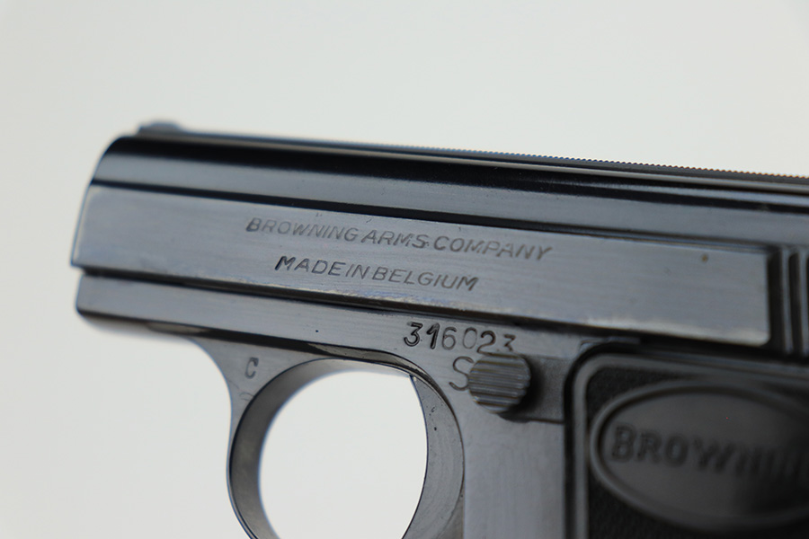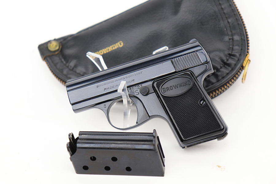 5/19/23 – This is a like-new example of a Baby Browning, manufactured in Belgium in 1965 and chambered in 6.35mm or .25 ACP. It is all matching and has the proper Belgian proofs. It comes with its original factory soft case and two magazines. The gun is mint with no signs of wear or use. Fitted with excellent black plastic grips. The bore is like-new.