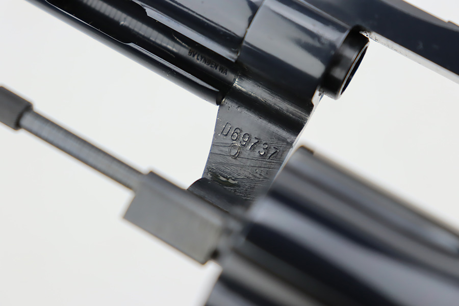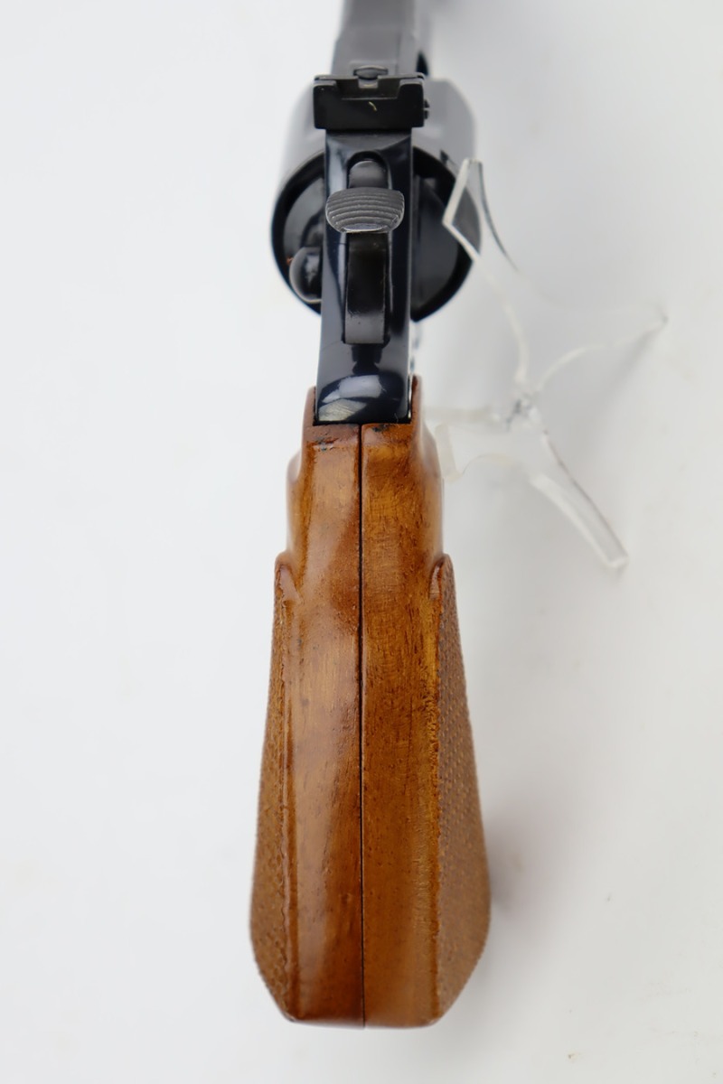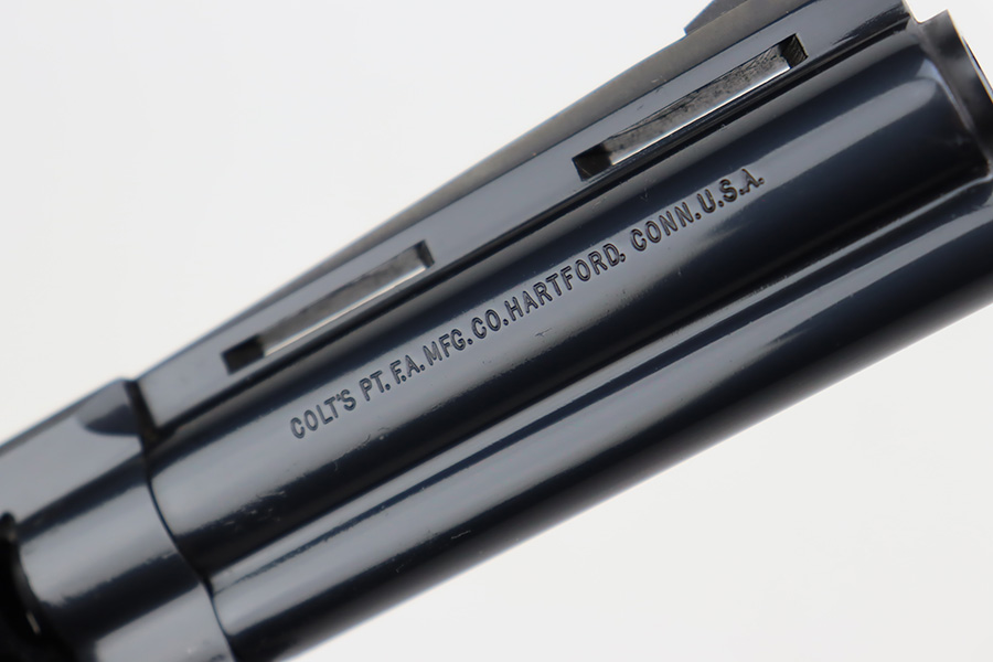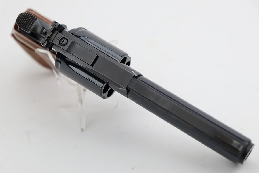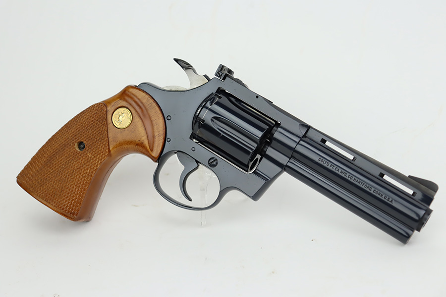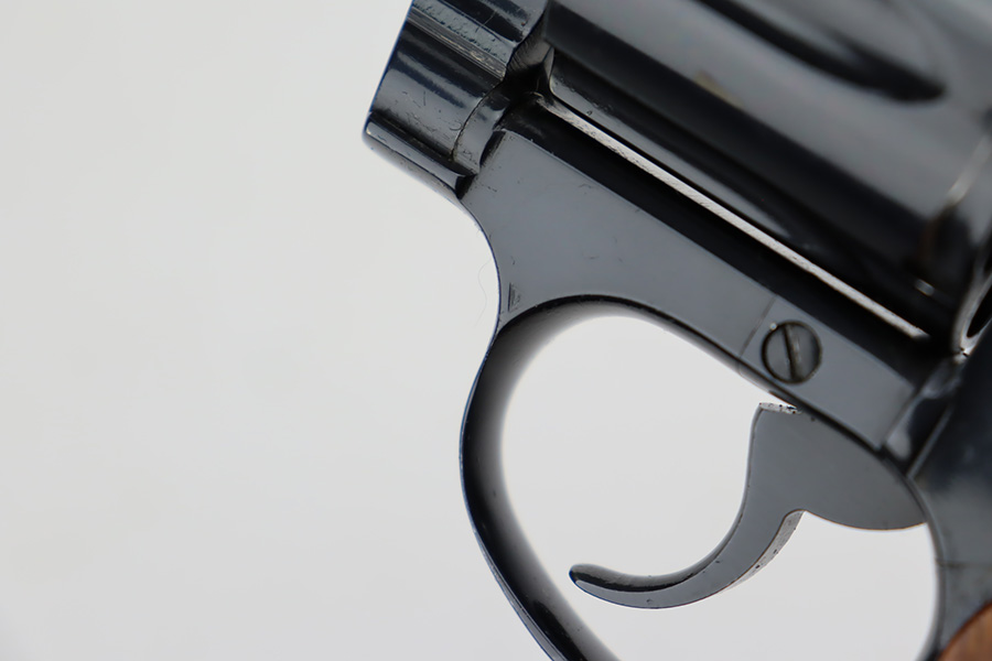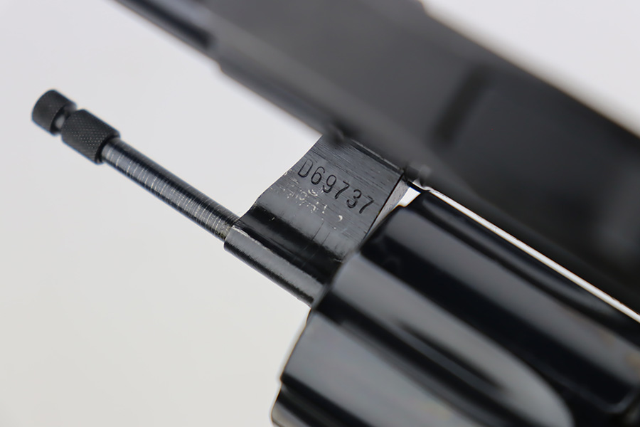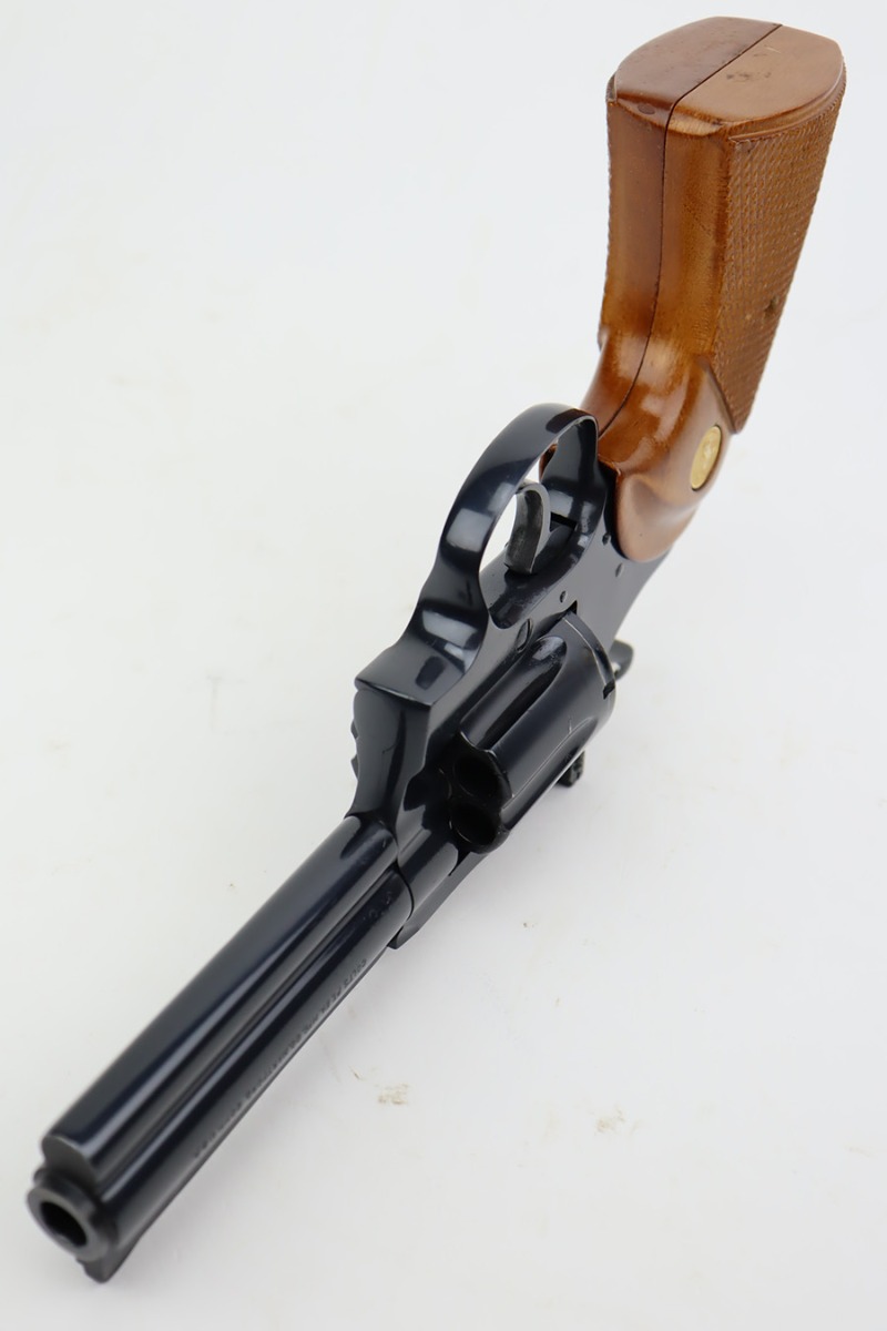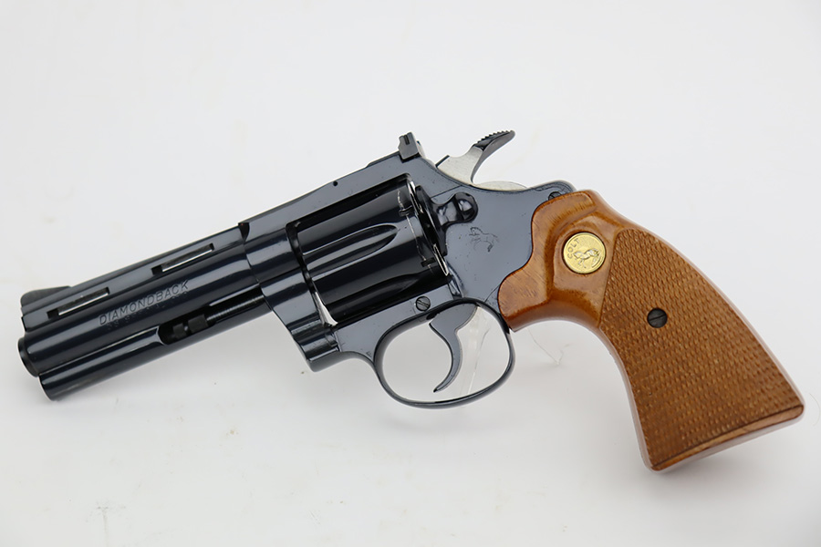 9/6/23 – This is a mint example of a Colt Diamondback revolver, manufactured in 1975 and chambered in .38 Special. It is all matching and has virtually no signs of wear – just a very light roll mark on the cylinder. Beautiful Colt high polish bluing. Fitted with beautiful blonde wood grips. Mint bore. There is a tiny import mark on the inside of the well for the ejector rod.