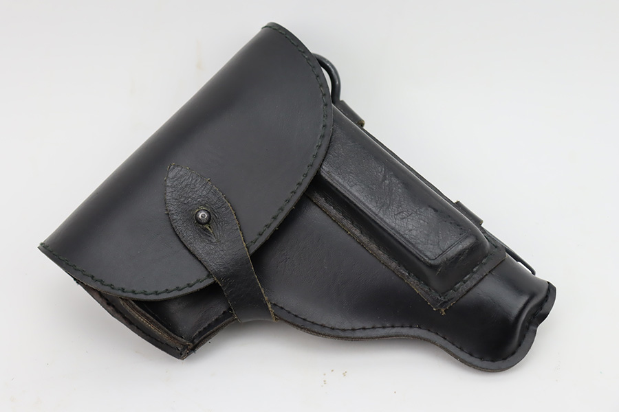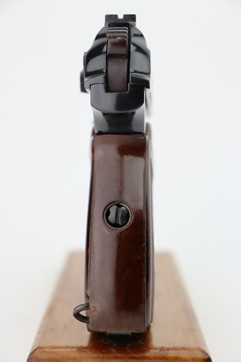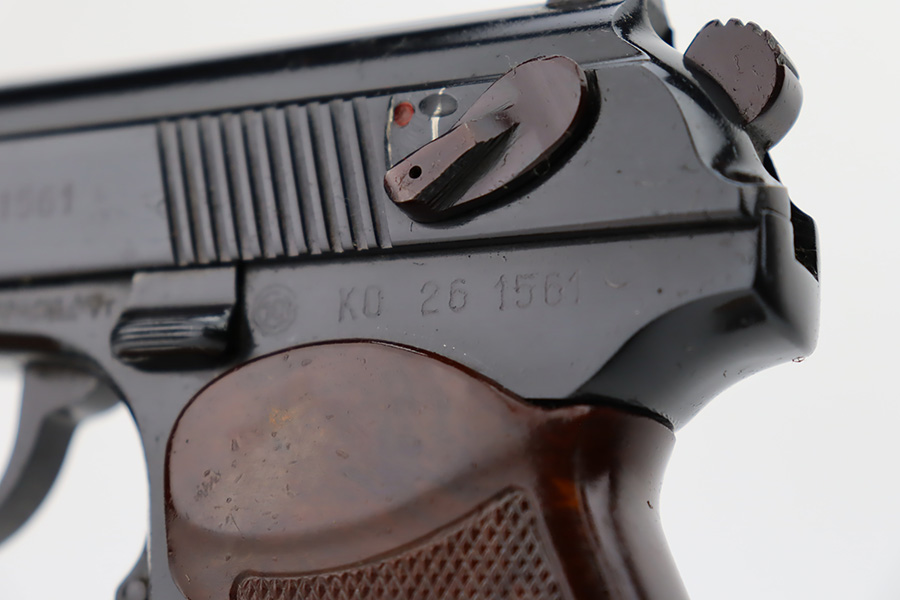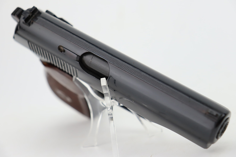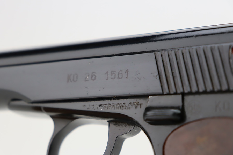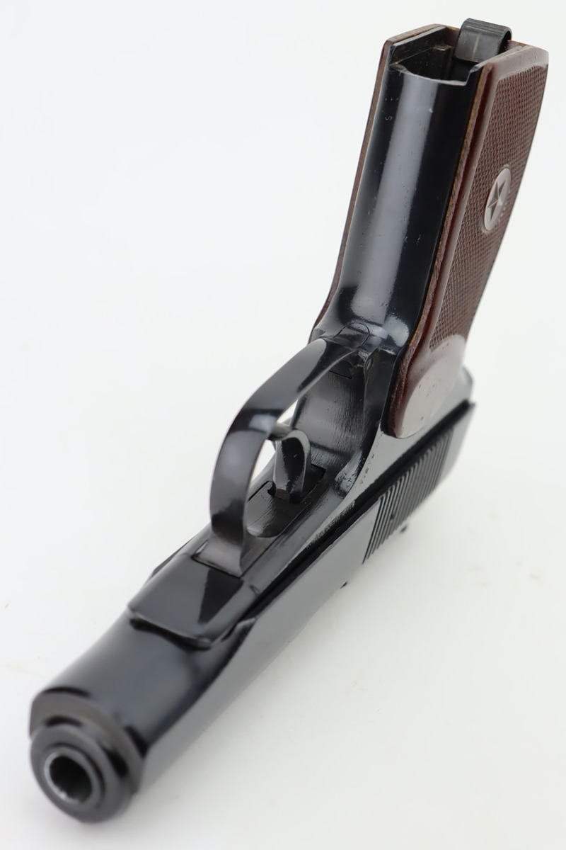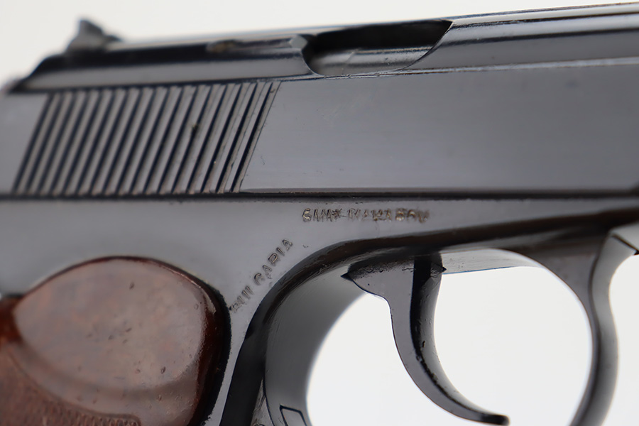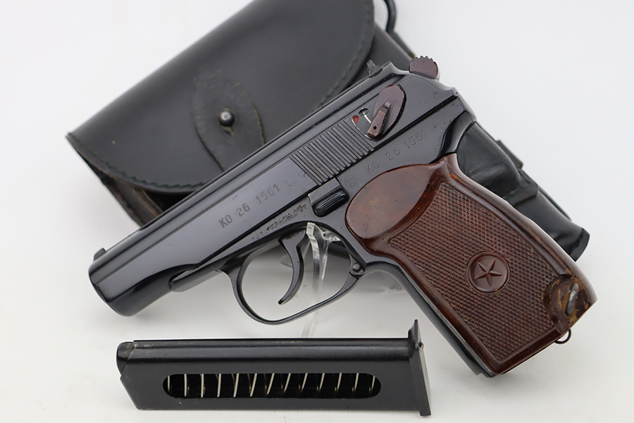 10/12/23 – This is a mint example of a Bulgarian Makarov, manufactured in 1986. All matching with import marks on the frame. It comes as a rig with a matching-numbered magazine, a mint black leather holster, and a cleaning rod. The gun is like-new with no signs of wear or use. Fitted with an excellent reddish bakelite grip. Mint bore.