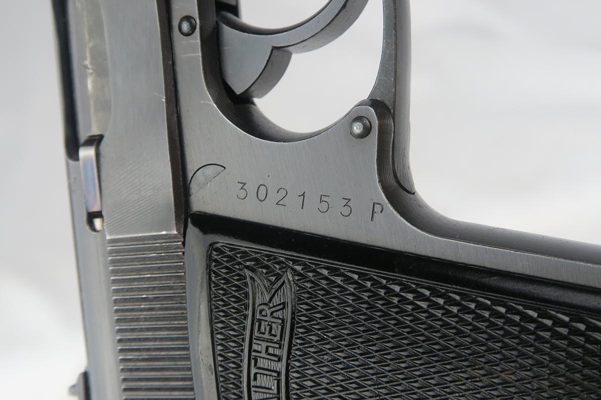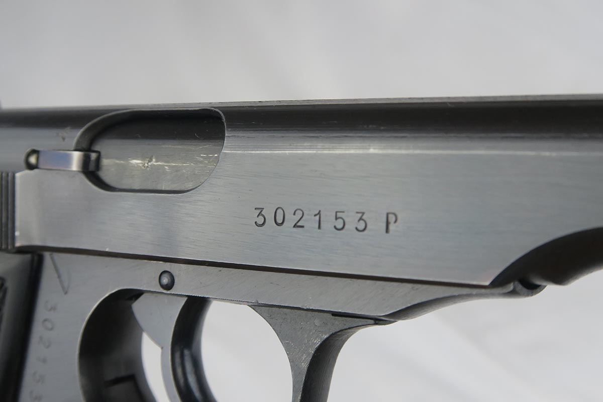 10/9/17 – This is a near-mint .22 Walther PP from the end of World War II.  It is all original and correct with 99+% blue remaining.  This pistol was manufactured in 1944 and features the duller military-style finish.  Eagle/N proofs on slide and frame.  Excellent grips and finger extension magazine.  Mint bore.