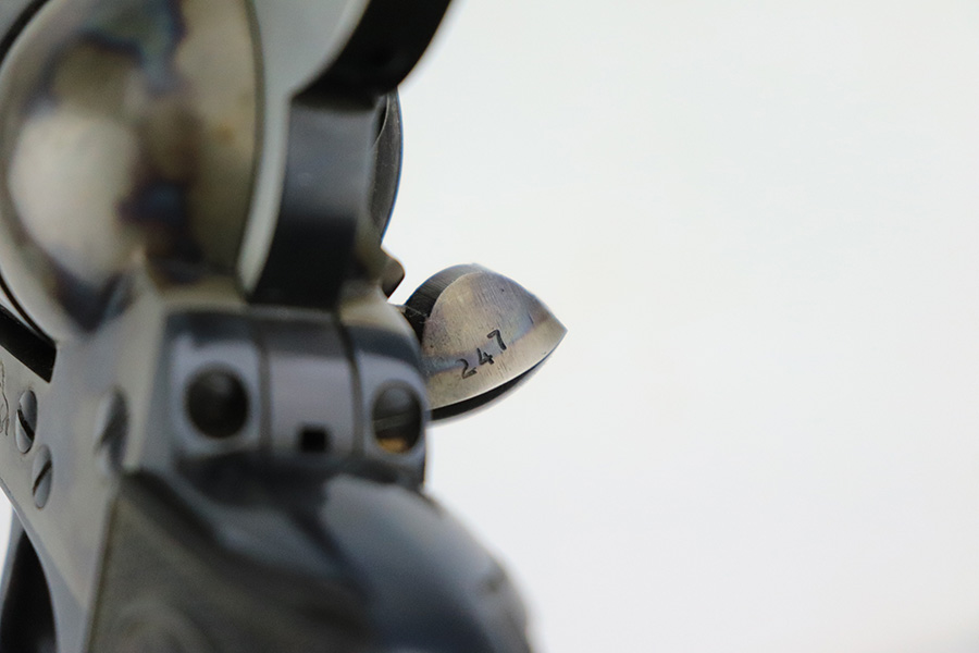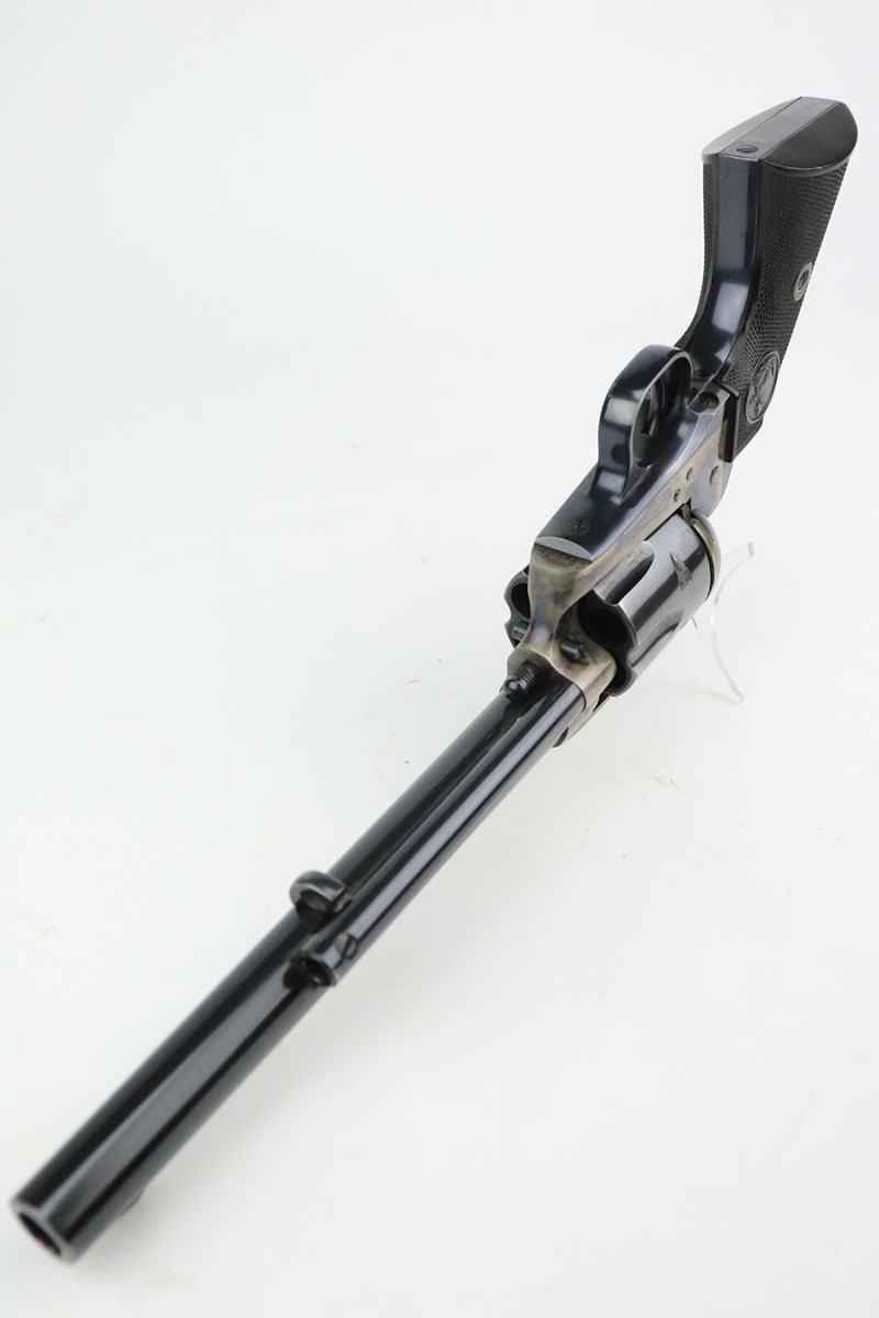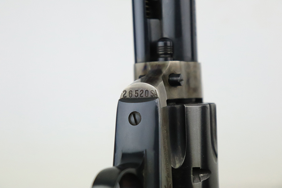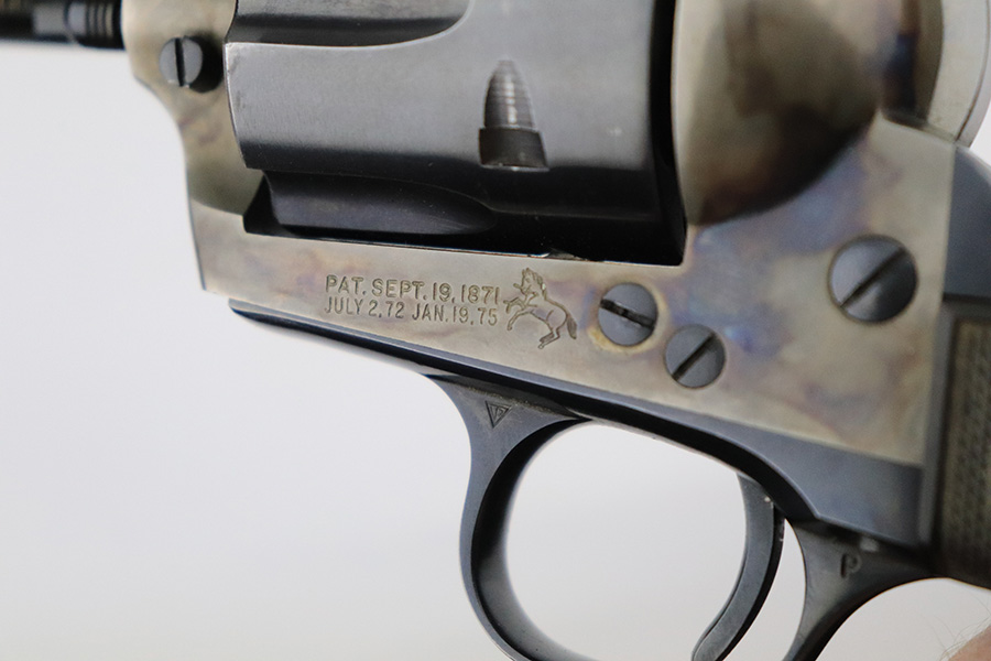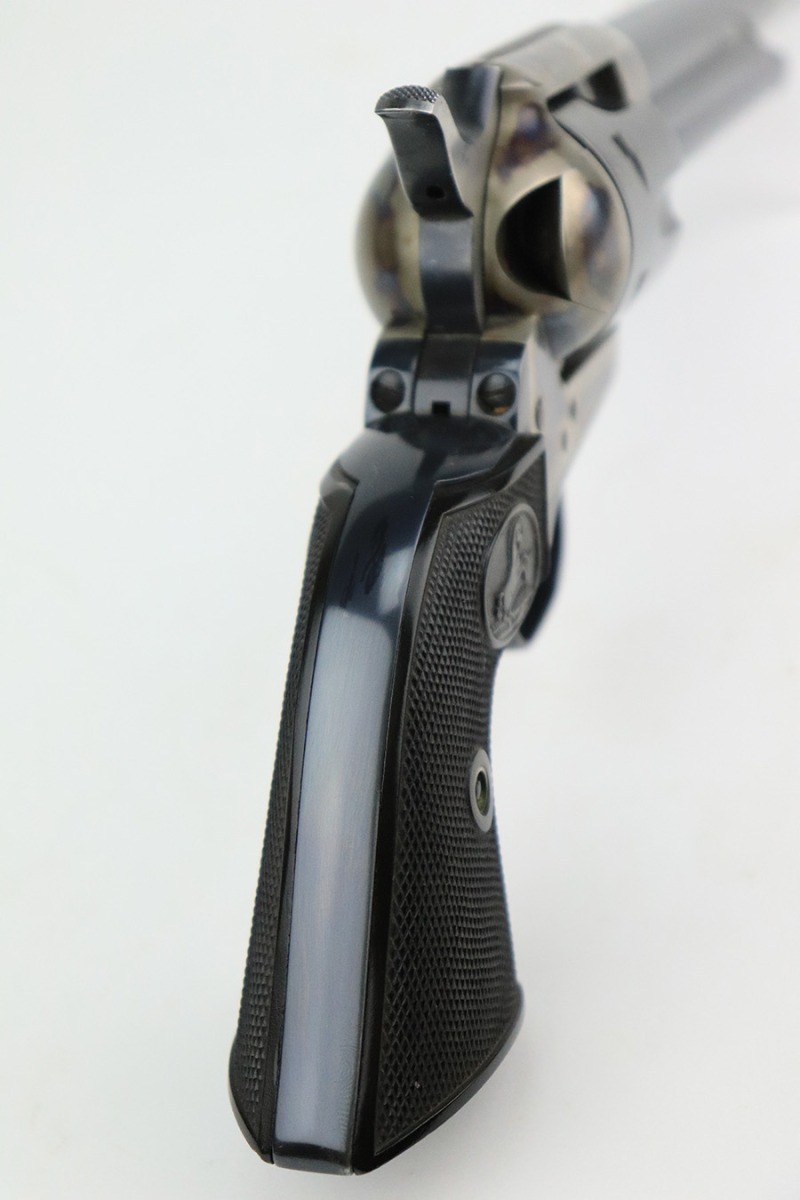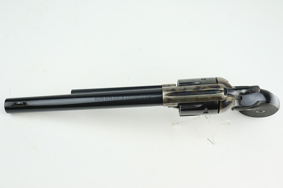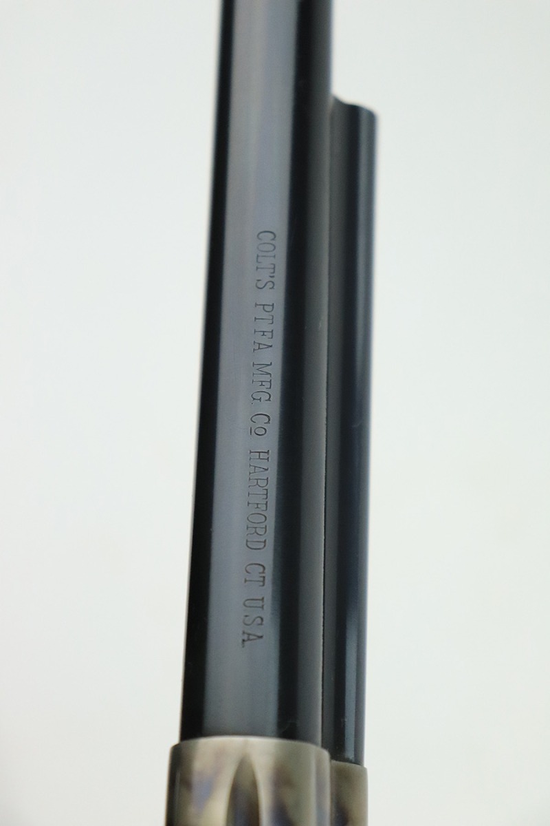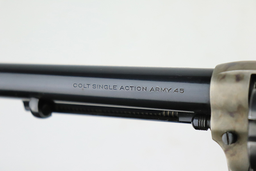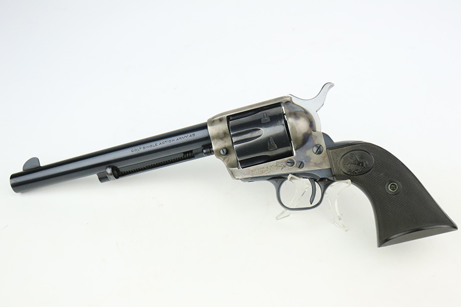 6/10/22 – This is a like-new 2nd Generation Colt Single Action Army Revolver manufactured in 1959. 7.5″ barrel, chambered in .45 caliber. It is all matching and has very little sign of wear – just a hint of muzzle wear and an extremely light roll mark on the cylinder. Beautiful case-hardening on the frame. Comes with excellent black hard rubber Colt grips. Mint bore. The cylinder is tight and the action is smooth.