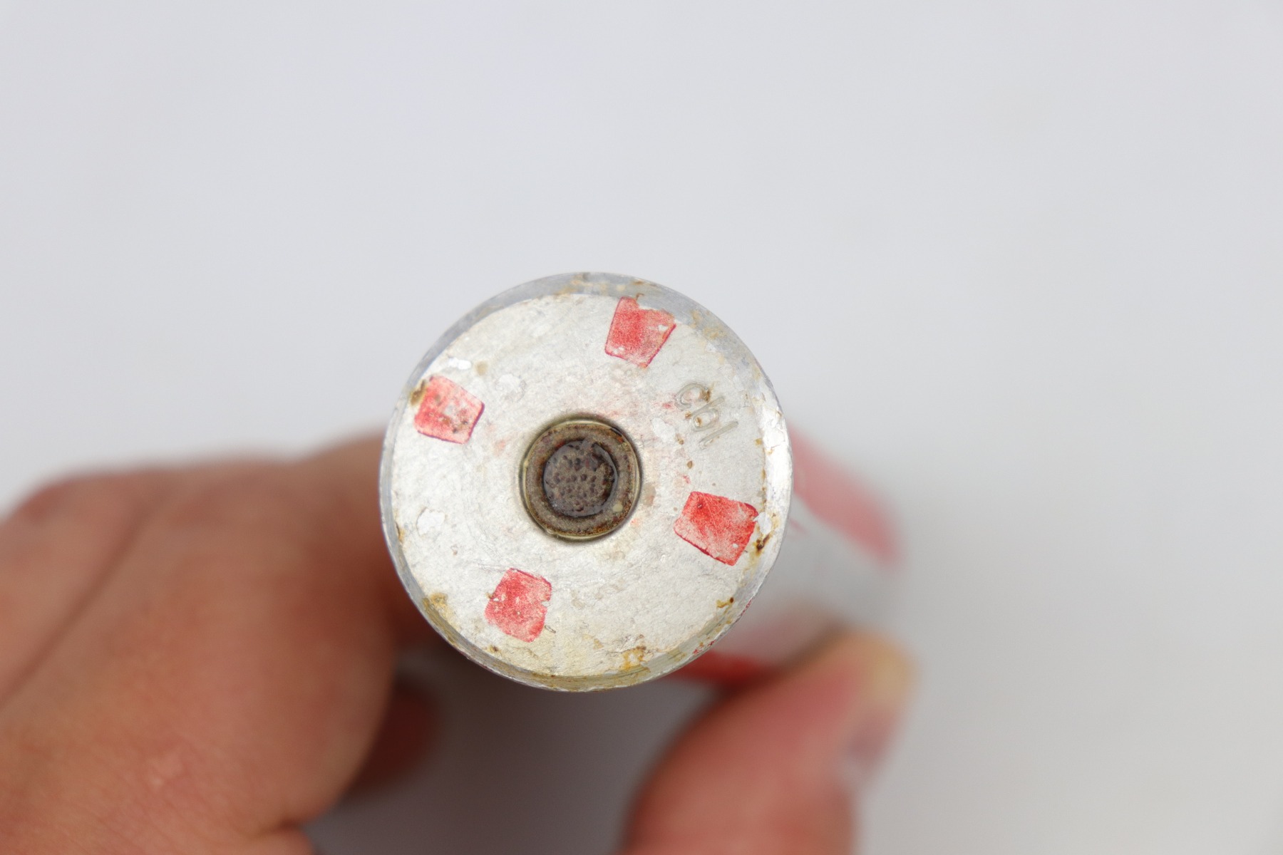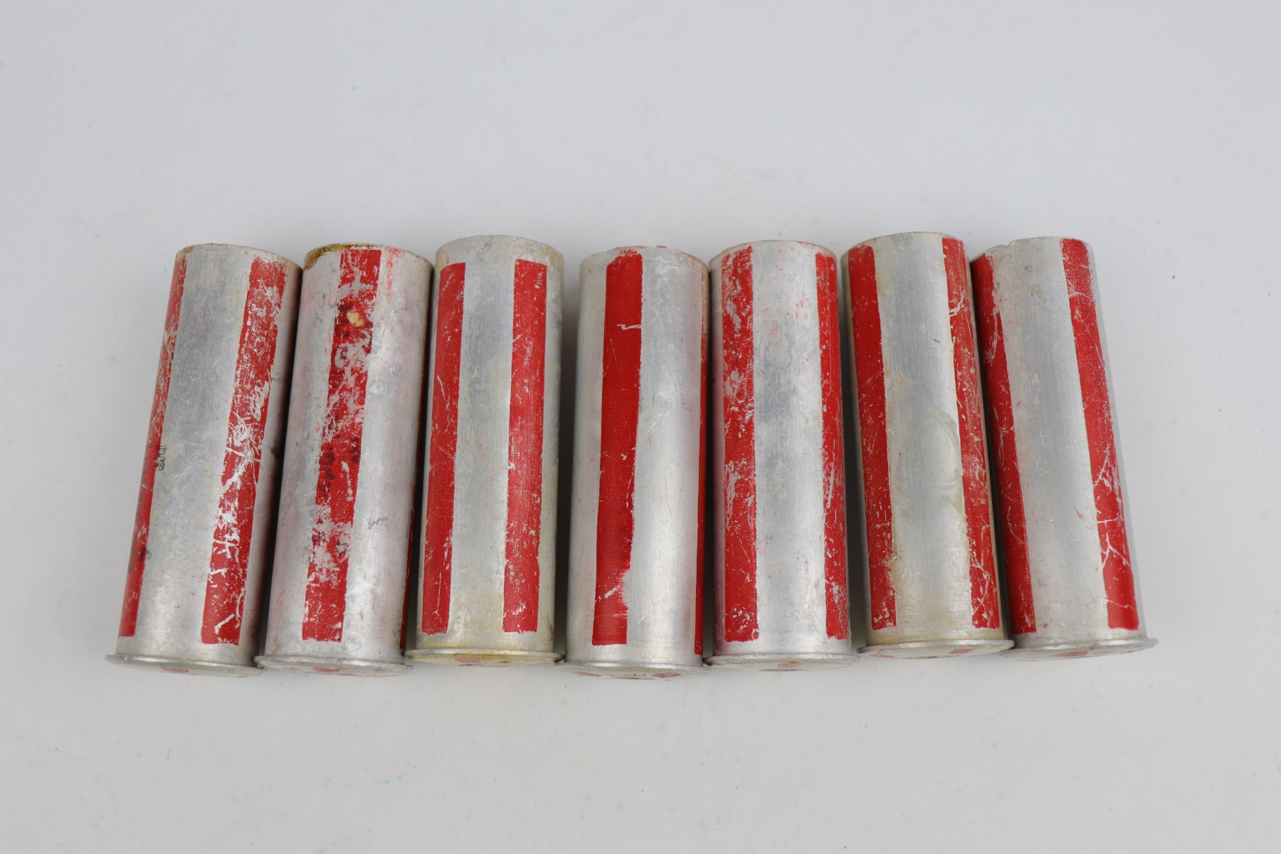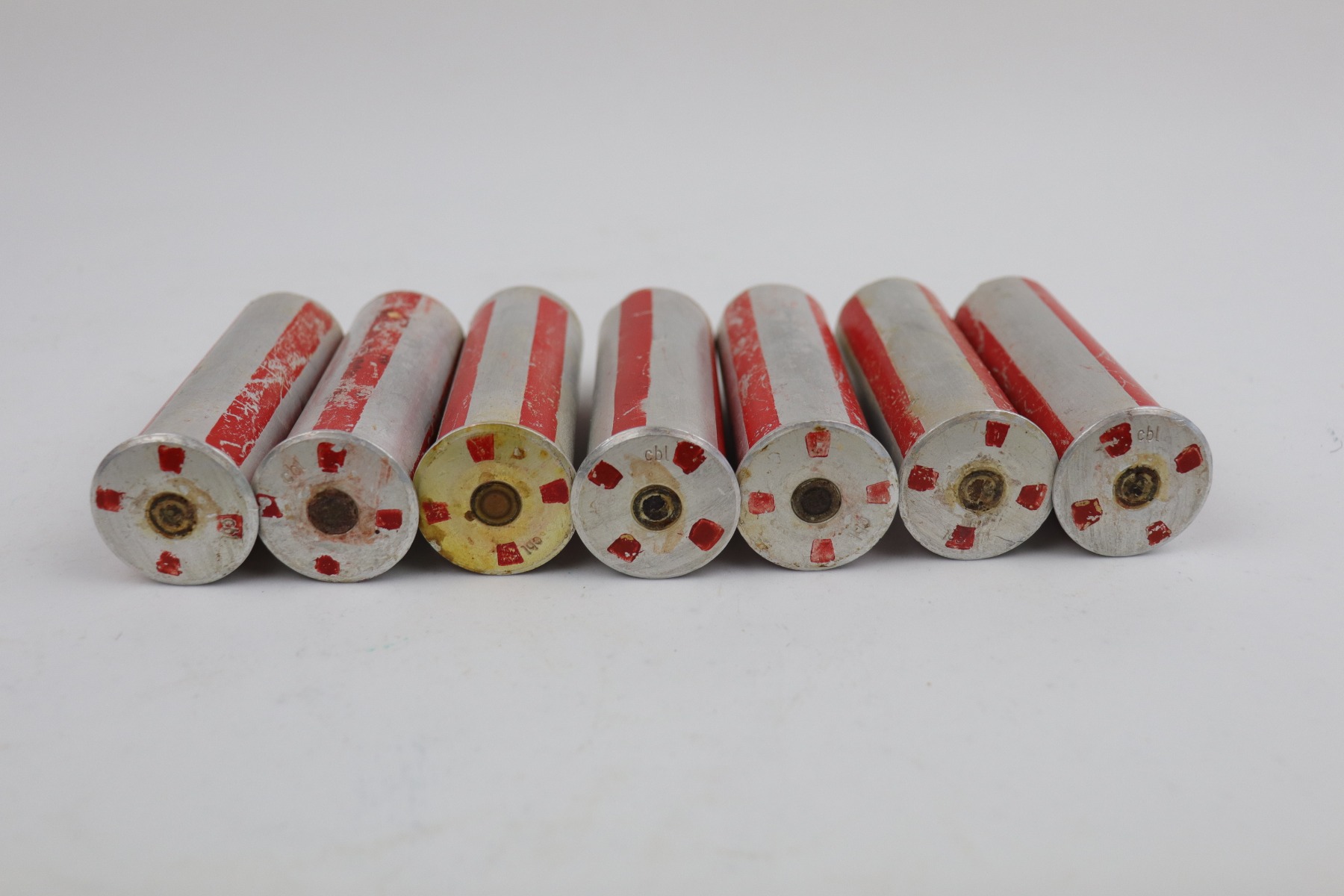 7/15/20 – First one we have ever offered. A mint condition green canvas Flare Carrier. Reported to have come from Africa Corp. Acceptance stamp for military use. Original shoulder strap with tan leather trim. Never seen in such great condition. Comes with 7 flares. They look original and maker marked. Could be dummy rounds but appear to be “live” flares. CBL marked. Mint condition.