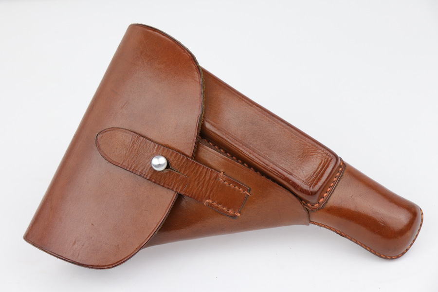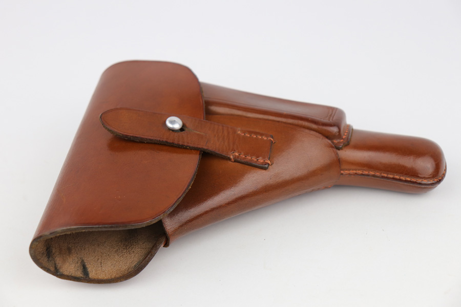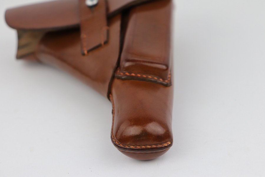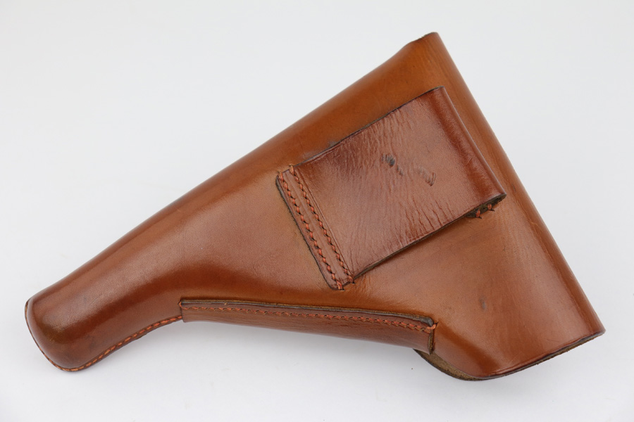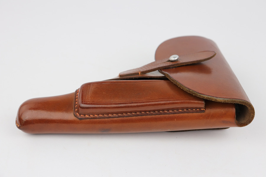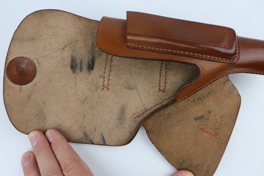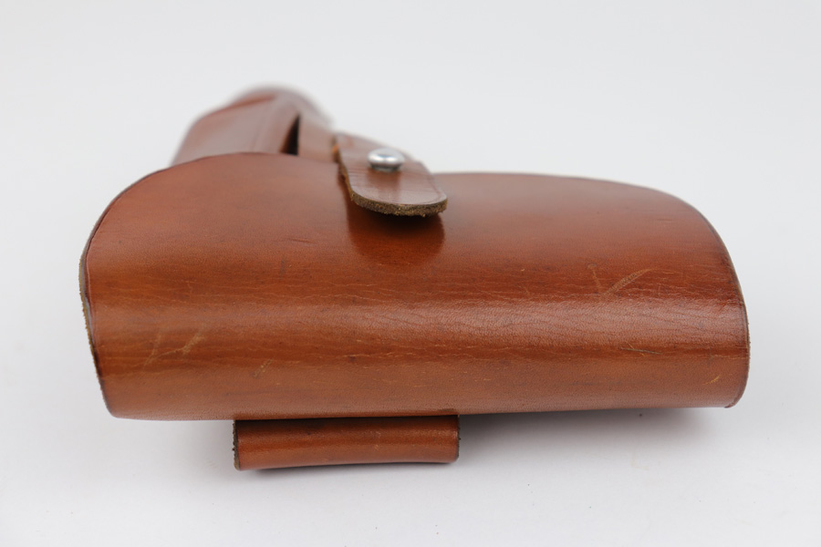 8/7/19 – This is an unbeatable condition, mint and original FN model 1922 holster made by AKAH. We’ve never seen a holster quite like it. AKAH holsters are not typically for the FN 1922 but we believe this one is due to the long snout and size of the magazine pouch. An astra 600 did not fit in this holster. The holster has beautiful brown leather, a strong maker stamp under the closure strap, and tight reddish colored stitching throughout. Very firm leather holds shape with minimal pliability.