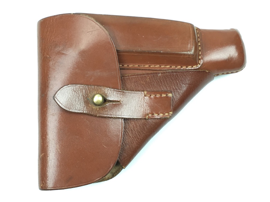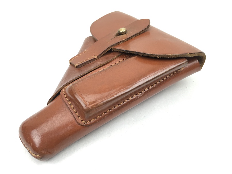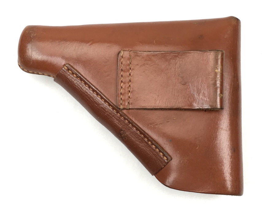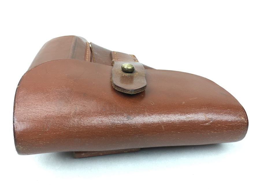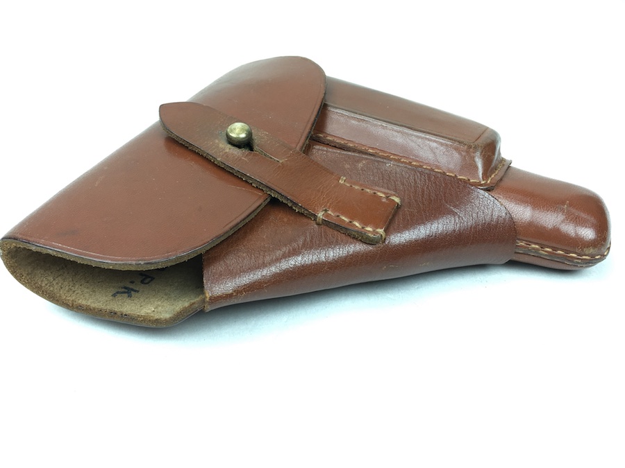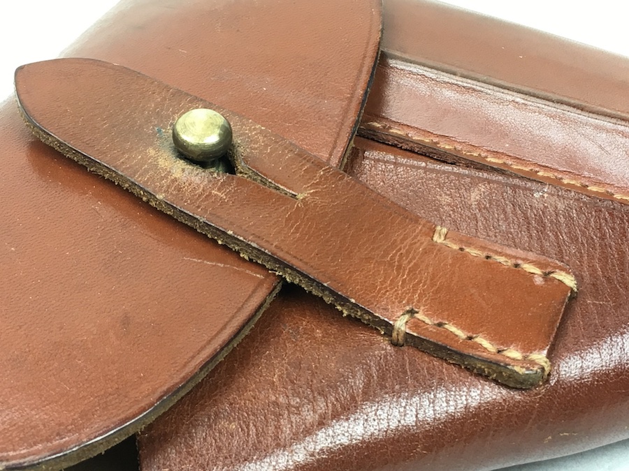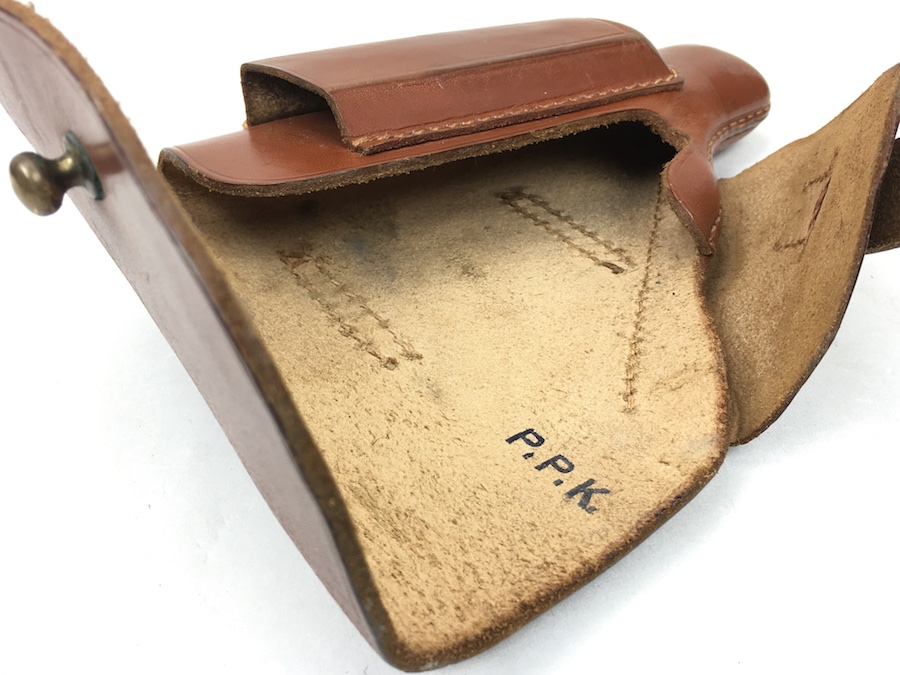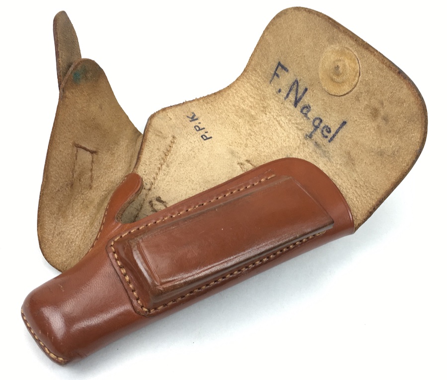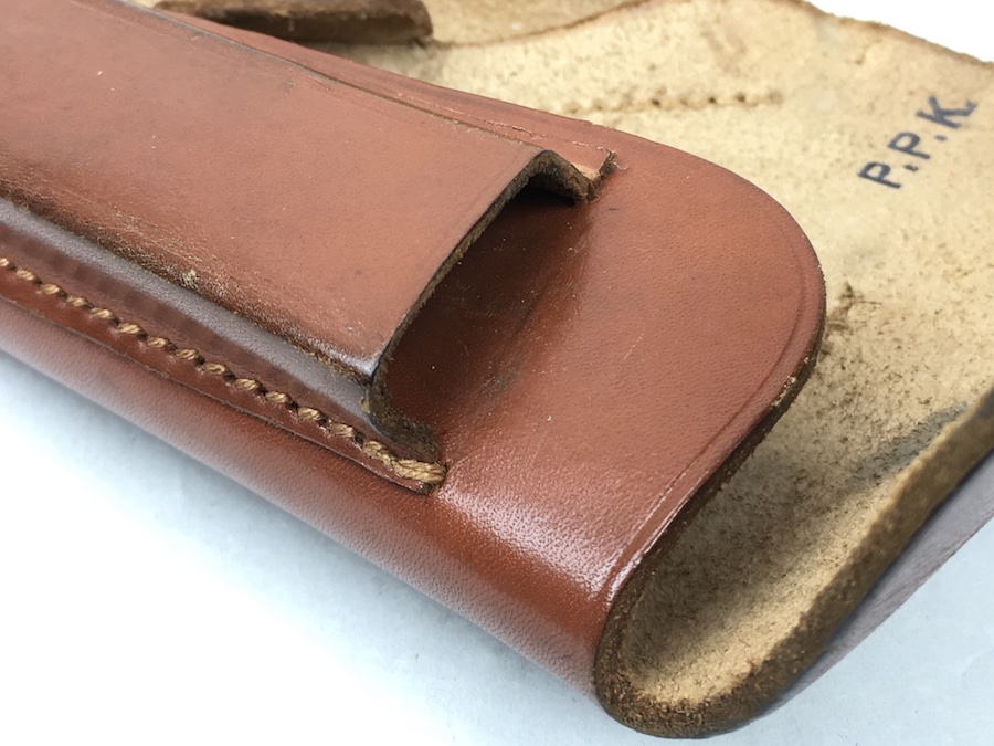7/2/19 – This is an original, and minty condition AKAH style Walther PPK holster from the 1930’s. No maker mark, but it is ink stamped under the flap “PPK”. Also, personalized with “F. Nagel”. Otherwise, the interior leather is very clean. Brass closure stud indicates 1930’s production. Stitching is intact. Virtualy no surface wear.