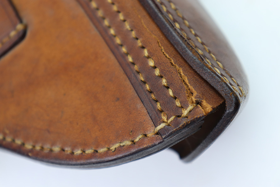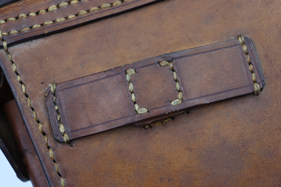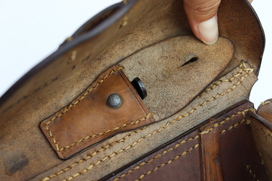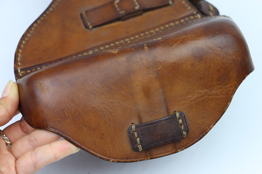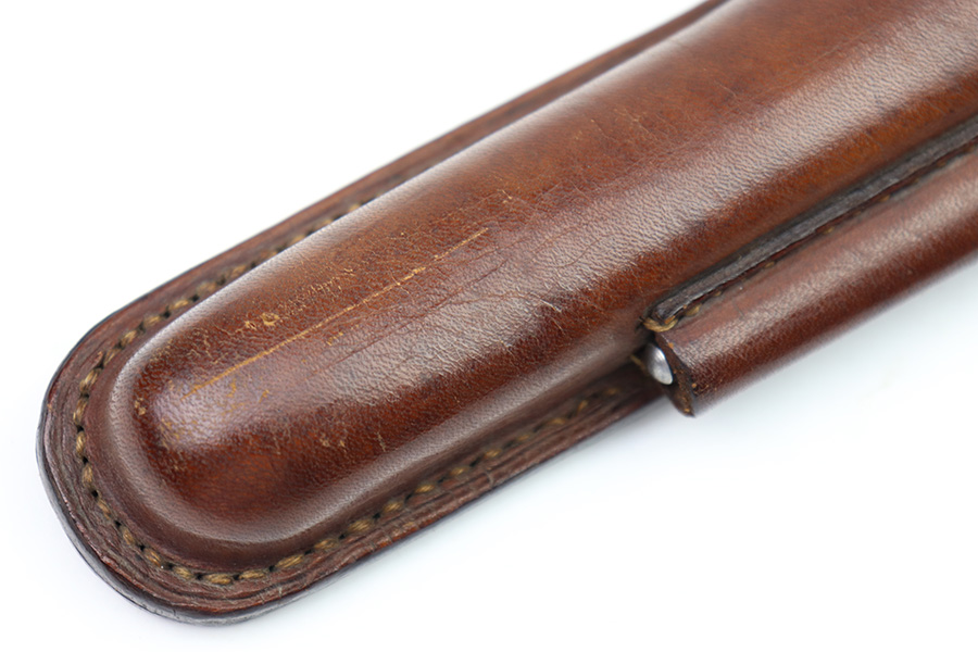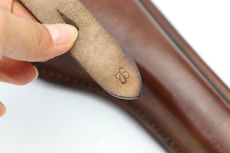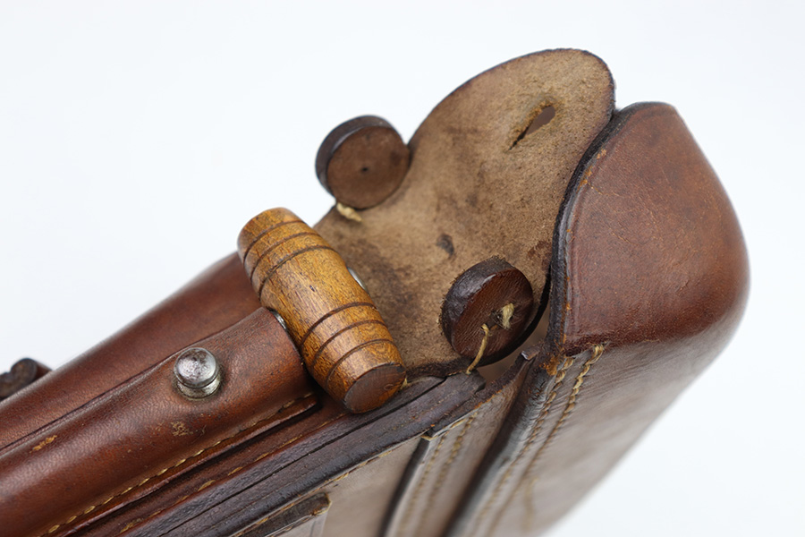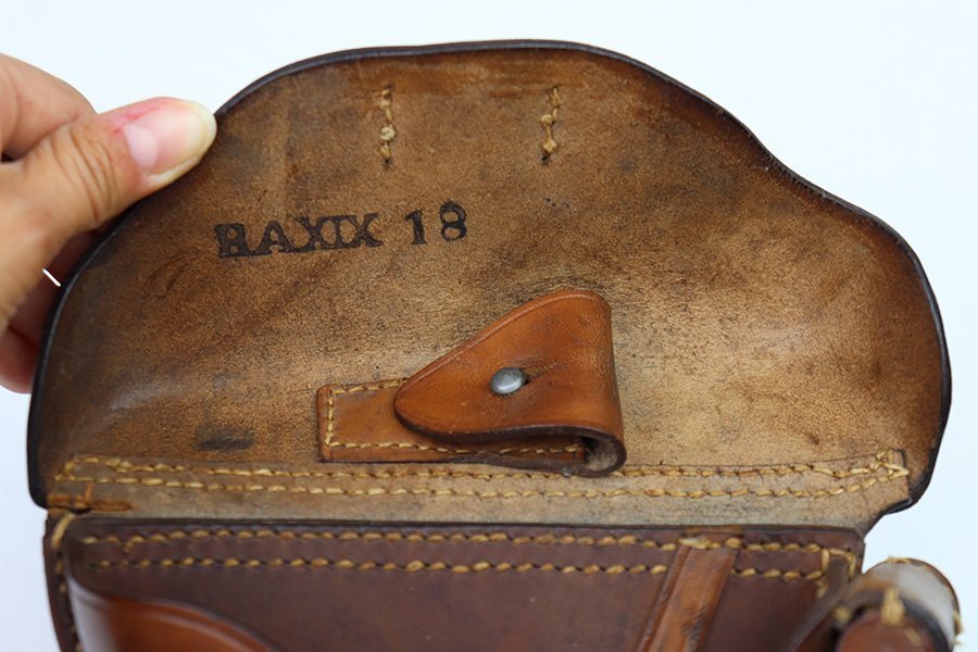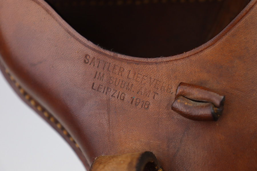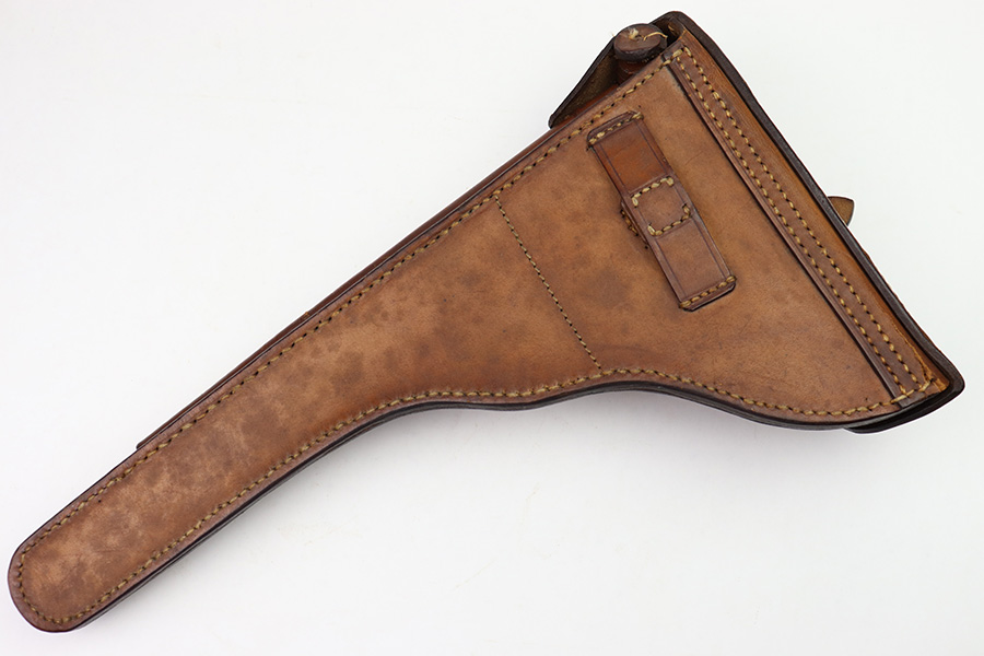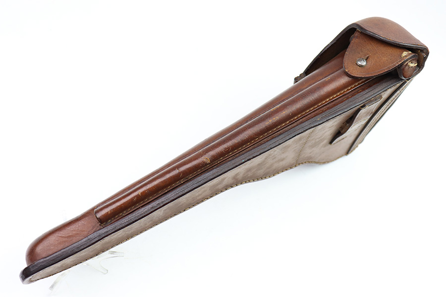 8/3/22 – This is a minty example of a 1918 dated Artillery Luger holster with an original cleaning rod and loading tool. The holster has crisp brown leather and excellent, all original stitching. The leather has minimal pliability and some very mild surface wrinkling on the closure strap. The front leather is crisply maker stamped and dated. The interior leather is ink stamped and very clean as shown. The loading tool is in great shape and unmarked, and the cleaning rod is excellent condition. A nearly impossible-to-upgrade Artillery grouping.