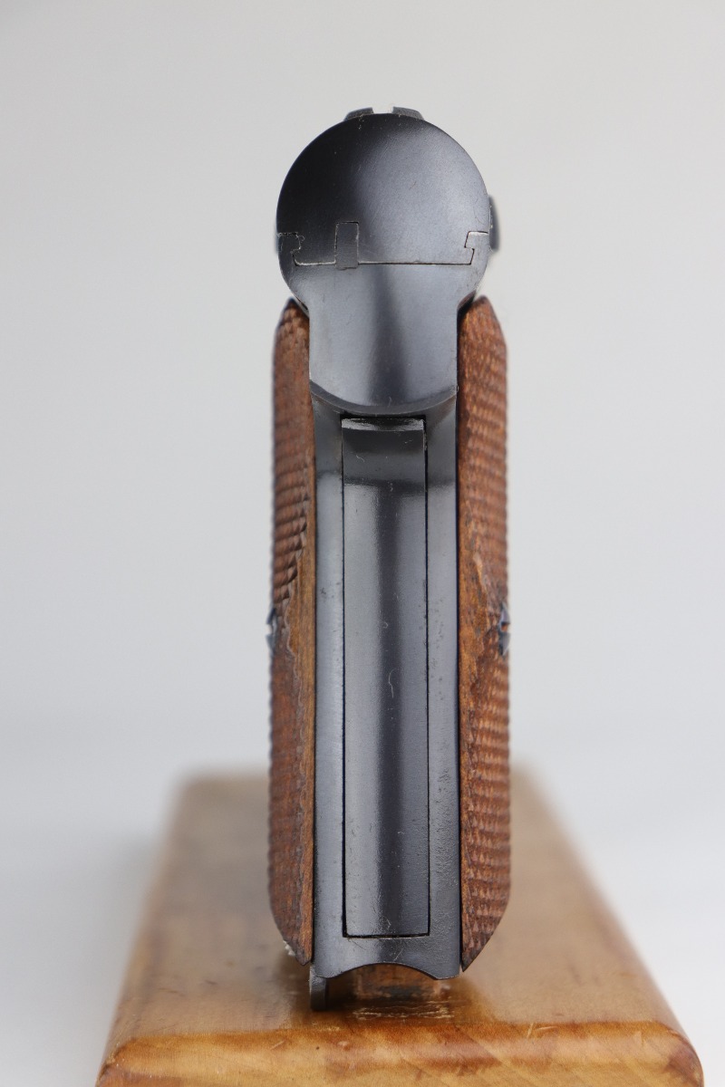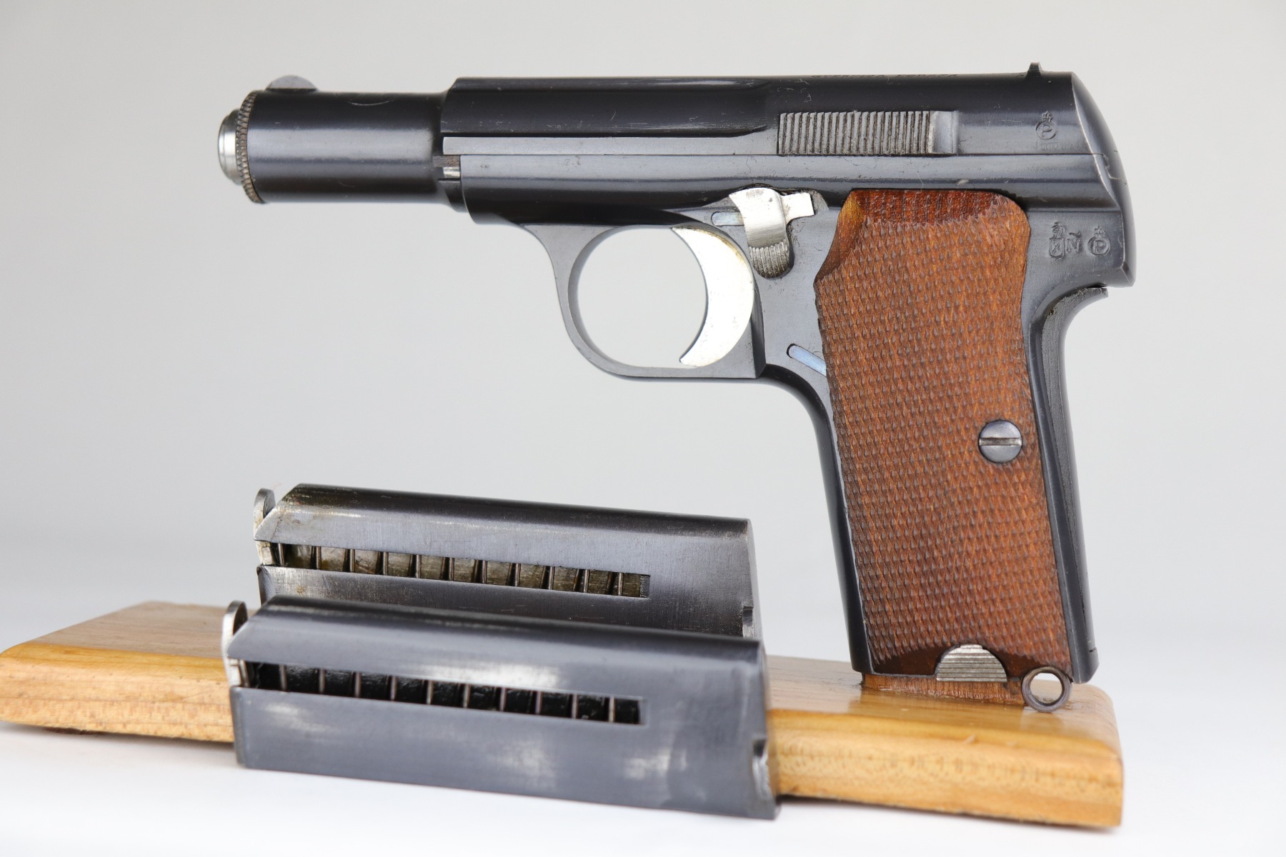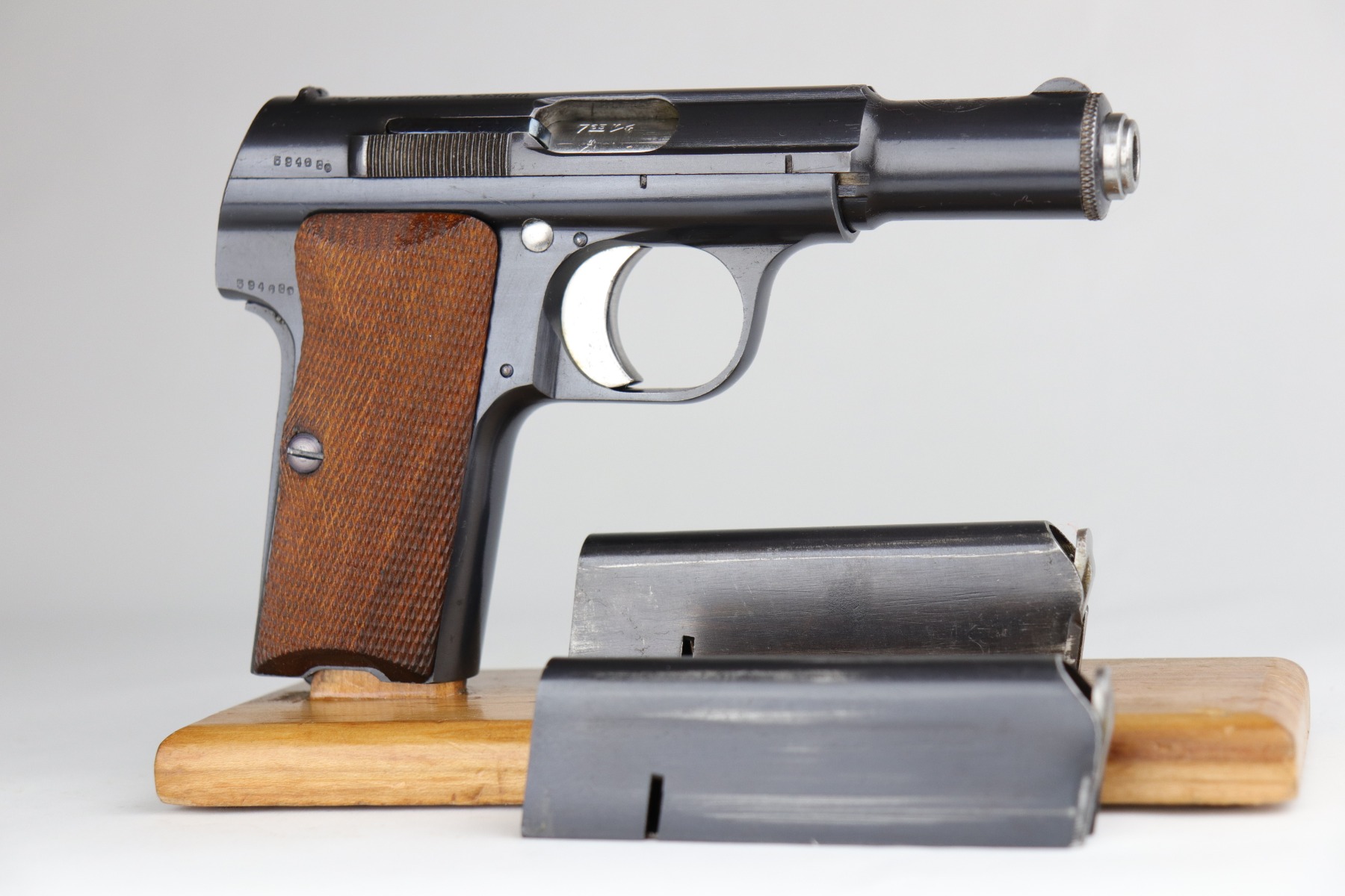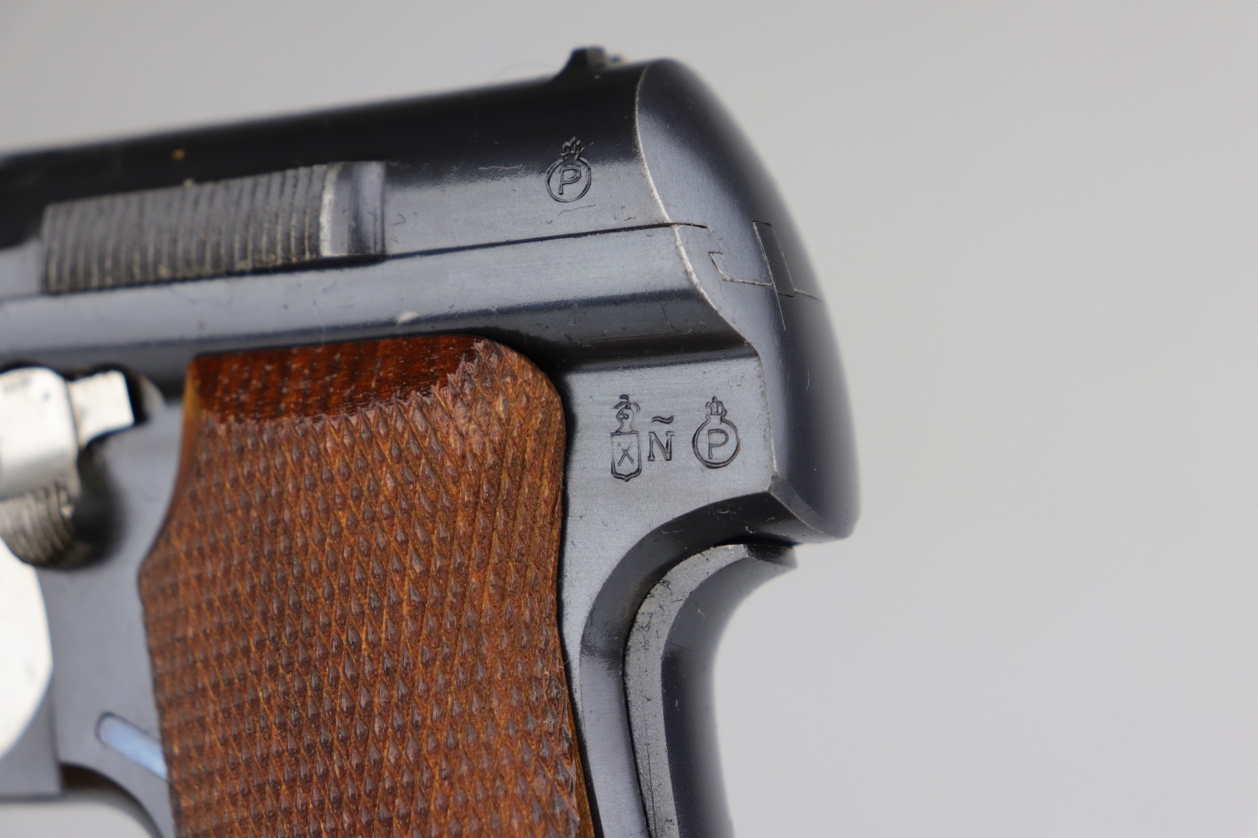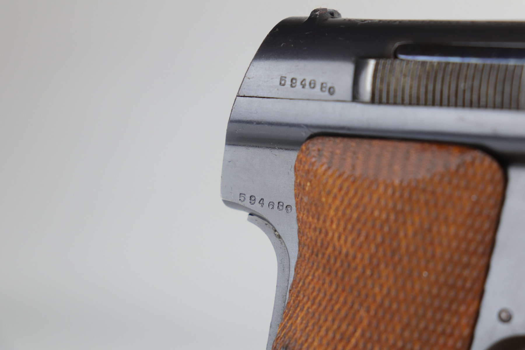 7/9/20 – This is an Astra 30 rig in superb condition. This particular example was delivered on February 24 of 1944 as a part of the 2nd Nazi military contract, chambered in 7.65mm. This variation is not waffen proofed. The gun is in mint condition – no signs of finish loss. The grips are mint. The rig comes with two excellent period-correct magazines and a holster. The holster is in minty condition and has waffen proof and 1943 ink stamps. The bore is excellent.