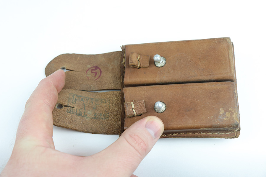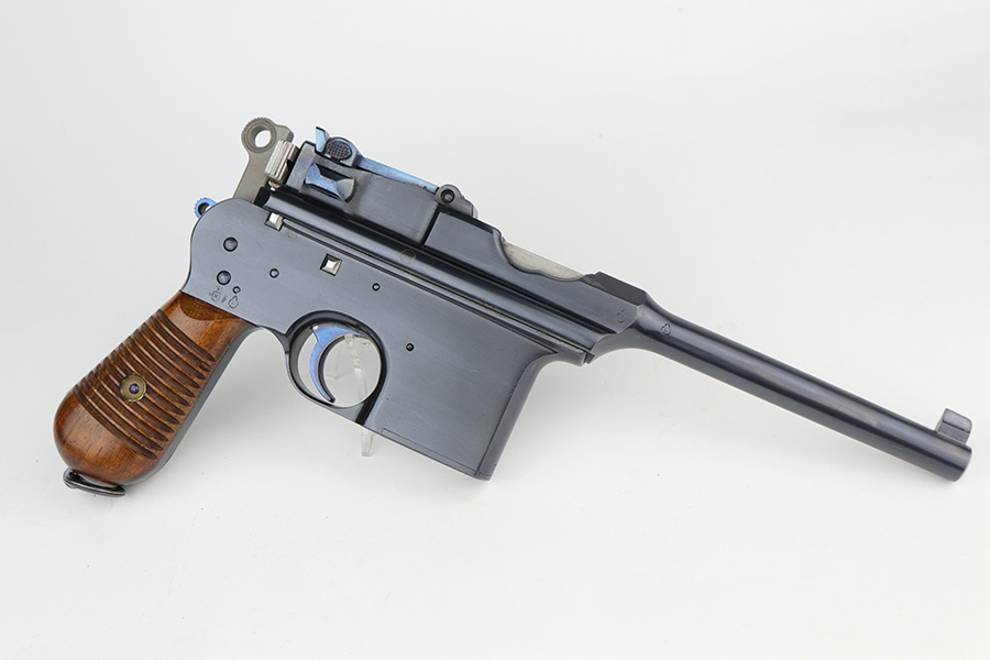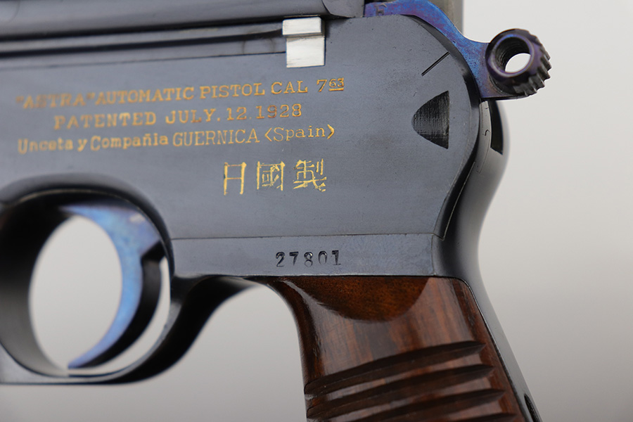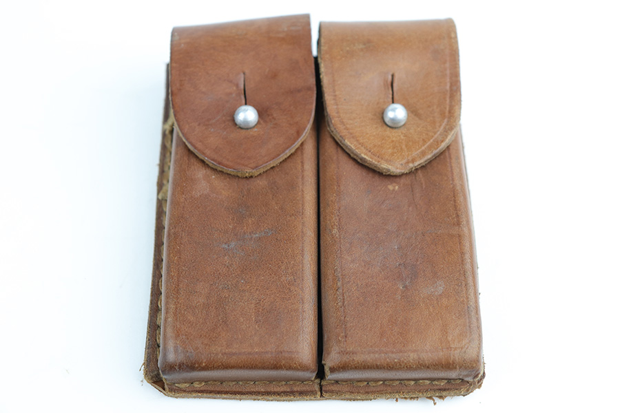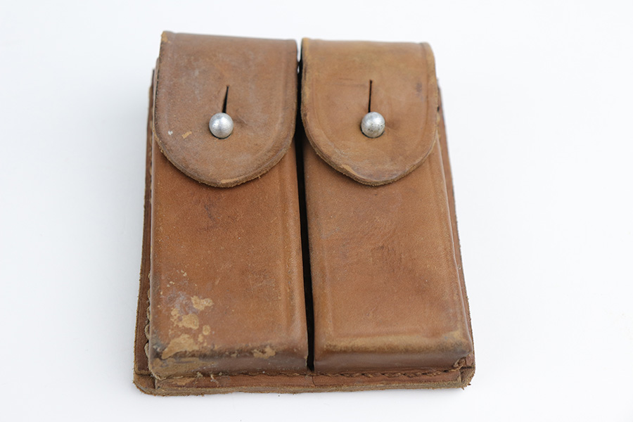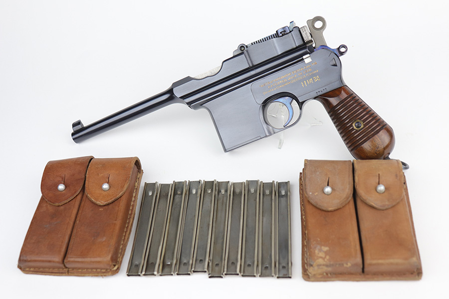 9/28/21 – This is the finest example you’ll see of a scarce Astra 900 that was exported to China as part of a small contract order. They were ordered for the Chinese warlord market but this one appears to have gone unissued and unused. The bluing is immaculate, as is the bore. Matching numbers throughout, including the grips. Date code on frame indicates this was made in 1933. Comes with two double clip pouches that includes 10 stripper clips. The pouches also have Chinese markings.