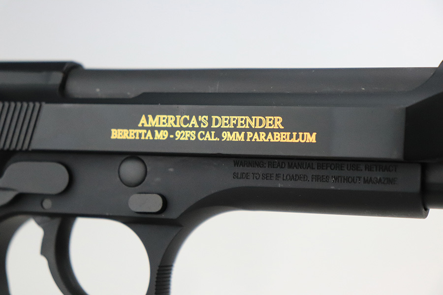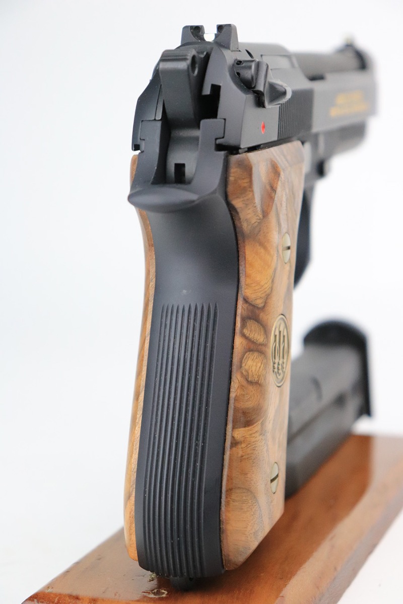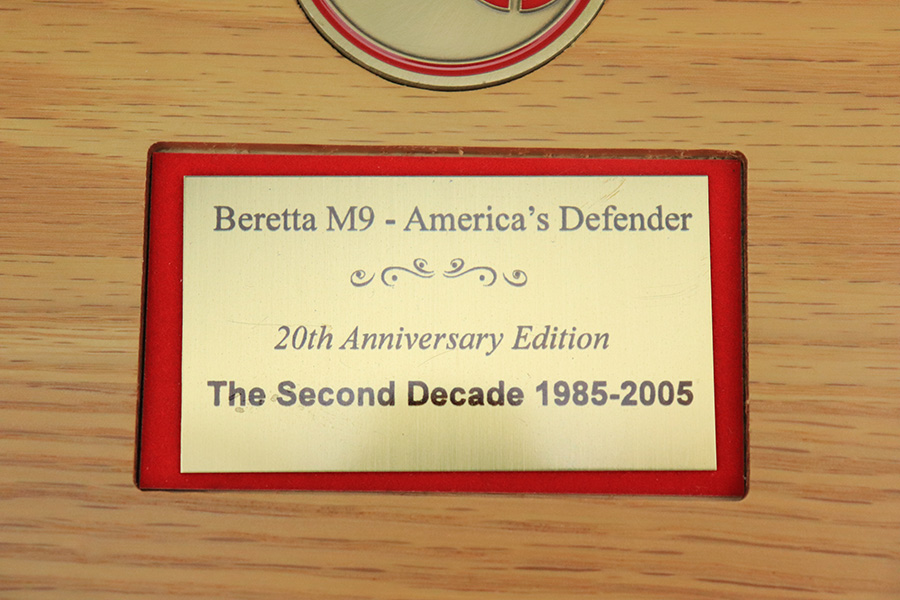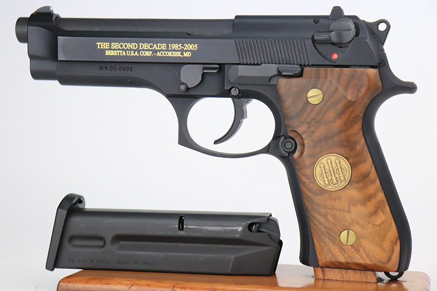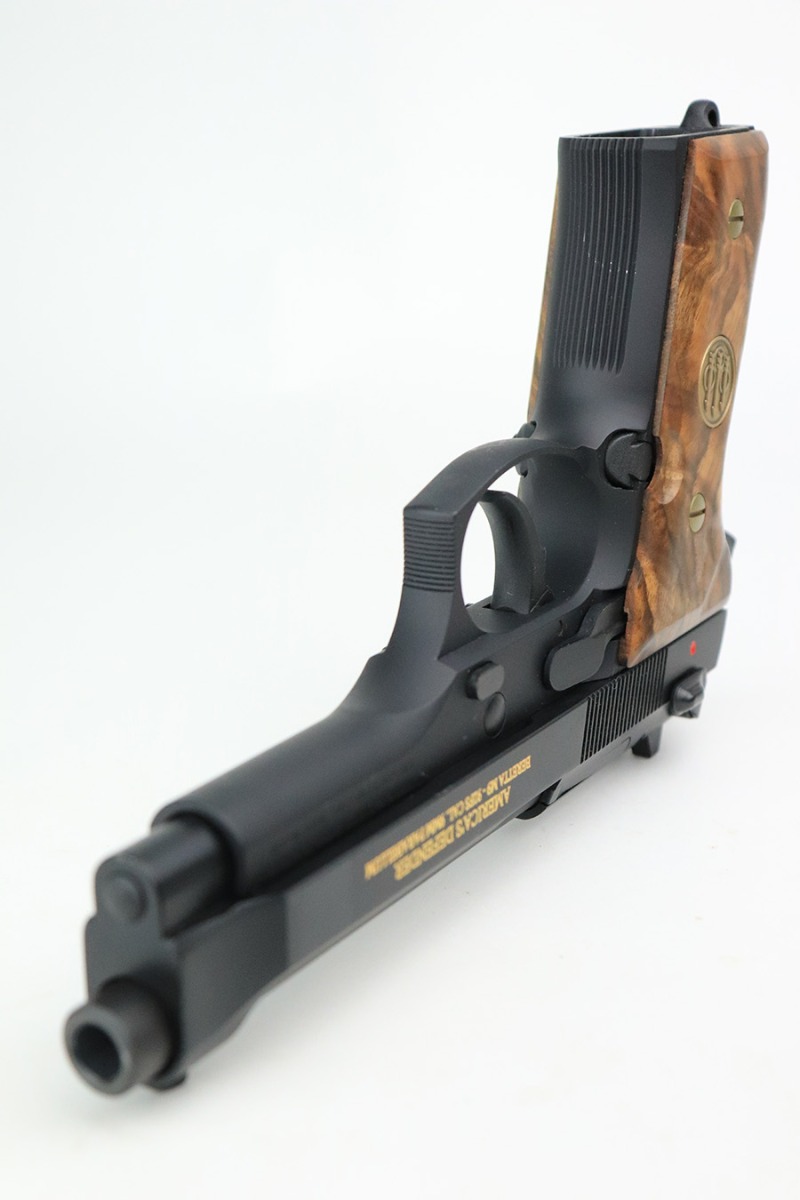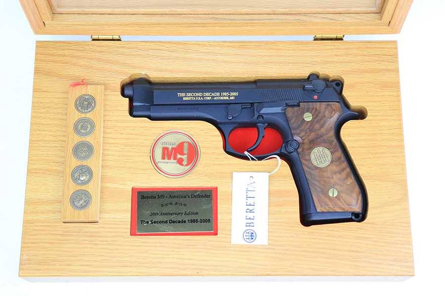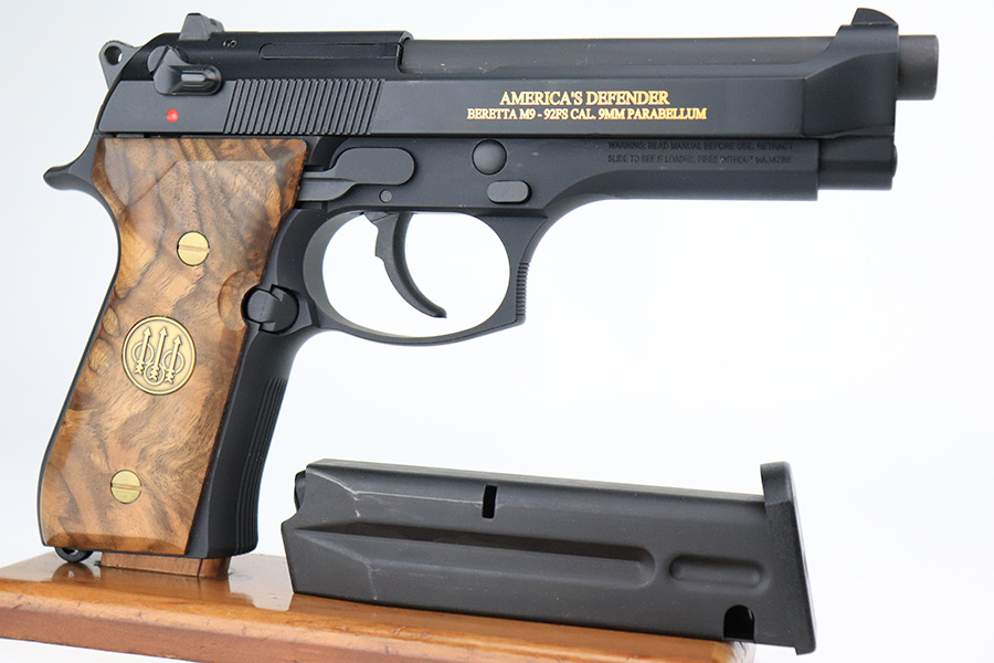 6/1/22 – This is a mint Beretta M9-92FS made as a 20th anniversary pistol and labeled “America’s Defender”. The gun comes in the original display case which has medals for the Army, Navy, Air Force, Marines and Coast Guard. It has gold inlay on the slide with beautiful wooden grips. White dot front and rear sights. Ambidextrous safety and functions in both double and single action. One 15rd mag. FFL required.