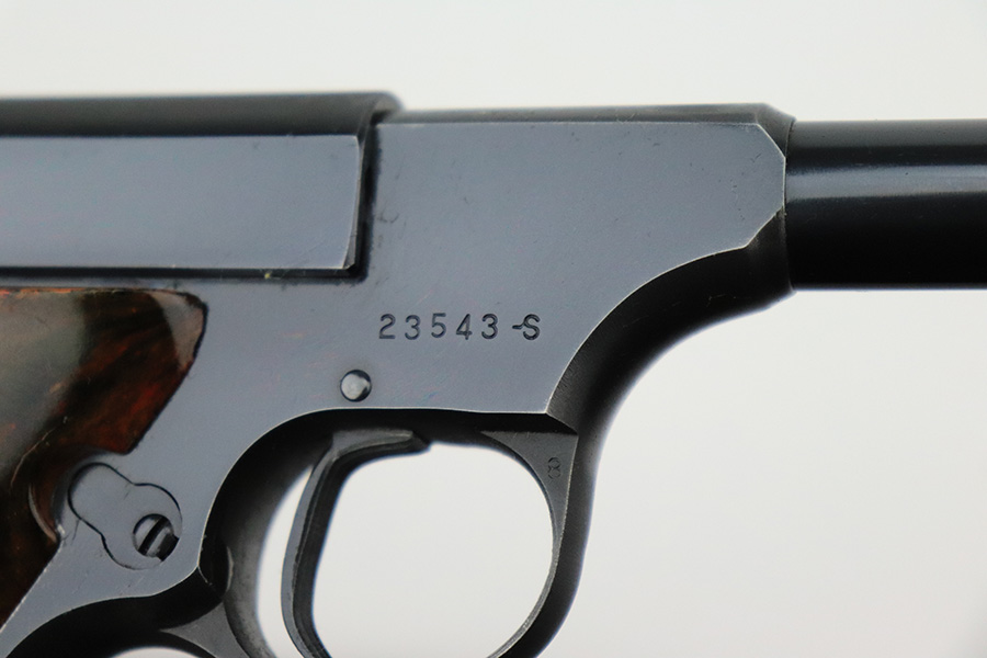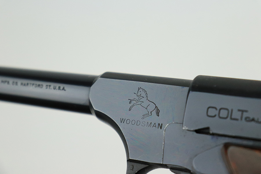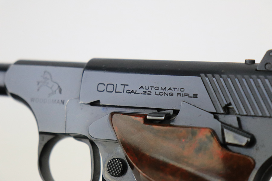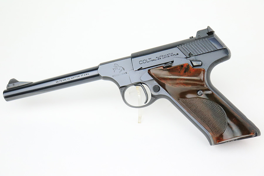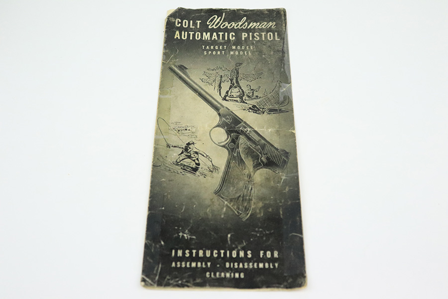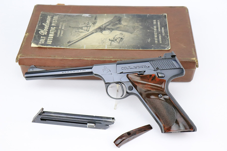 7/28/22 – This is a mint example of a Colt Woodsman manufactured in 1949. It is all correct and comes with a period-correct box (not numbered), owners manual, and grip extension. The gun has retained virtually all of its original high polish finish. There are just a couple of tiny scratches on the left side of the frame and a few very light scuffs on the back strap. Comes with excellent marbled brown plastic grips and one proper magazine. The bore is like-new.