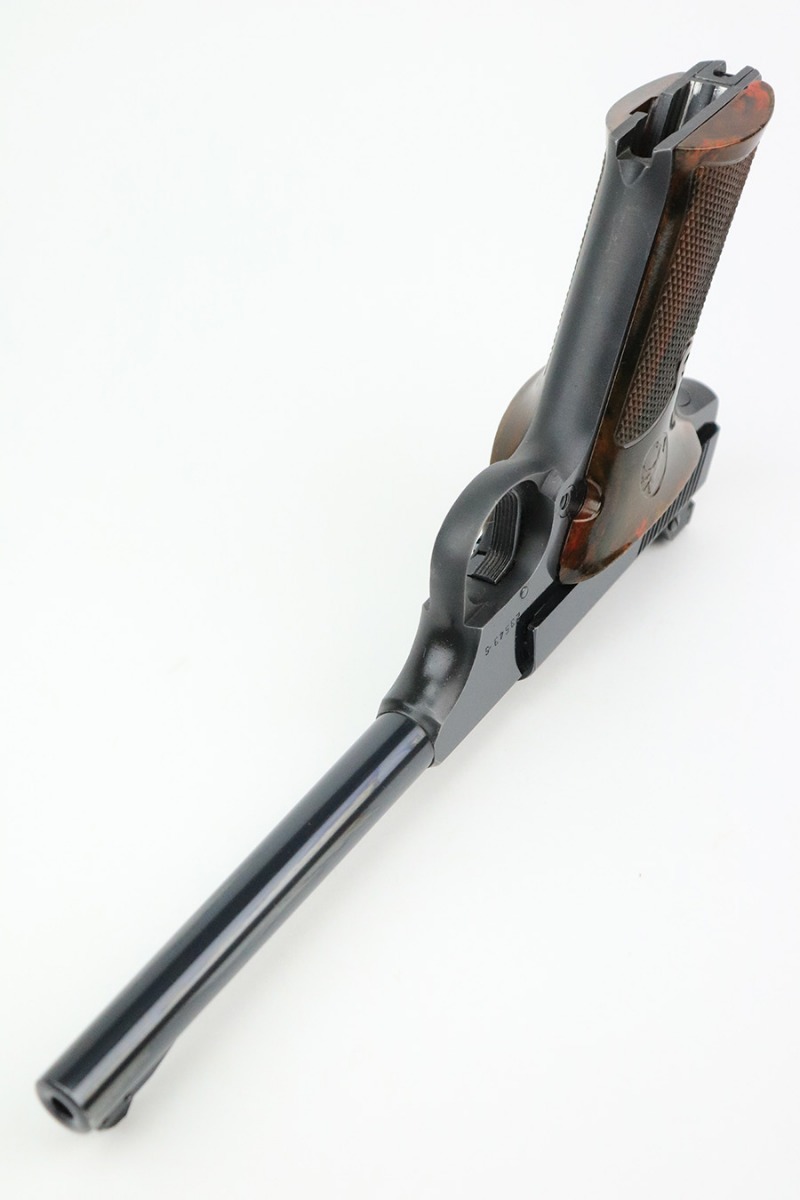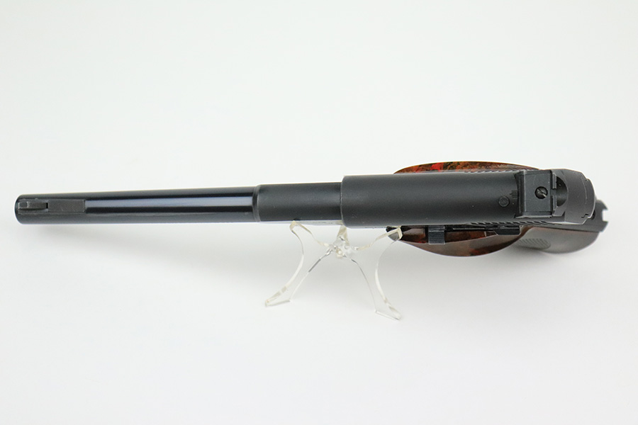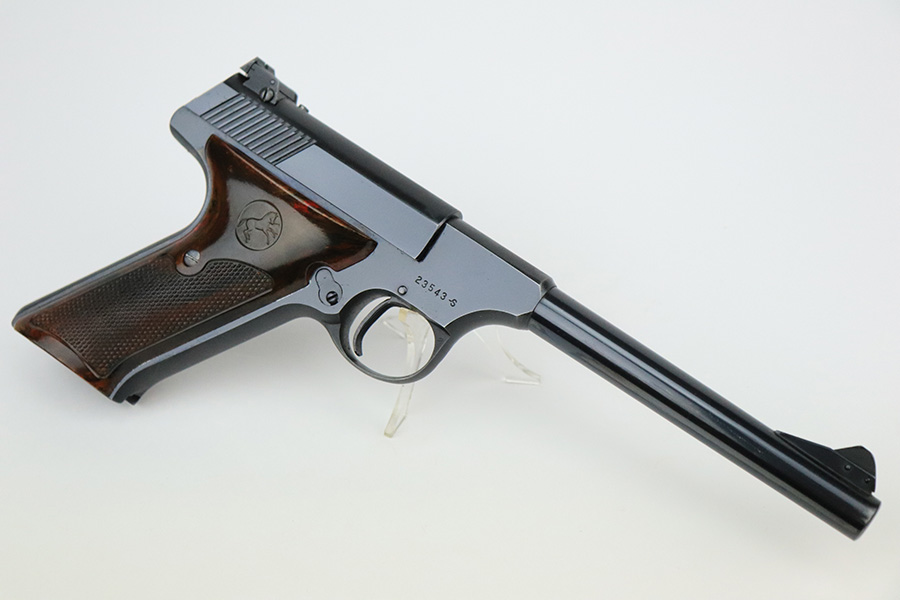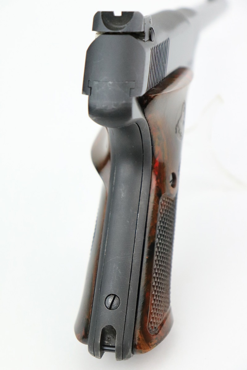 7/28/22 – This is a mint example of a Colt Woodsman manufactured in 1949. It is all correct and comes with a period-correct box (not numbered), owners manual, and grip extension. The gun has retained virtually all of its original high polish finish. There are just a couple of tiny scratches on the left side of the frame and a few very light scuffs on the back strap. Comes with excellent marbled brown plastic grips and one proper magazine. The bore is like-new.