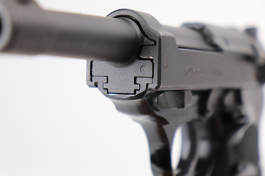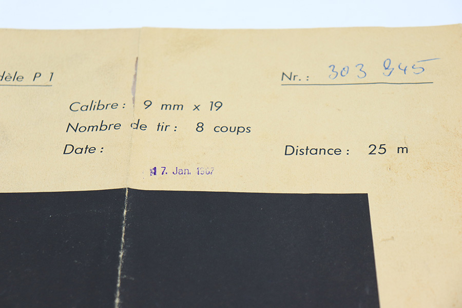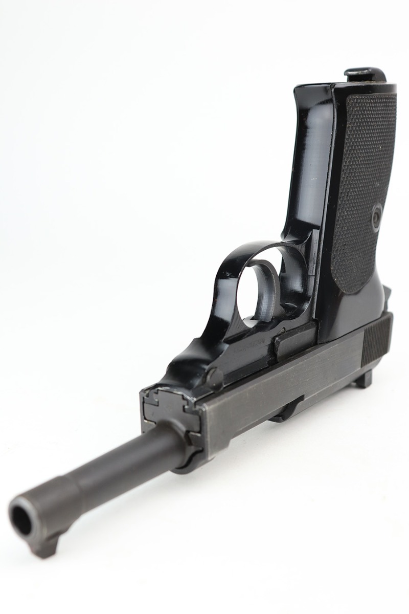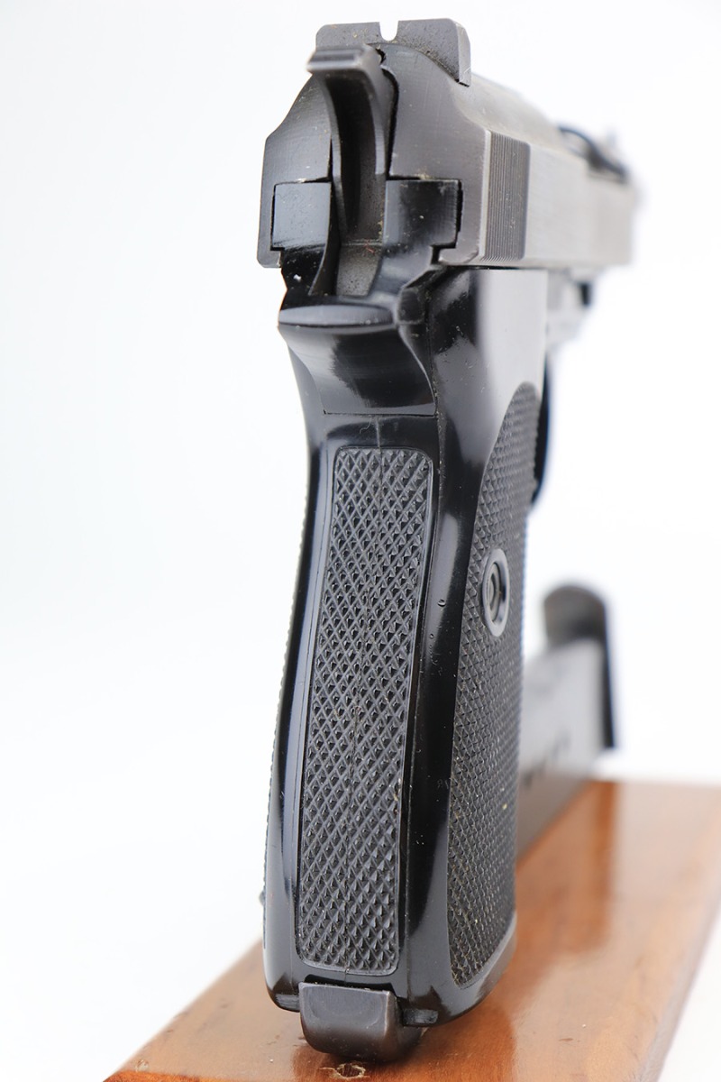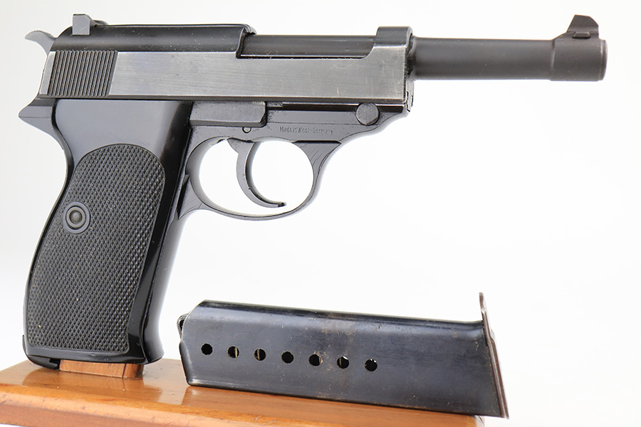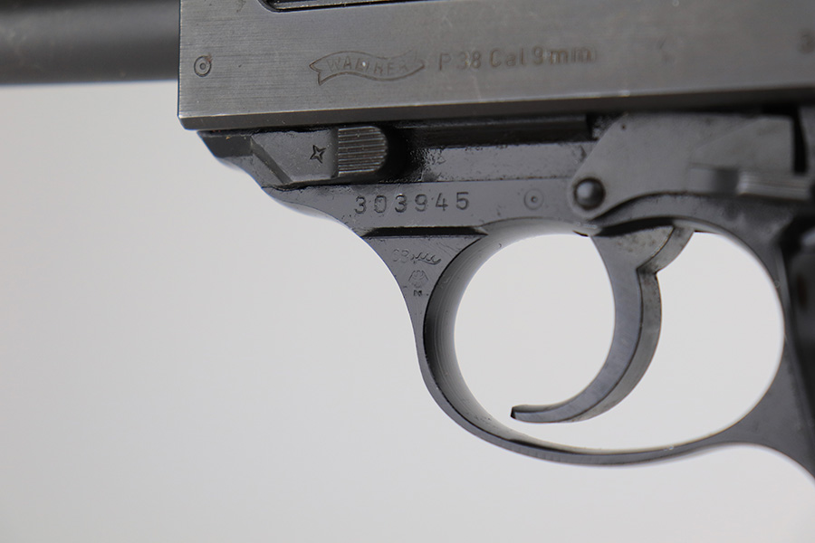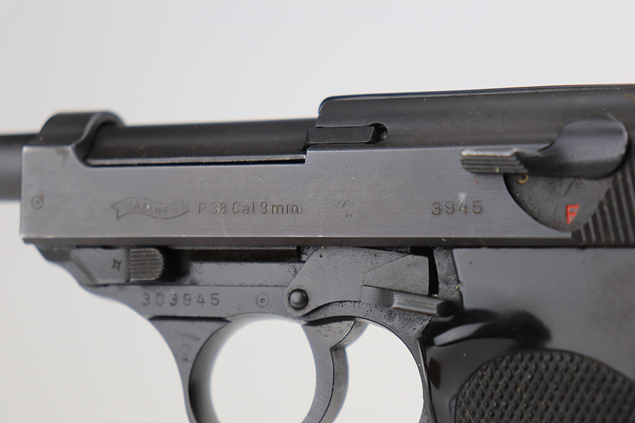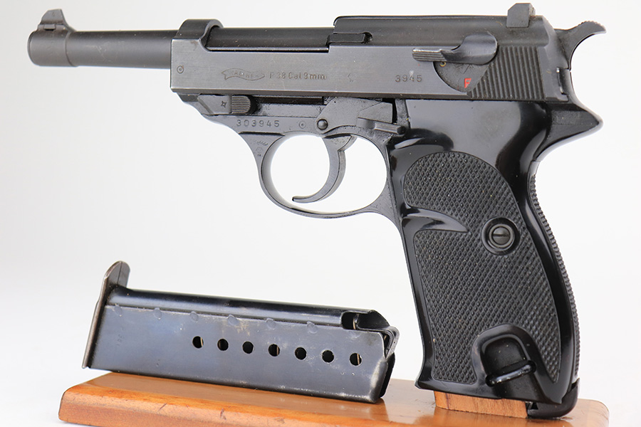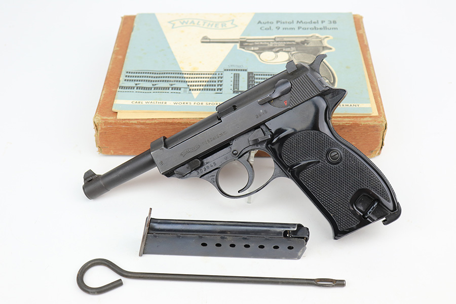 3/17/22 – This is a mint example of a Walter P.38 manufactured in 1968. The gun is all matching, has no import marks, and has the proper West German proofs throughout. “Made in West Germany” export marking on the right side of the frame. The gun comes with an original box (not numbered), the original matching-numbered test target, owners manual, and cleaning rod. It has retained virtually all of its original finish. There is just a hint of wear at the very front edge of the right side of the slide, a couple of very light scratches on the right side of the slide, and a few tiny handling marks on the front strap. The bore is mint. De-cocker is functional.