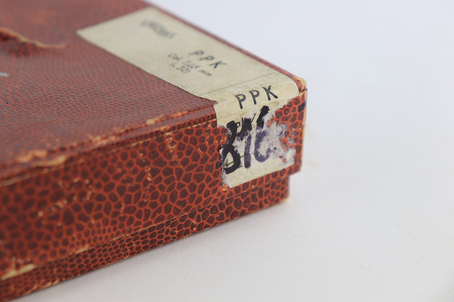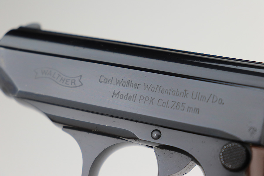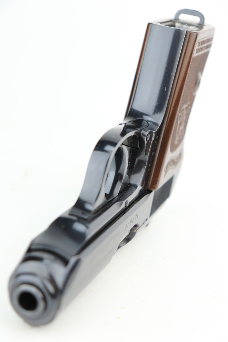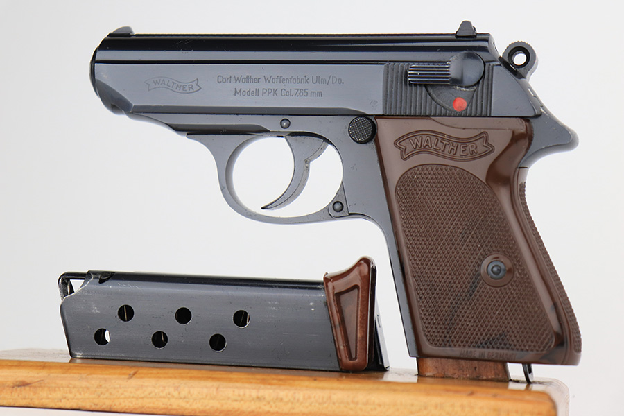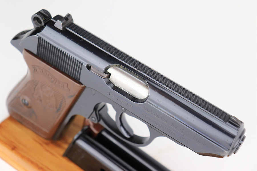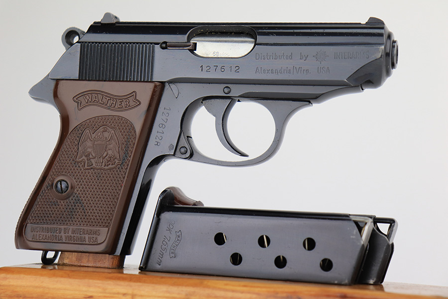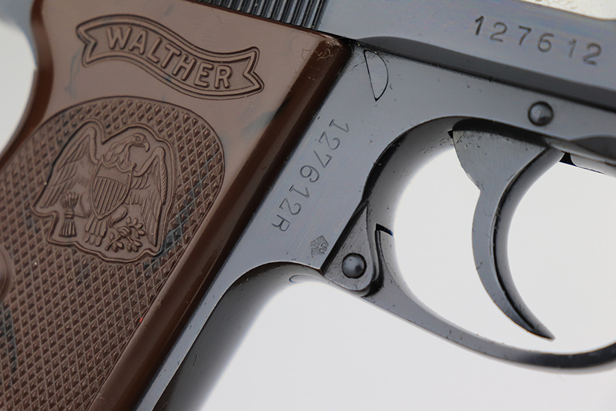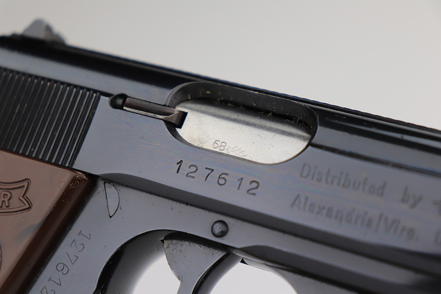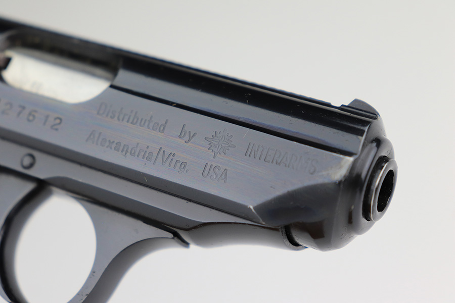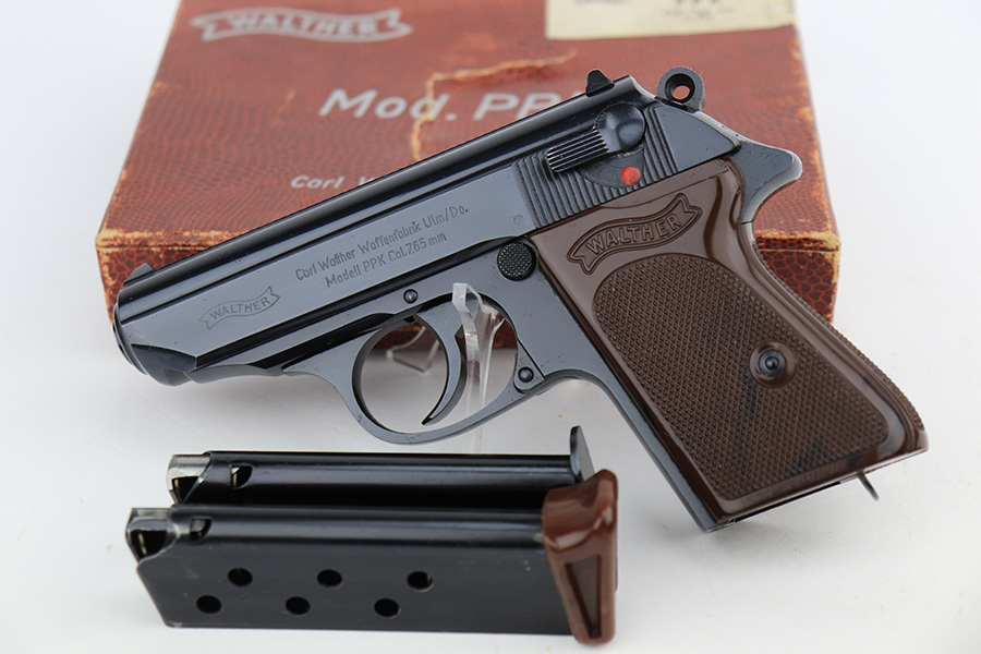 8/15/23 – This is a mint example of a Walther PPK, manufactured in 1968 and chambered in 7.65mm. All matching with the proper West German proofs. Interarms, VA import marking on the right side of the slide. Comes with a period-correct box and one spare flat-bottom magazine. The label on the box is torn, so we cannot tell if it was matching. The gun itself has retained essentially all of its original finish with no notable signs of wear. Excellent brown plastic grips with the American Eagle on the right side. Mint bore.