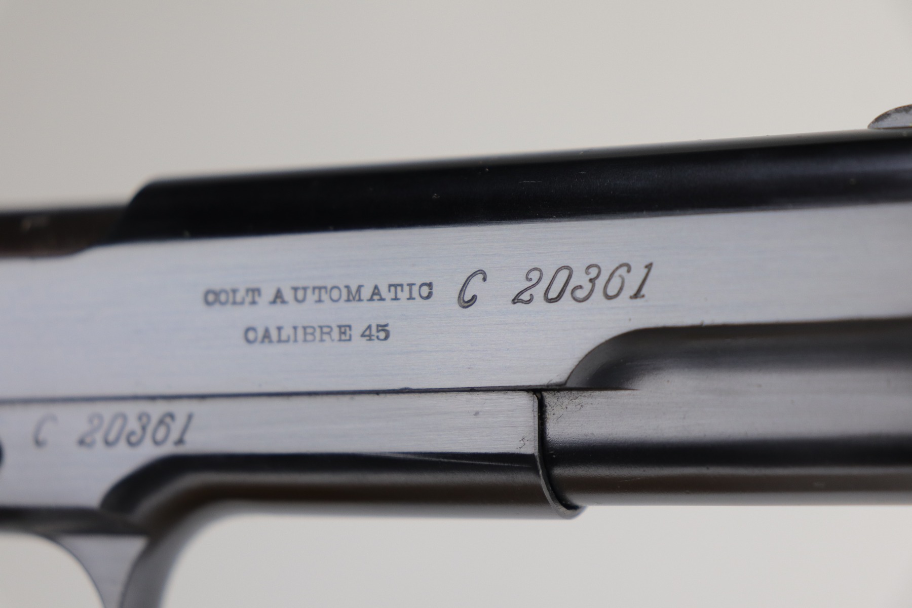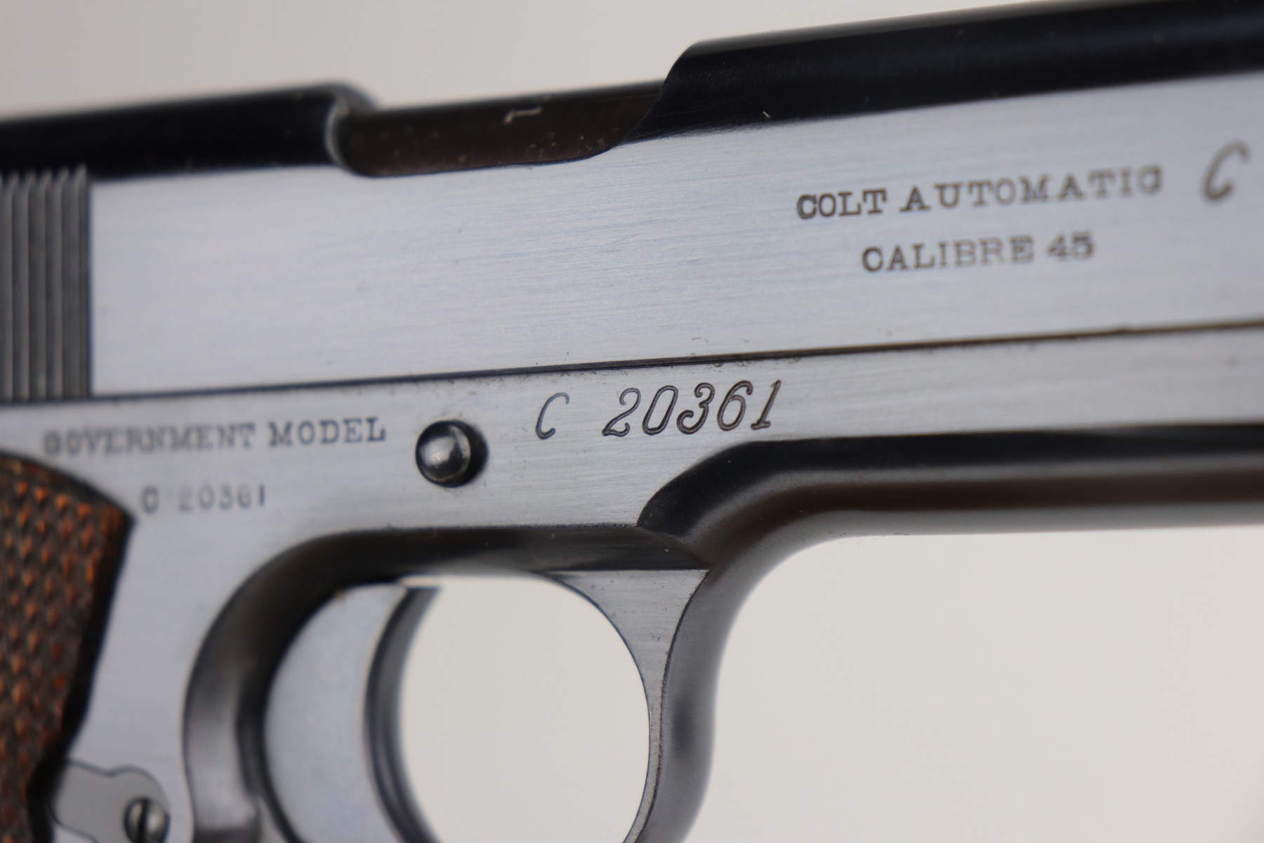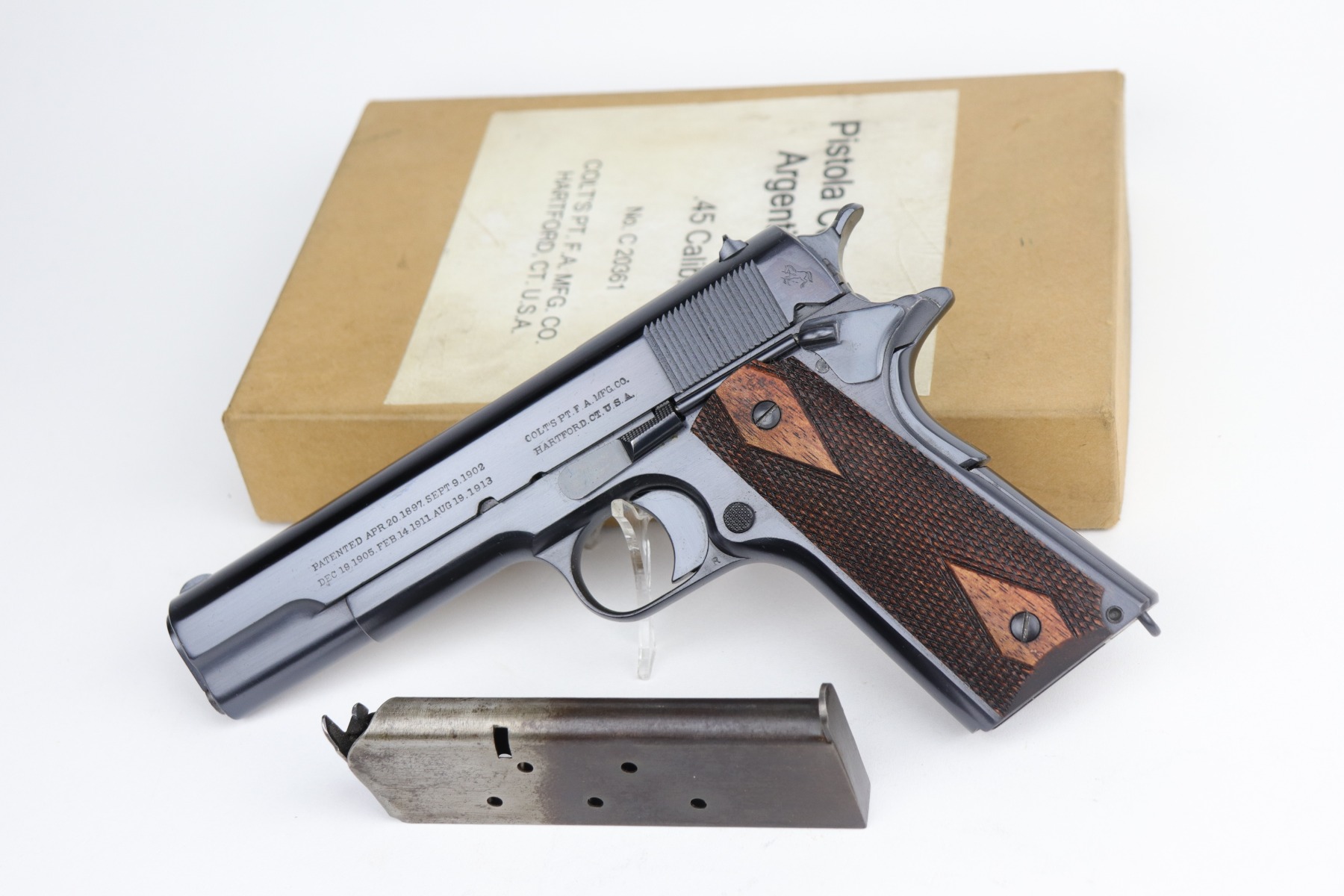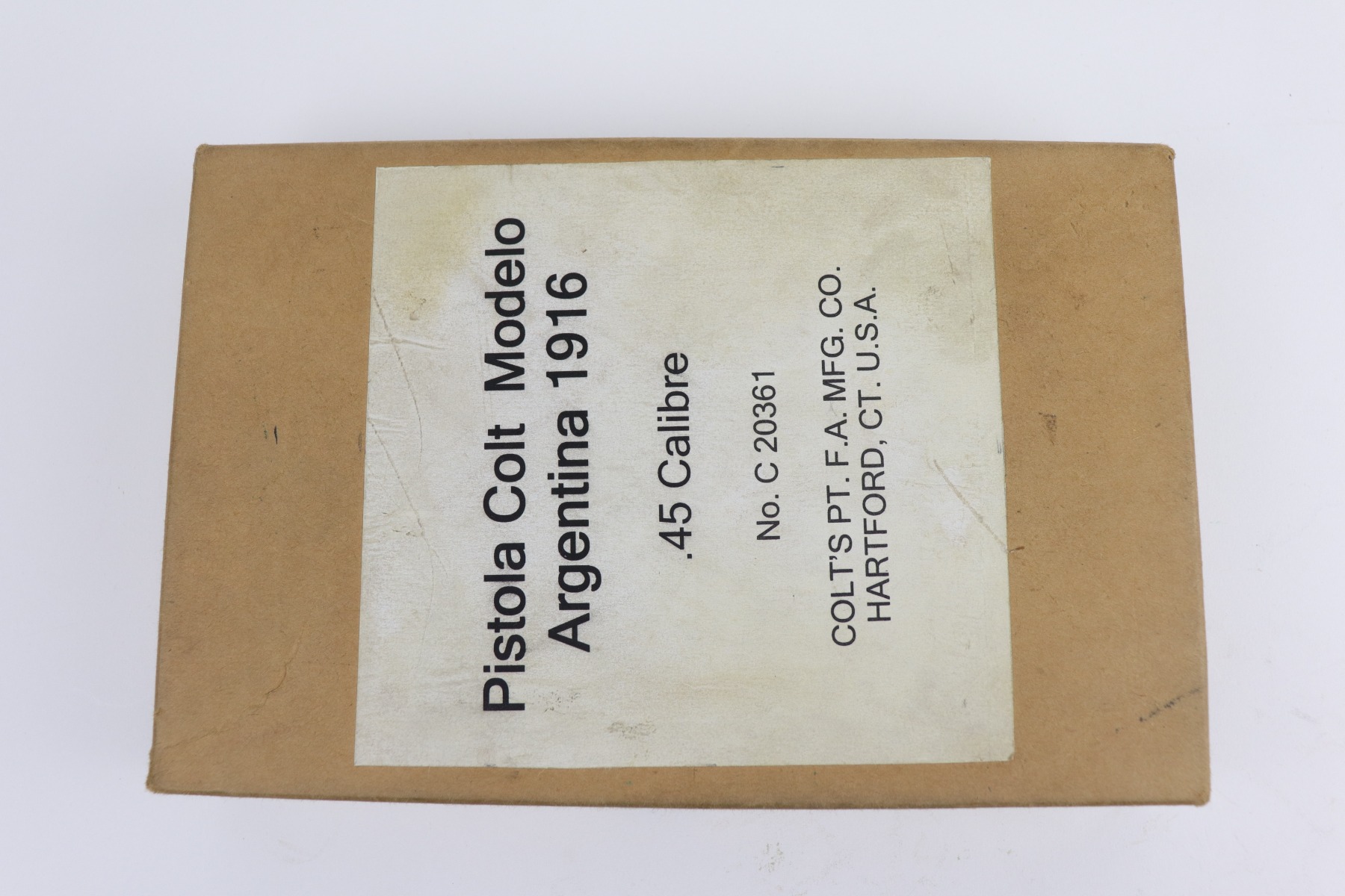 9/10/20 – This is a mint, in the original box, Colt 1911 Government Model manufactured in 1915 and purchased by the Argentine government. Between 1914 and 1941, the Argentine government ordered over 21,000 of these pistols from Colt for their army, navy, and police force. They ordered 1,000 consecutive guns from Colt in this particular serial range, C20001-C21000. This gun has matching Argentine numbering on the frame, slide, and ejection port. There is an Argentine proof on the top of the slide. It is in the correct range. This example is in like-new, mint condition. The bore has strong rifling, but there is light pin-pricking in the grooves – otherwise shiny. Mint grips. Comes with one period-correct magazine. It comes in the original box (numbered to the gun) with original wrapping paper.