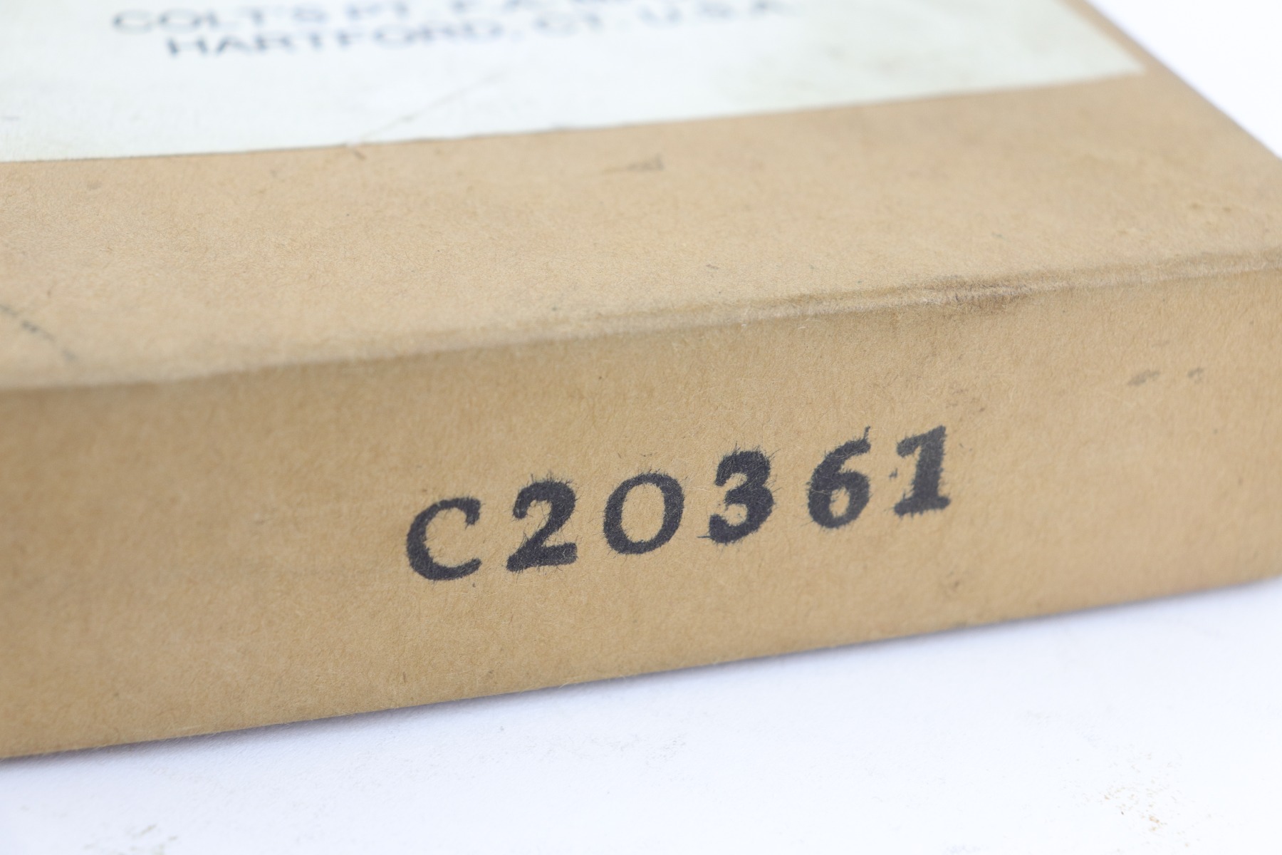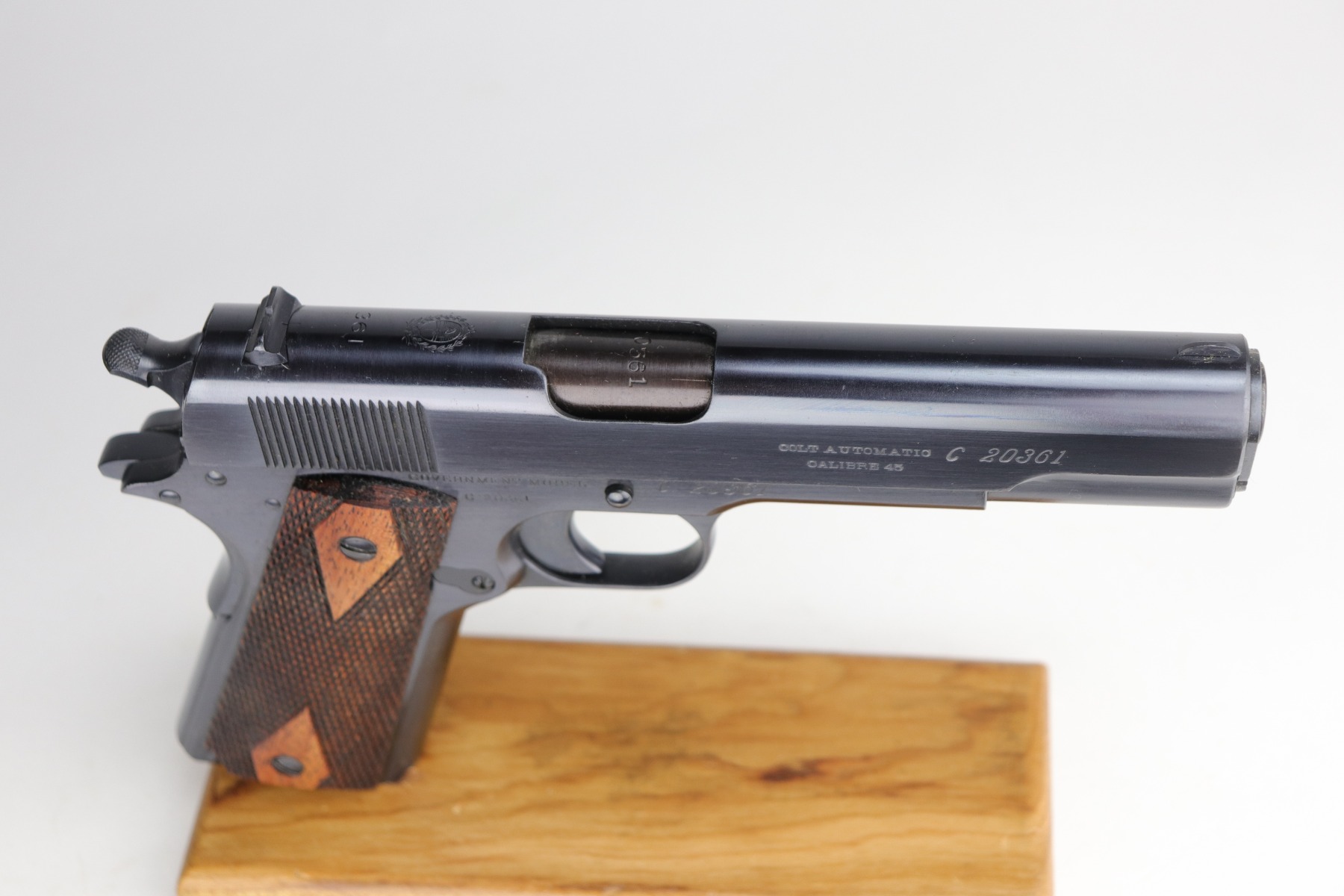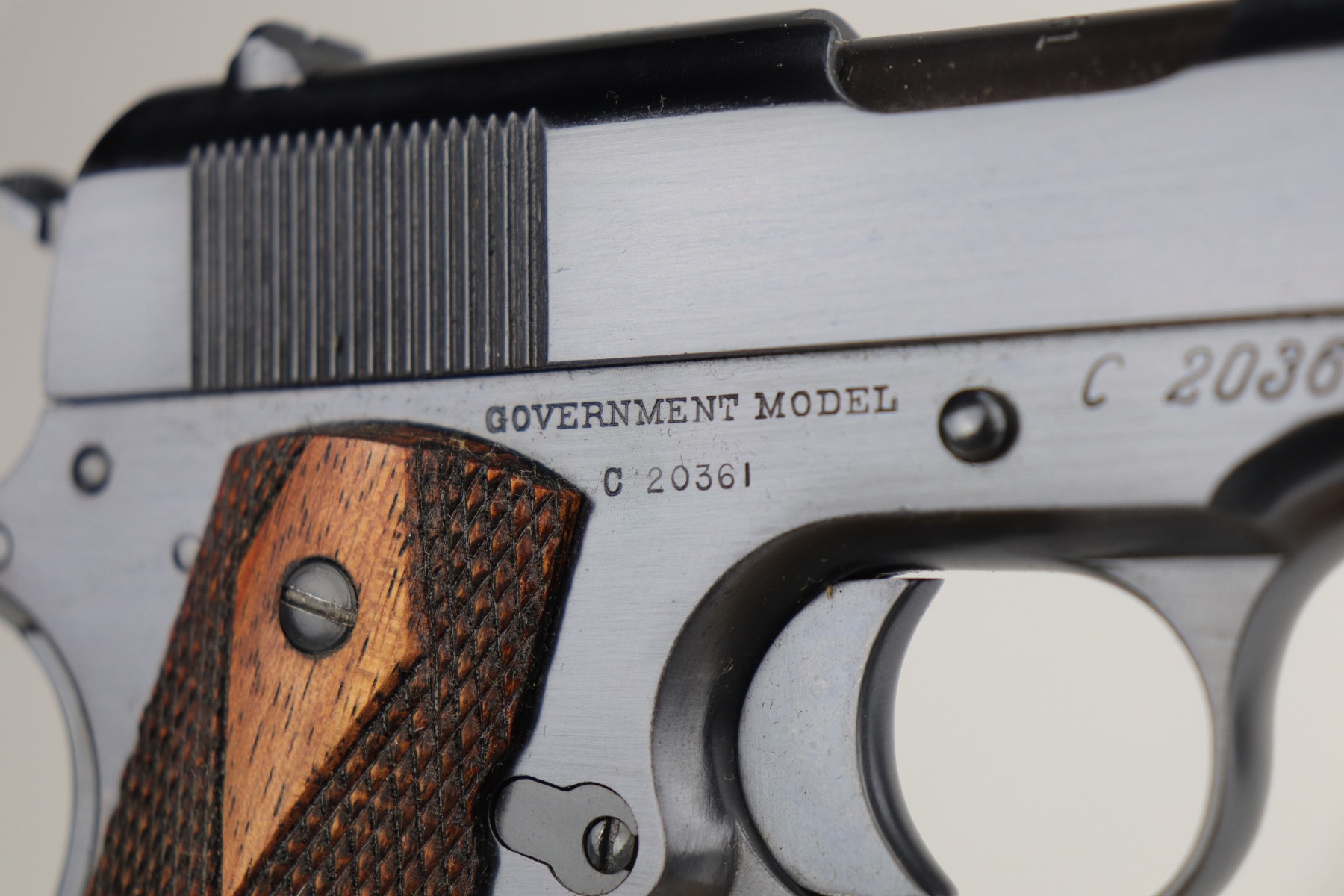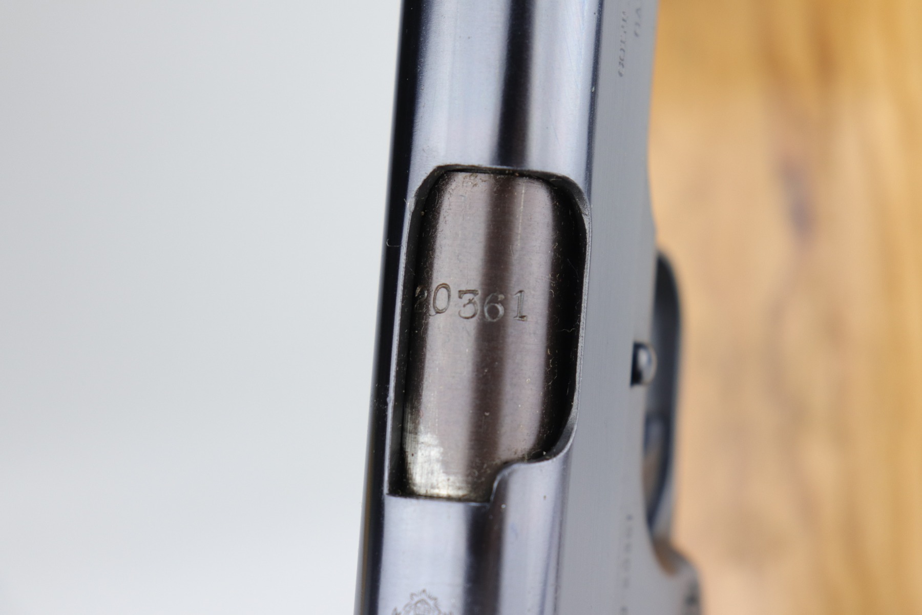 9/10/20 – This is a mint, in the original box, Colt 1911 Government Model manufactured in 1915 and purchased by the Argentine government. Between 1914 and 1941, the Argentine government ordered over 21,000 of these pistols from Colt for their army, navy, and police force. They ordered 1,000 consecutive guns from Colt in this particular serial range, C20001-C21000. This gun has matching Argentine numbering on the frame, slide, and ejection port. There is an Argentine proof on the top of the slide. It is in the correct range. This example is in like-new, mint condition. The bore has strong rifling, but there is light pin-pricking in the grooves – otherwise shiny. Mint grips. Comes with one period-correct magazine. It comes in the original box (numbered to the gun) with original wrapping paper.