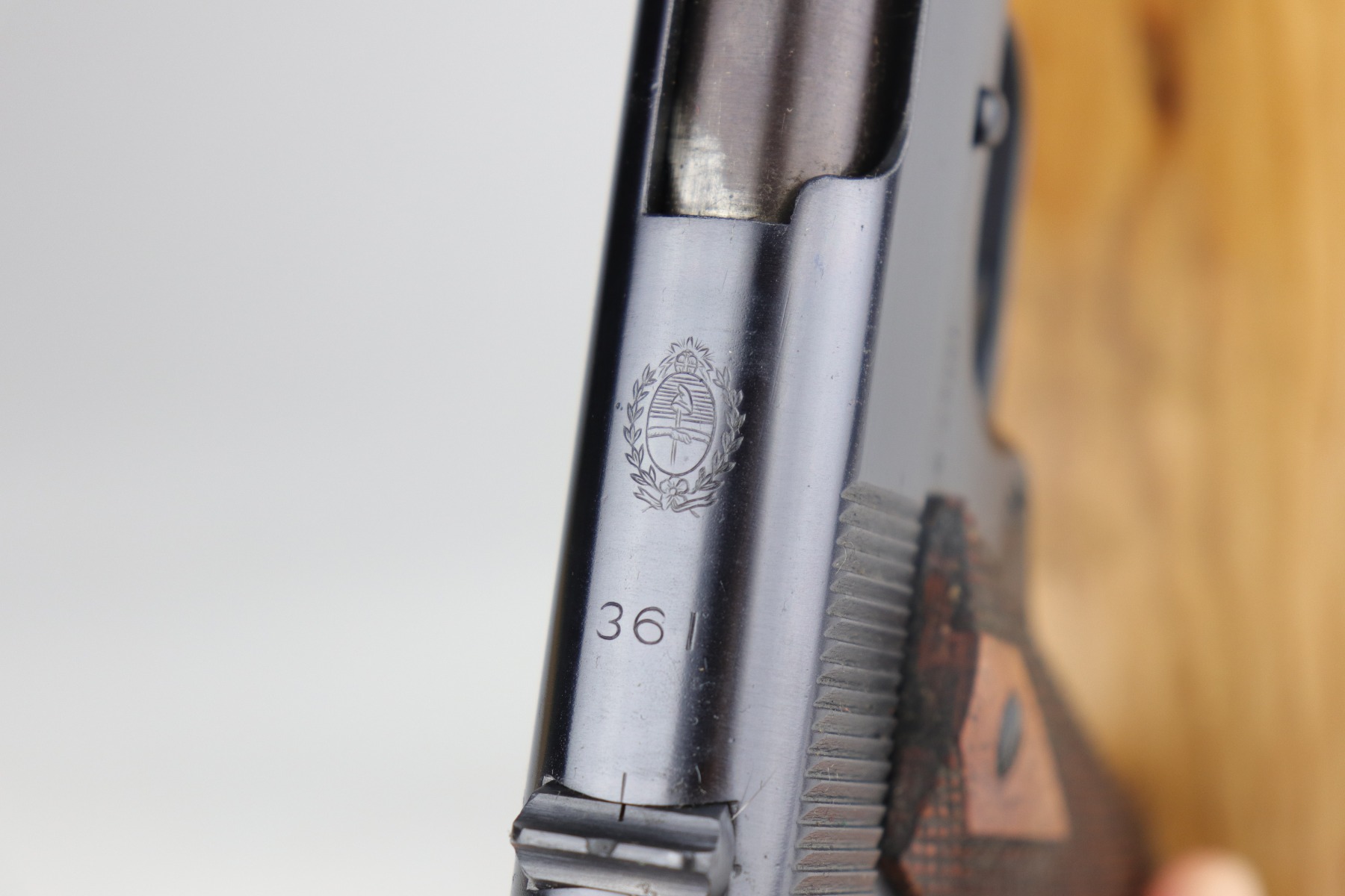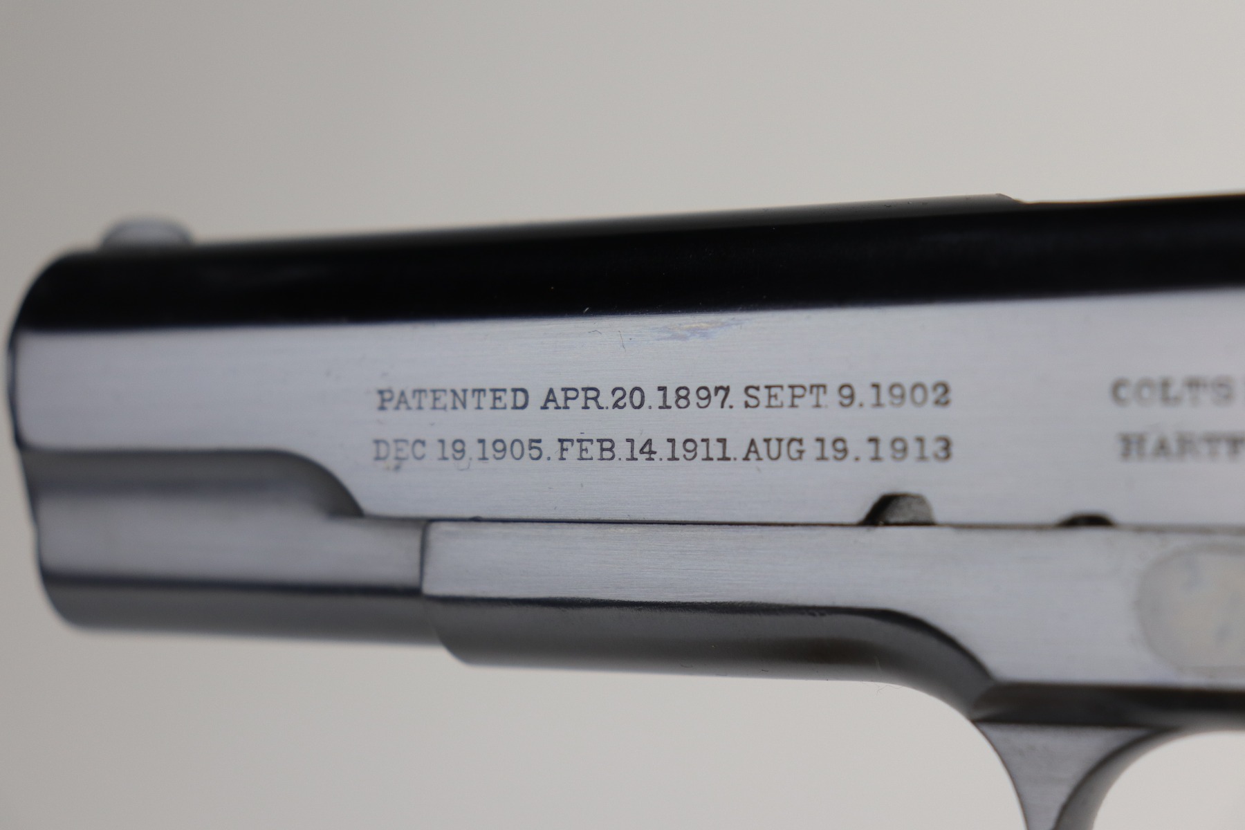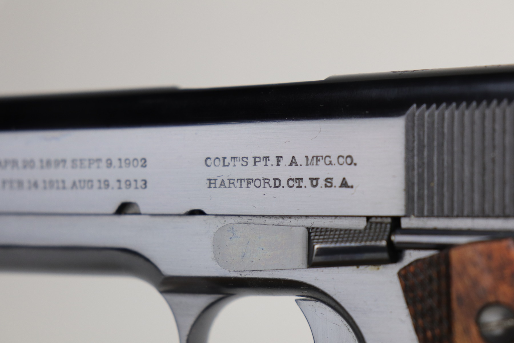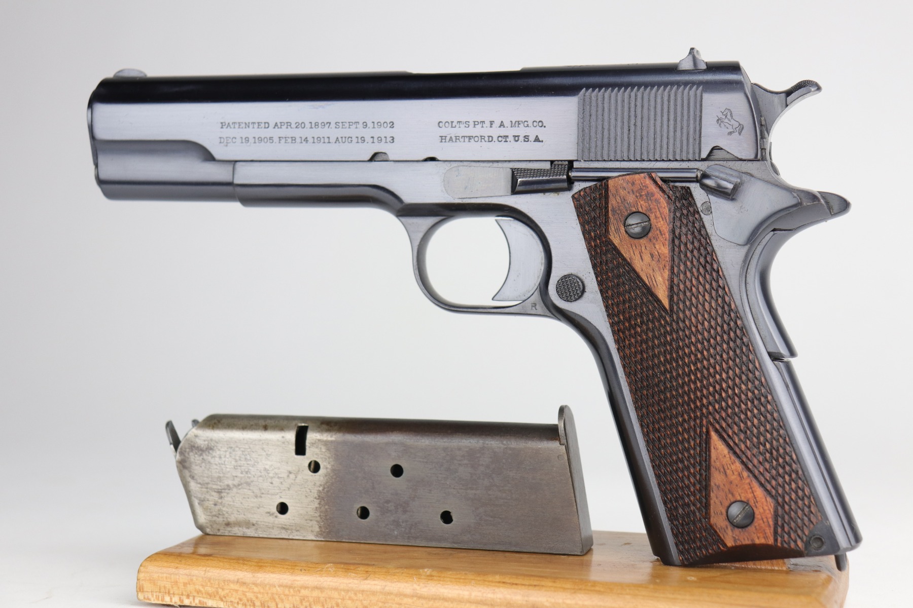 9/10/20 – This is a mint, in the original box, Colt 1911 Government Model manufactured in 1915 and purchased by the Argentine government. Between 1914 and 1941, the Argentine government ordered over 21,000 of these pistols from Colt for their army, navy, and police force. They ordered 1,000 consecutive guns from Colt in this particular serial range, C20001-C21000. This gun has matching Argentine numbering on the frame, slide, and ejection port. There is an Argentine proof on the top of the slide. It is in the correct range. This example is in like-new, mint condition. The bore has strong rifling, but there is light pin-pricking in the grooves – otherwise shiny. Mint grips. Comes with one period-correct magazine. It comes in the original box (numbered to the gun) with original wrapping paper.