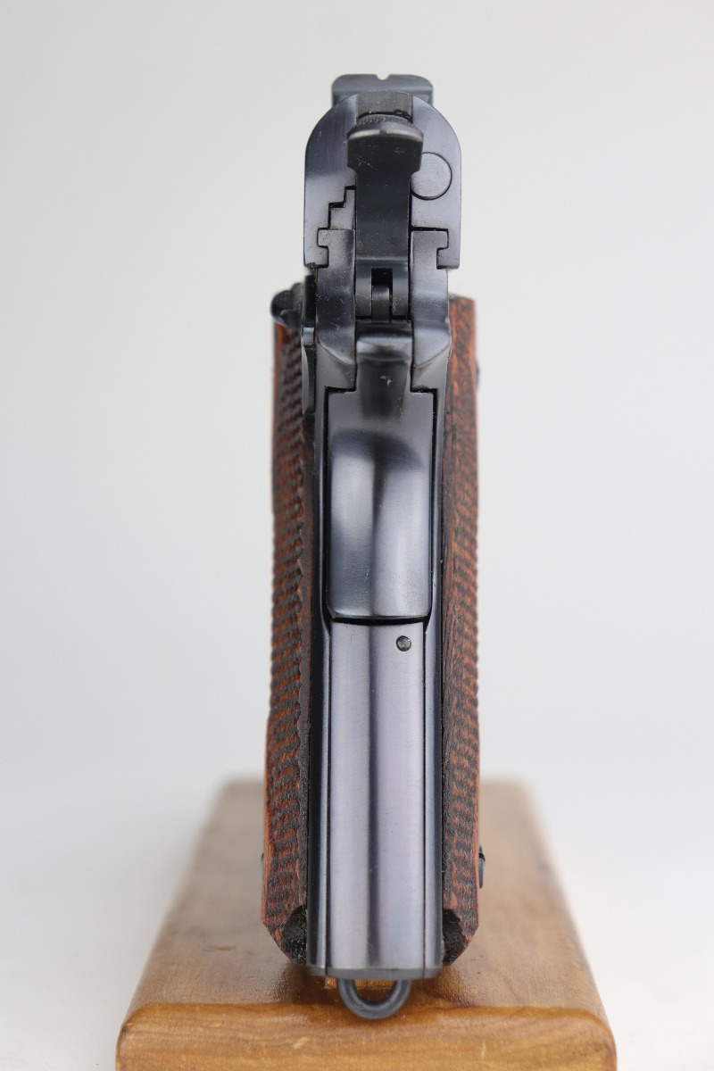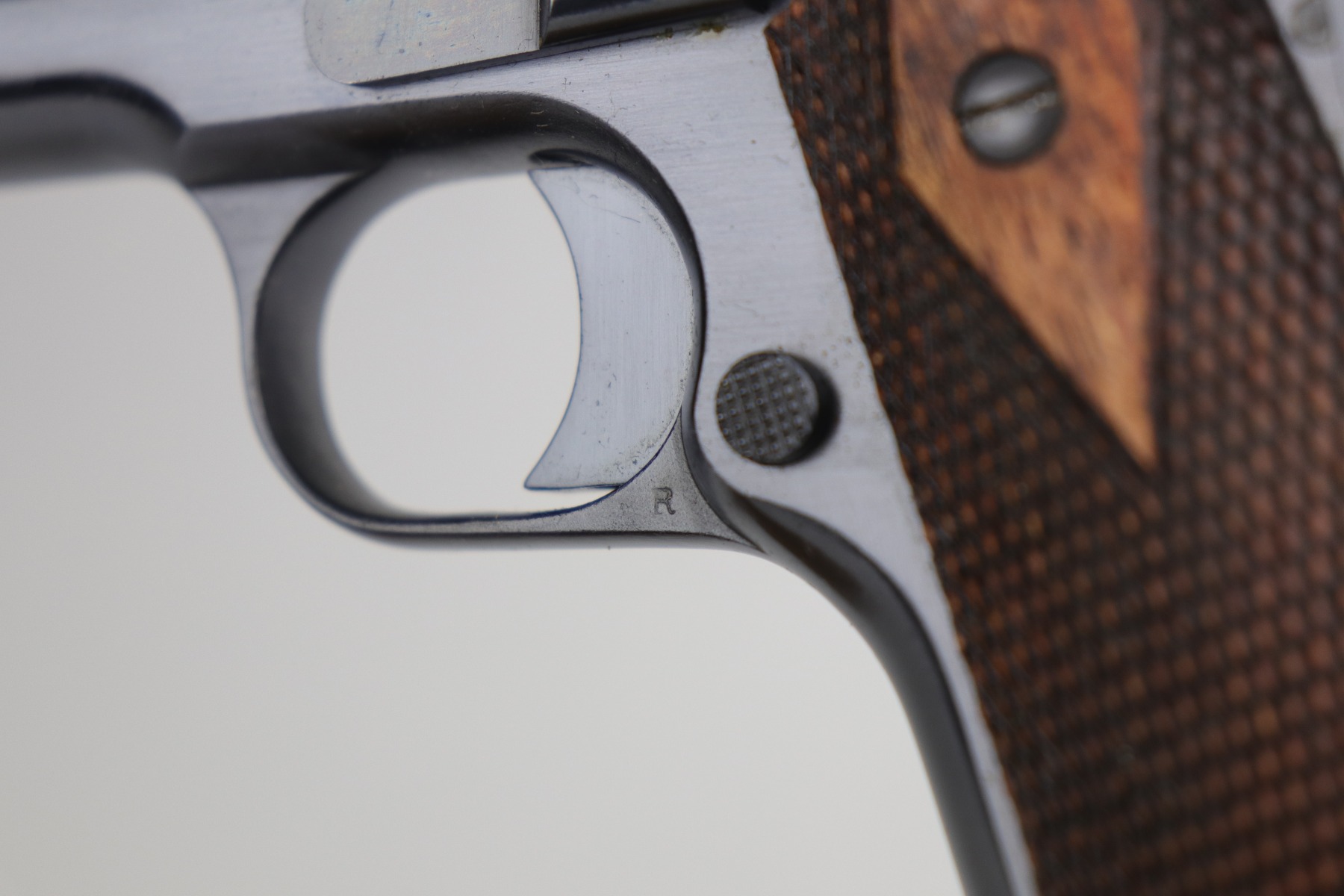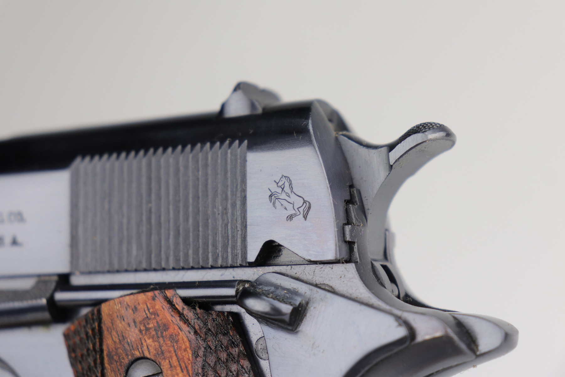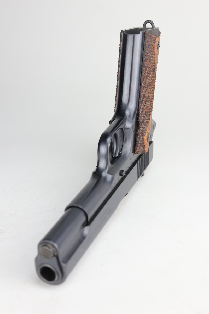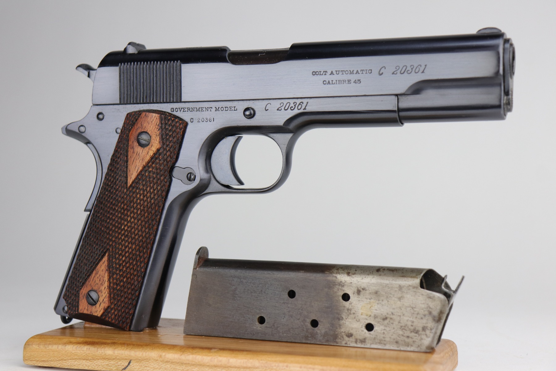 9/10/20 – This is a mint, in the original box, Colt 1911 Government Model manufactured in 1915 and purchased by the Argentine government. Between 1914 and 1941, the Argentine government ordered over 21,000 of these pistols from Colt for their army, navy, and police force. They ordered 1,000 consecutive guns from Colt in this particular serial range, C20001-C21000. This gun has matching Argentine numbering on the frame, slide, and ejection port. There is an Argentine proof on the top of the slide. It is in the correct range. This example is in like-new, mint condition. The bore has strong rifling, but there is light pin-pricking in the grooves – otherwise shiny. Mint grips. Comes with one period-correct magazine. It comes in the original box (numbered to the gun) with original wrapping paper.