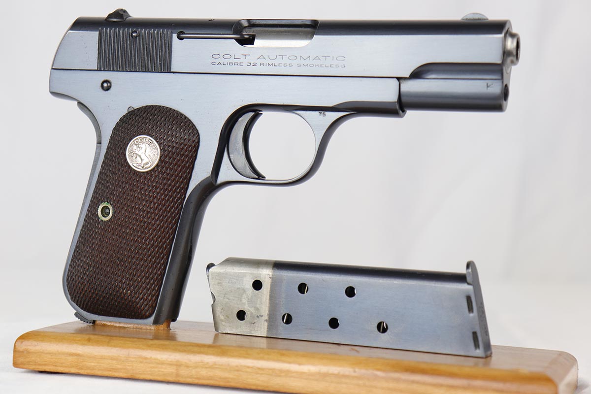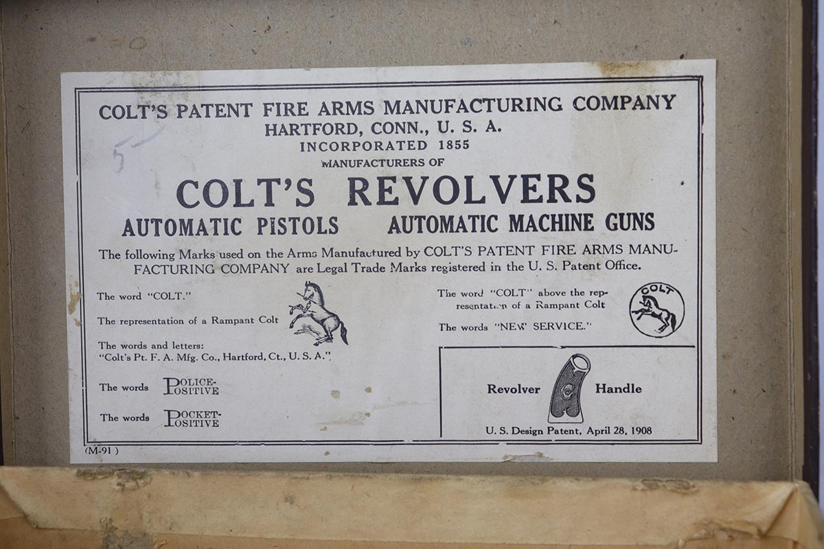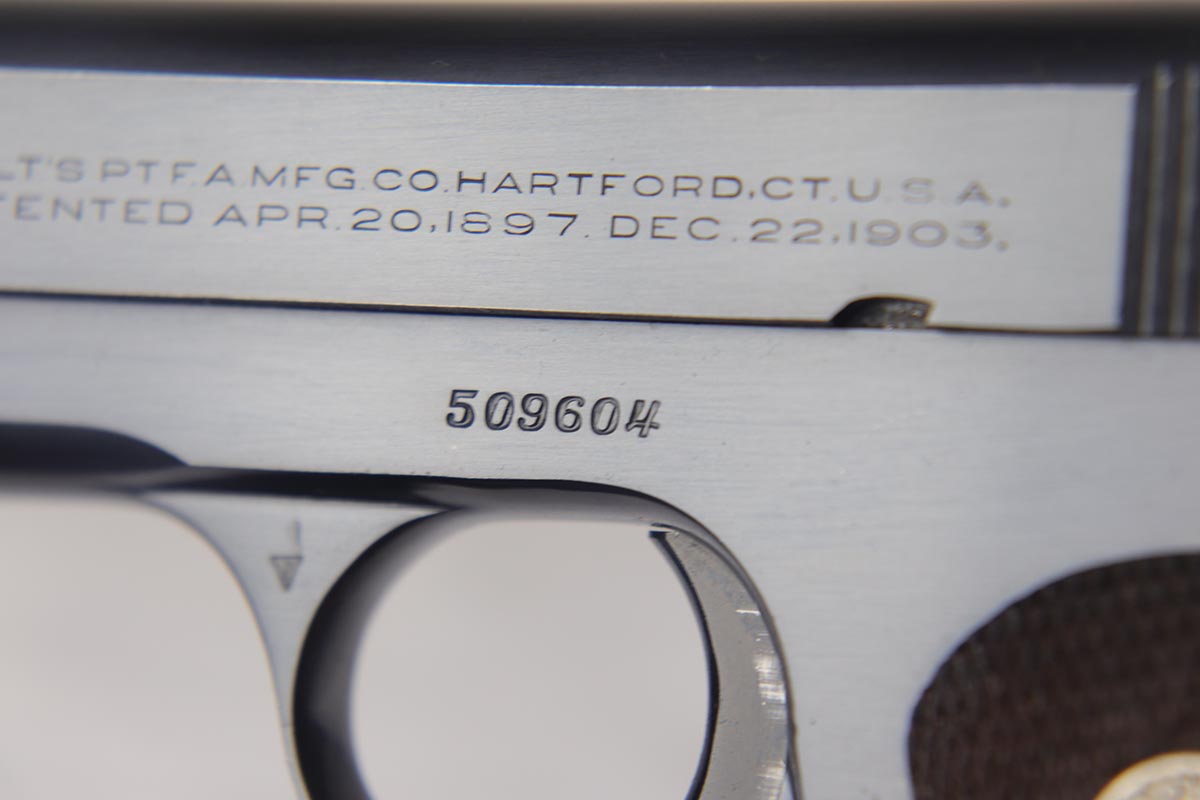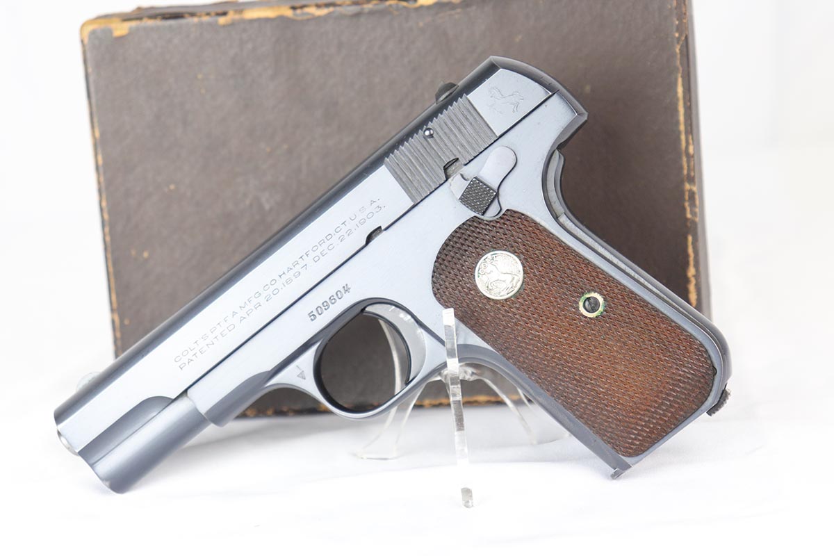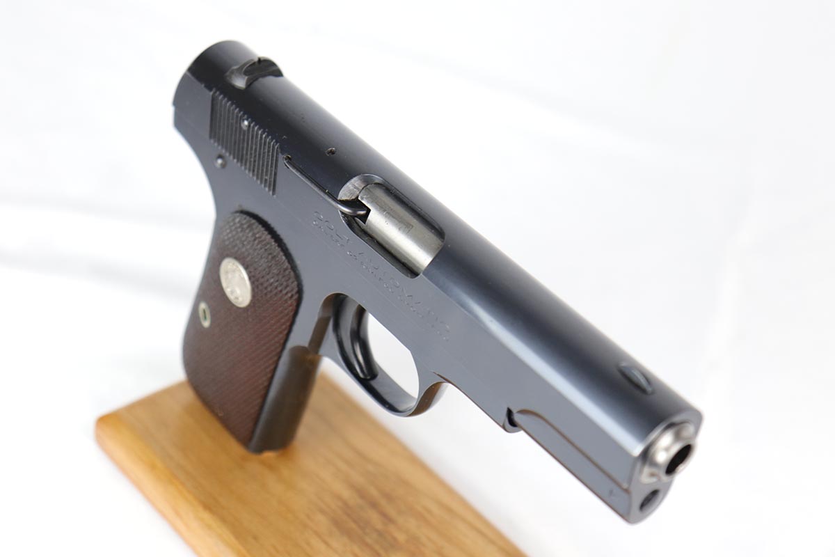 8/3/18 – This is a mint Colt M1903 pistol in the original box. It was manufactured in 1931 and chambered for .32 rimless smokeless. The pistols shows only the slightest edge wear from rubbing against the edge of the box, but the high-polish finish is otherwise beautiful and nearly flawless. The box is in very good condition, showing only minor edge fraying. Pistol grips are excellent, as is the magazine. Minty bore.