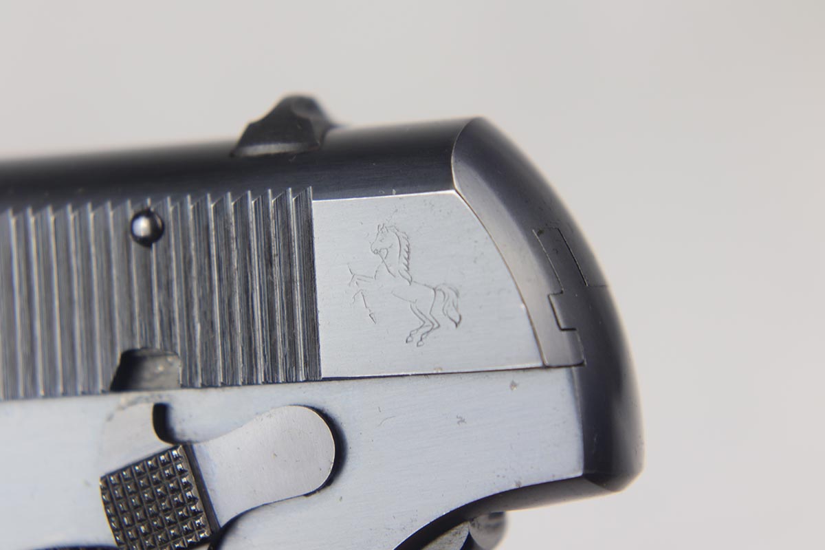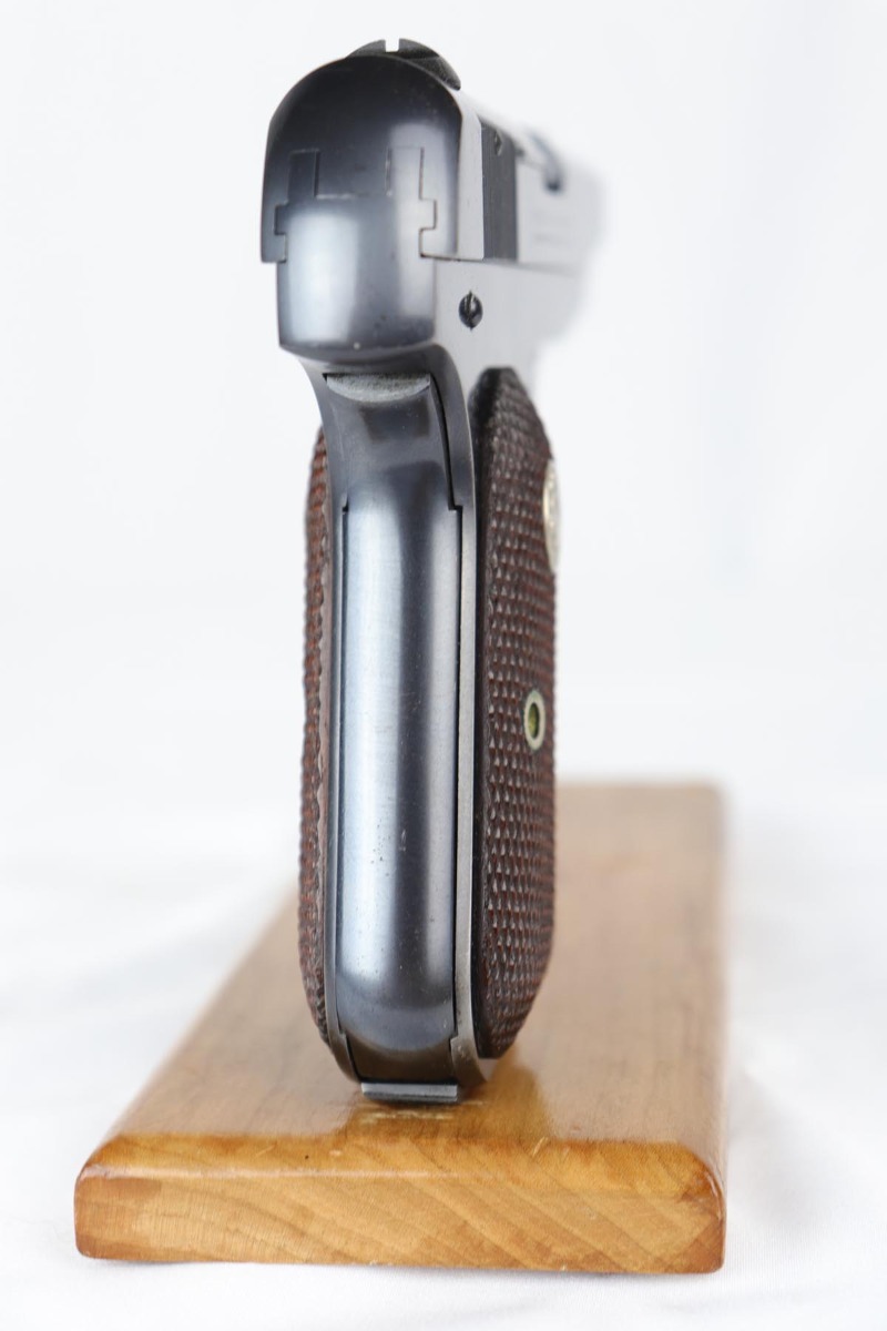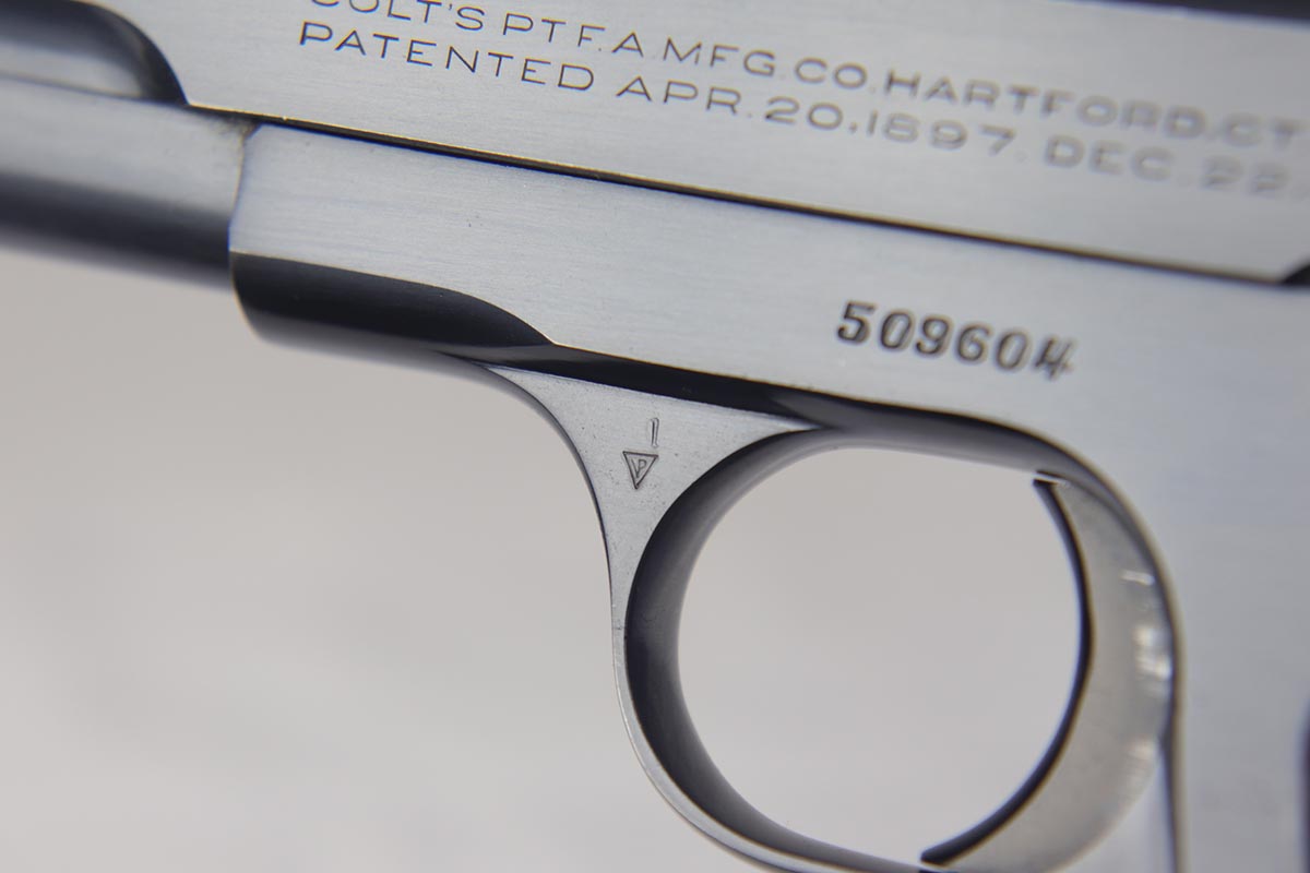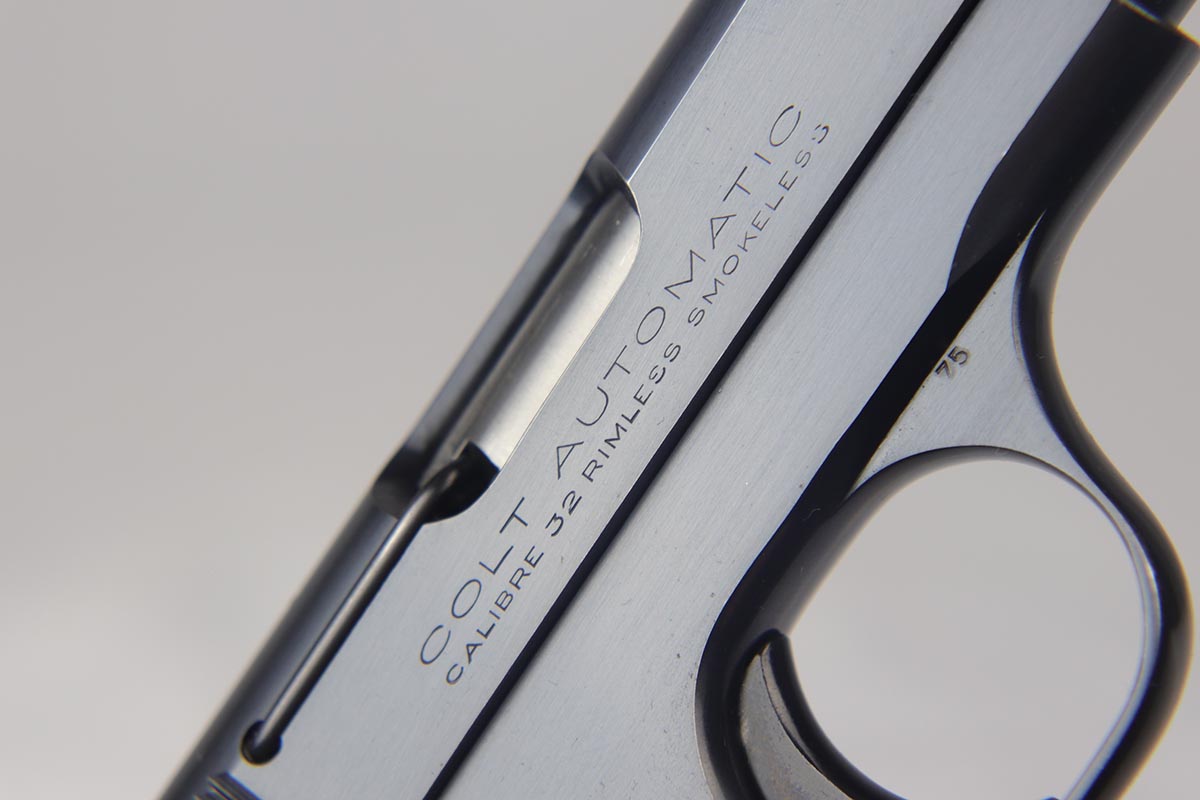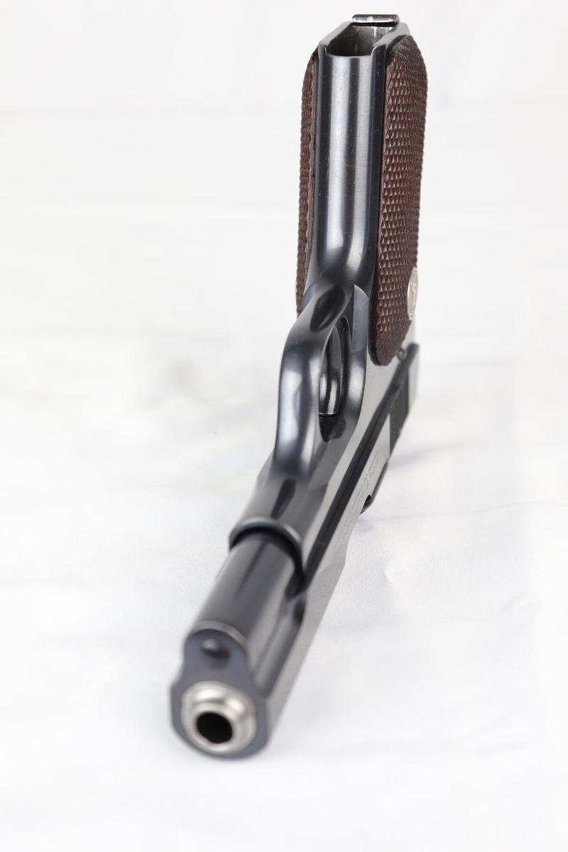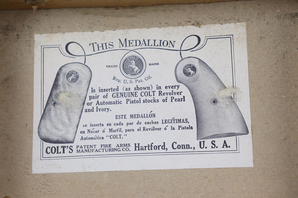 8/3/18 – This is a mint Colt M1903 pistol in the original box. It was manufactured in 1931 and chambered for .32 rimless smokeless. The pistols shows only the slightest edge wear from rubbing against the edge of the box, but the high-polish finish is otherwise beautiful and nearly flawless. The box is in very good condition, showing only minor edge fraying. Pistol grips are excellent, as is the magazine. Minty bore.
